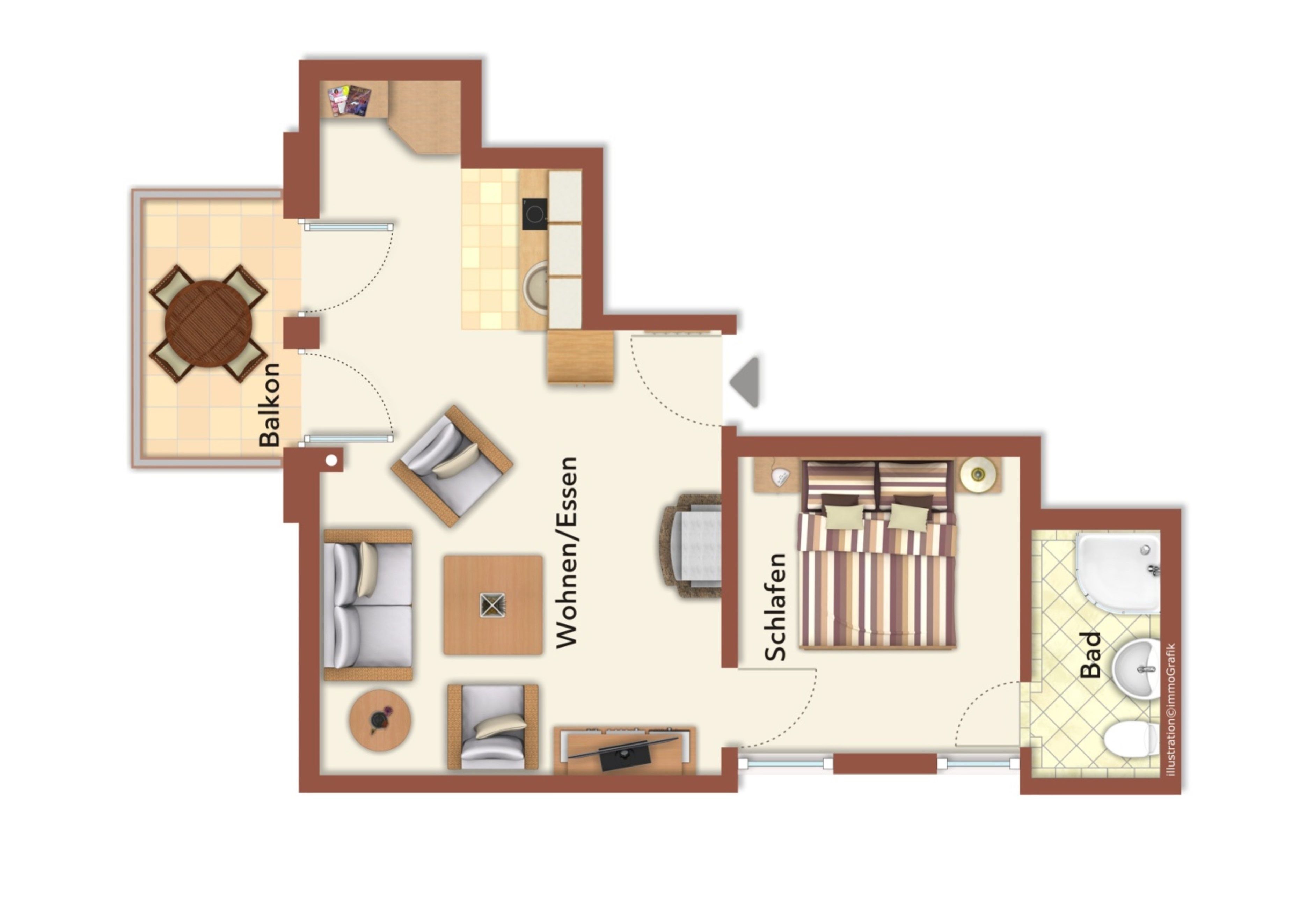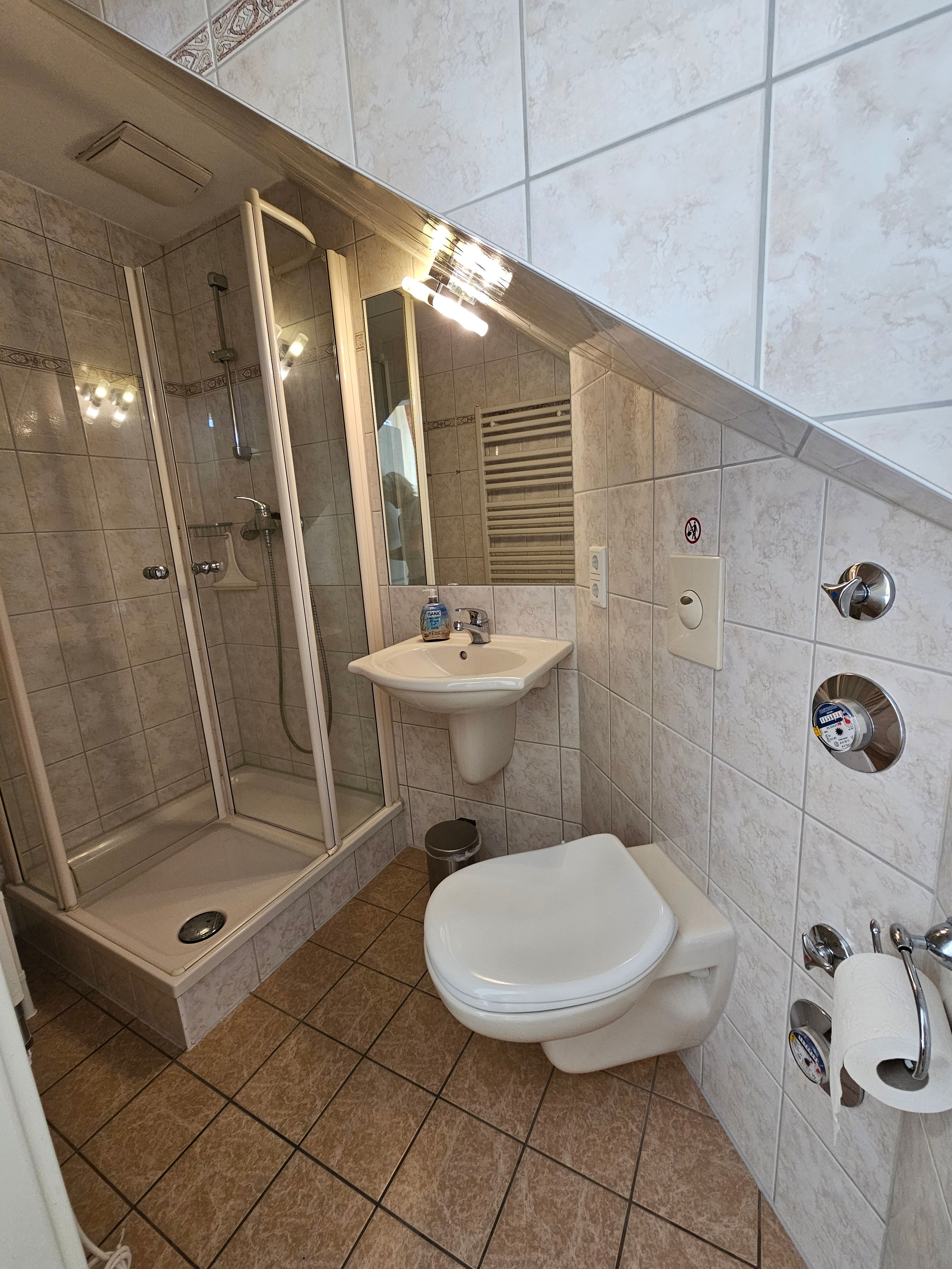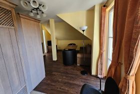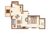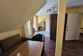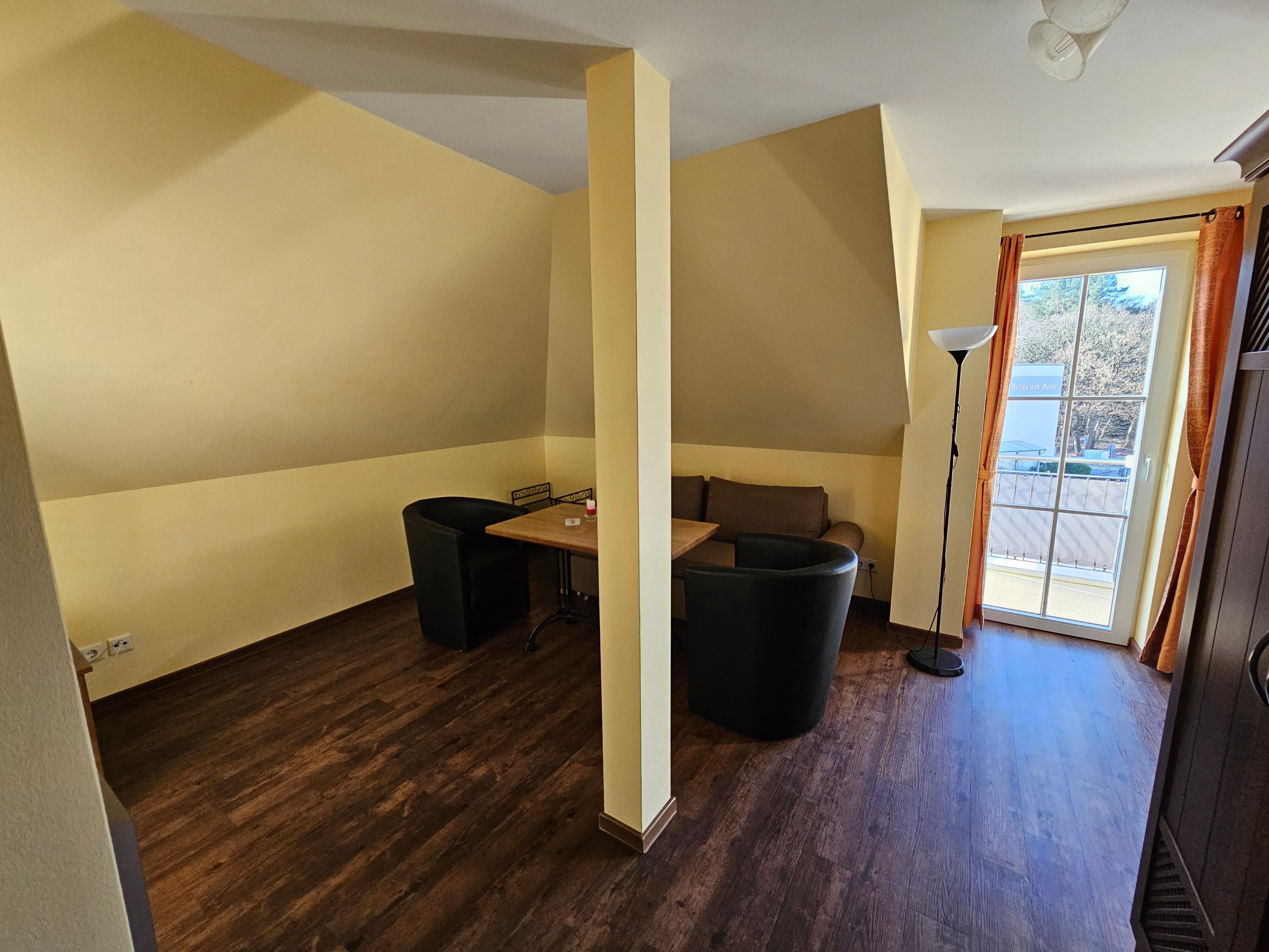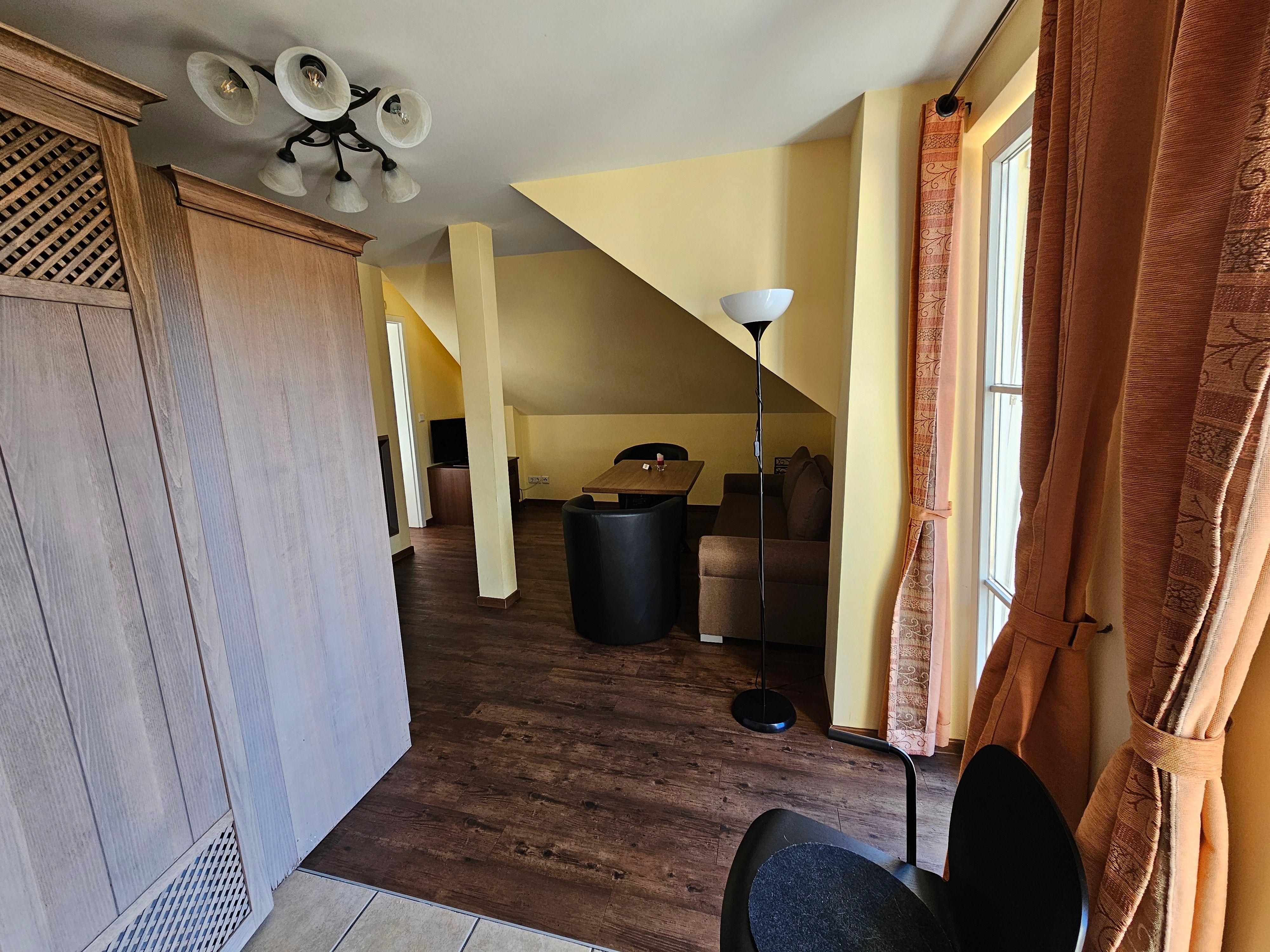 Das attraktive Ferienappartement im 2.OG besteht aus einem Schlaf- und einem Wohnraum mit Kamin und Balkon. Aus dem Schalfzimmer hat man teilweise einen Blick auf die Ostsee. Die Küche ist ausgestattet mit Geschirrspüler, Herd mit Ceranfeld, Mikrowelle mit Grill- und Backfunktion, Kühlschrank, Toaster und Kaffeemaschine. Im Wohnraum befindet sich ein Mediencenter mit SAT-TV, Radio und DVD-Spieler. Sie können die Mahlzeiten entweder im Restaurant im EG oder auf dem eigenen Balkon genießen. Neben dem Doppelbett im Schlafzimmer kann die Schlafcouch im Wohnzimmer zur Aufbettung genutzt werden. Der Boden ist mit Fußbodenheizung ausgestattet und mit Design-Vinyl Bodenbelag oder Fliesen belegt.