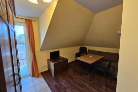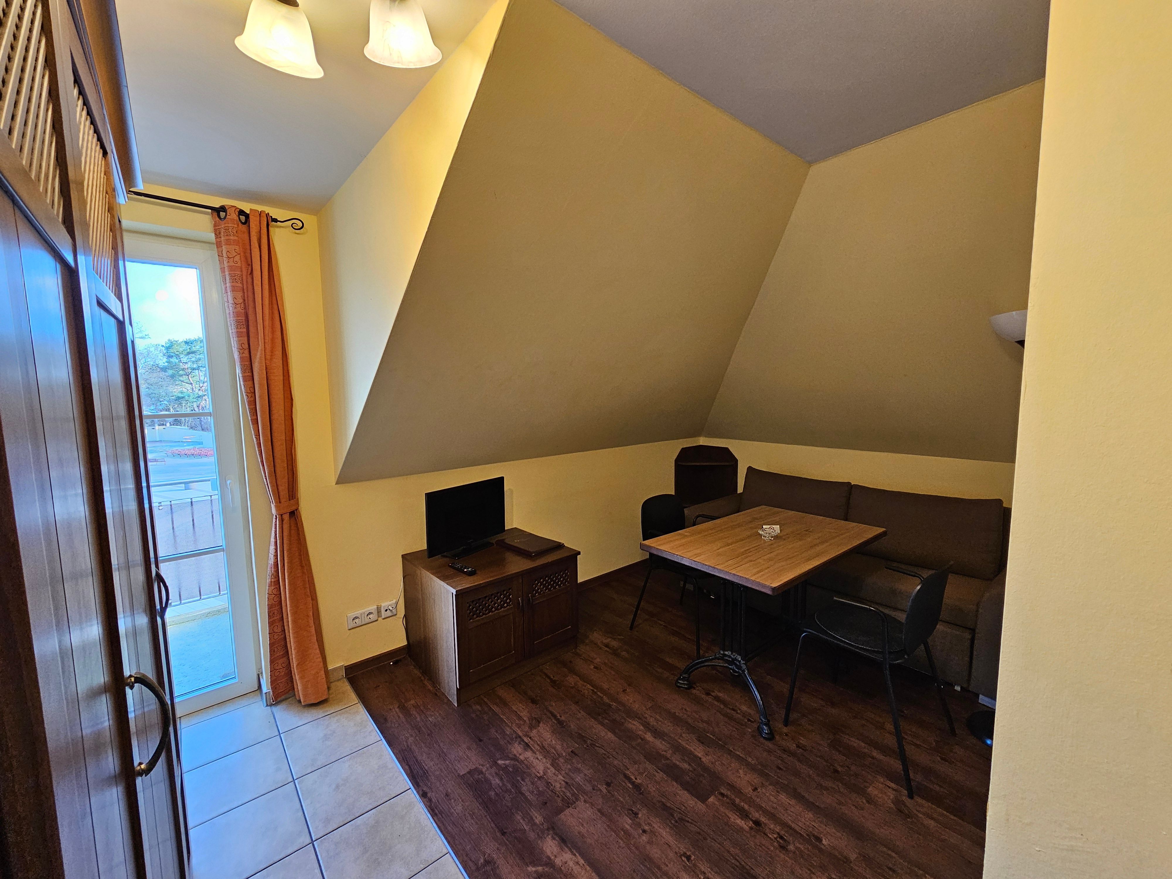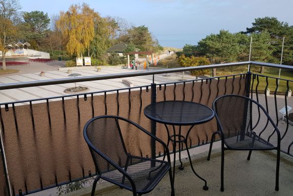 Das attraktive Ferienappartement im 2.OG besteht aus einem Schlaf- und einem Wohnraum mit Balkon. Vom Balkon hat man einen herrlichen Blick auf die Ostsee. Die Küche ist ausgestattet mit Geschirrspüler, Herd mit Ceranfeld, Mikrowelle mit Grill- und Backfunktion, Kühlschrank, Toaster und Kaffeemaschine. Im Wohnraum befindet sich ein Mediencenter mit SAT-TV, Radio und DVD-Spieler. Sie können die Mahlzeiten entweder im Restaurant im EG oder auf dem eigenen Balkon mit Blick auf die Ostsee genießen. Der Boden ist mit Fußbodenheizung ausgestattet und mit Design-Vinyl Bodenbelag oder Fliesen belegt.