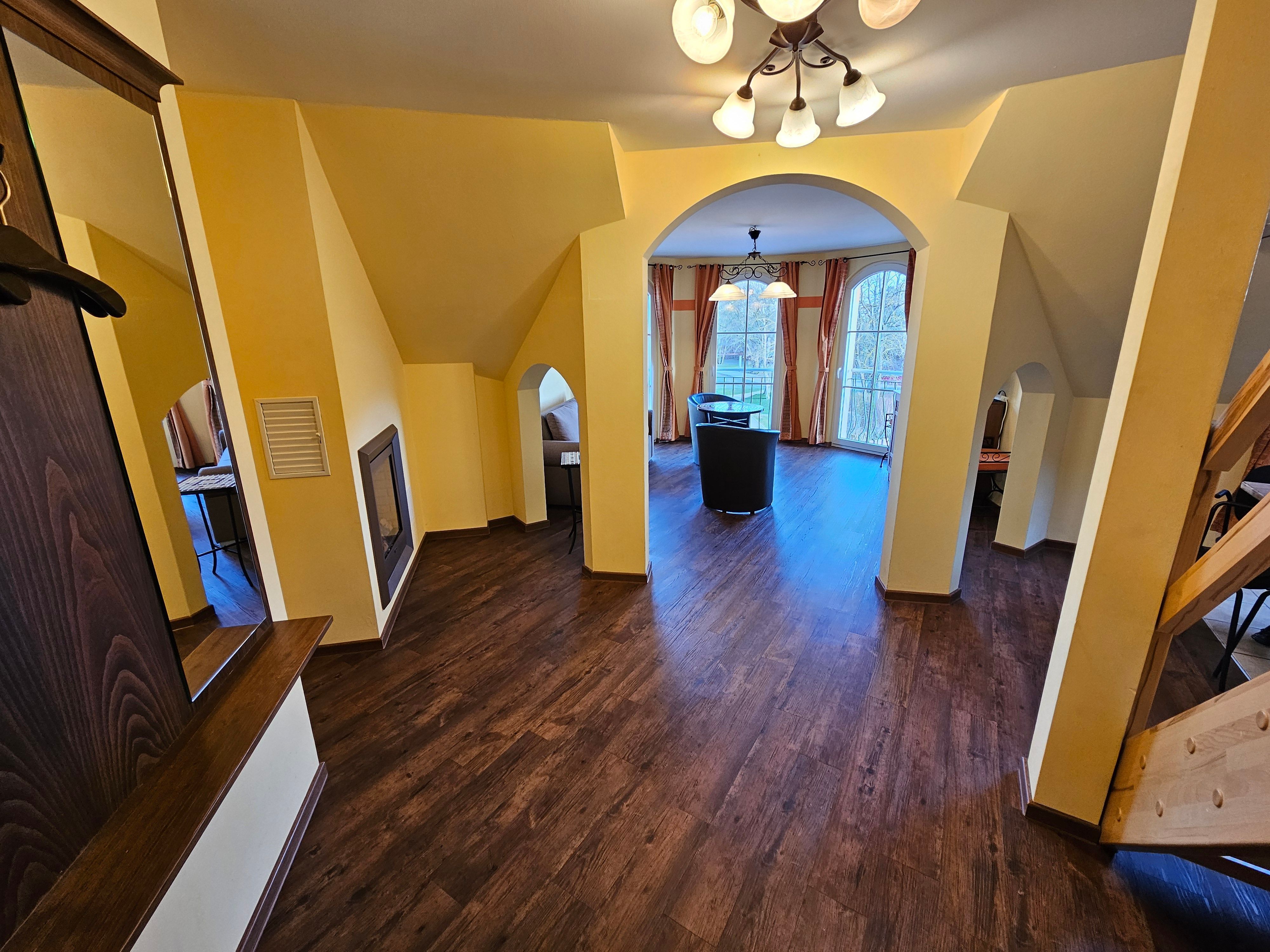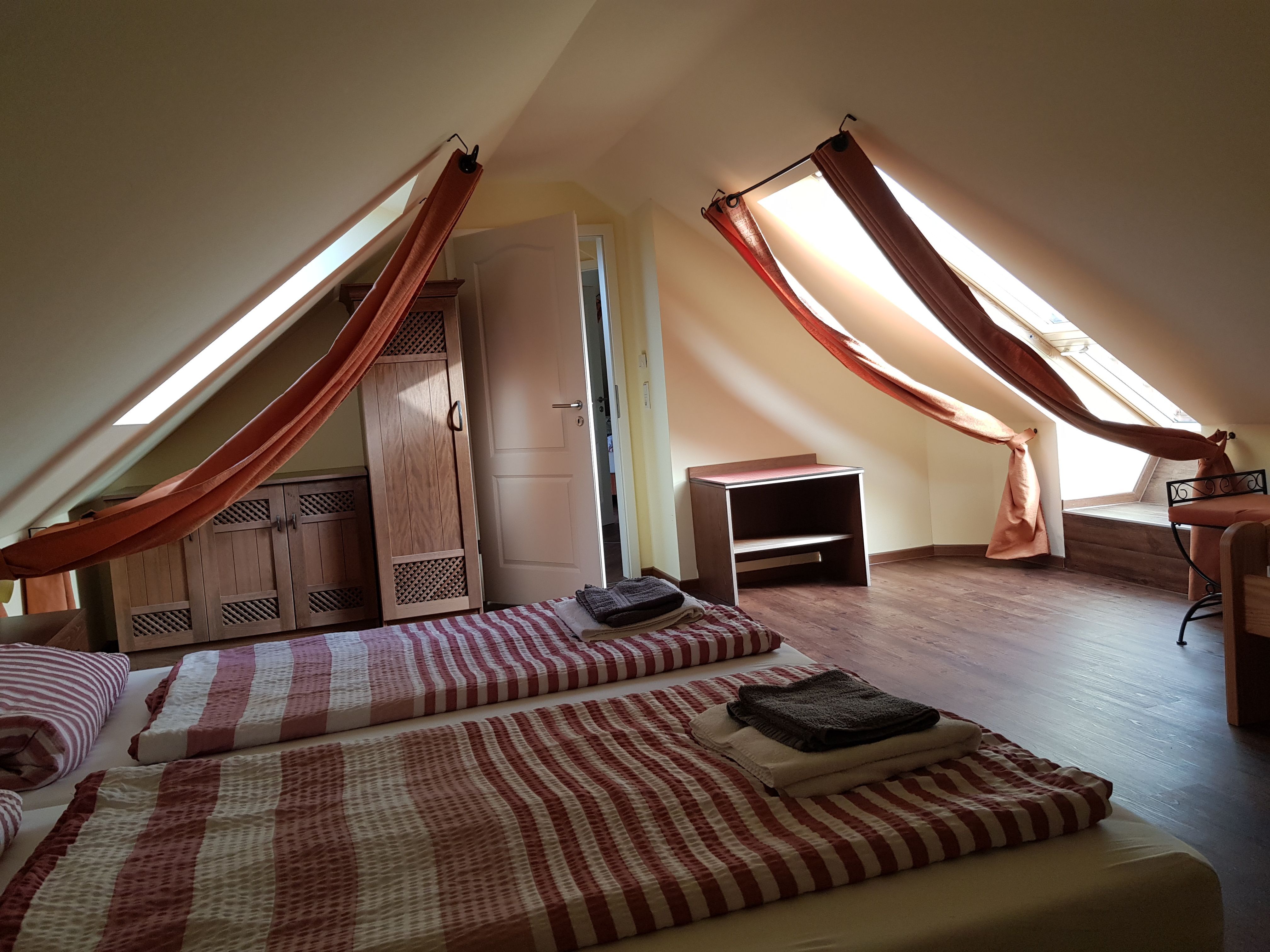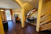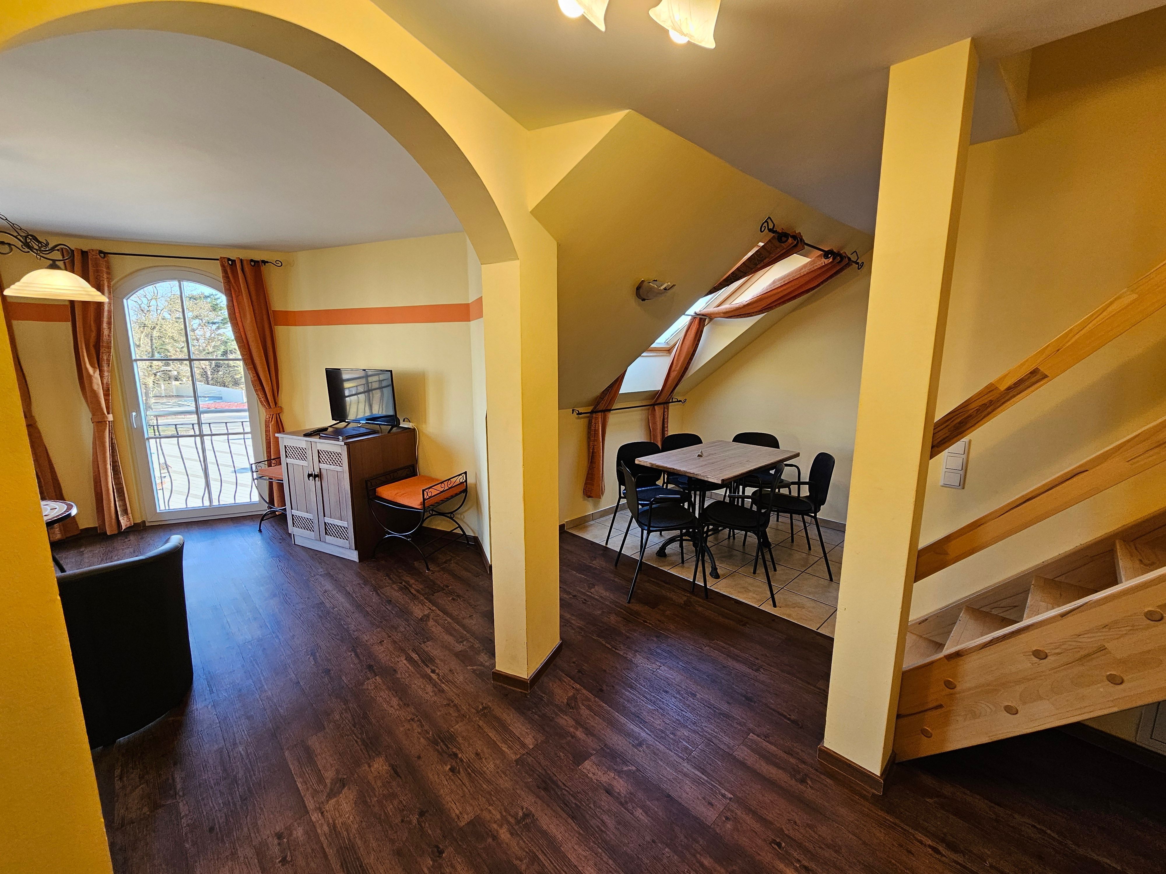 Das attraktive Ferienappartement im 2.OG besteht aus 2 Maisonette- Schlafräumen und einem großzügigen Wohnraum mit Kamin und Erker. Vom Erker und von den beiden Schlafräumen aus den ausklappbaren Cabrio-Dachfenstern hat man einen herrlichen Blick auf die Ostsee. Die Küche ist ausgestattet mit Geschirrspüler, Herd mit Ceranfeld, Mikrowelle mit Grill- und Backfunktion, Kühlschrank, Toaster und Kaffeemaschine. Im Wohnraum befindet sich ein Mediencenter mit SAT-TV, Radio und DVD-Spieler. Sie können die Mahlzeiten entweder im Restaurant im EG oder im Erker genießen. Neben den beiden Doppelbetten und dem einen Einzelbett in den Schlafzimmern kann die Schlafcouch im Wohnzimmer zur Aufbettung genutzt werden. Der Boden ist mit Fußbodenheizung ausgestattet und mit Design-Vinyl Bodenbelag oder Fliesen belegt.