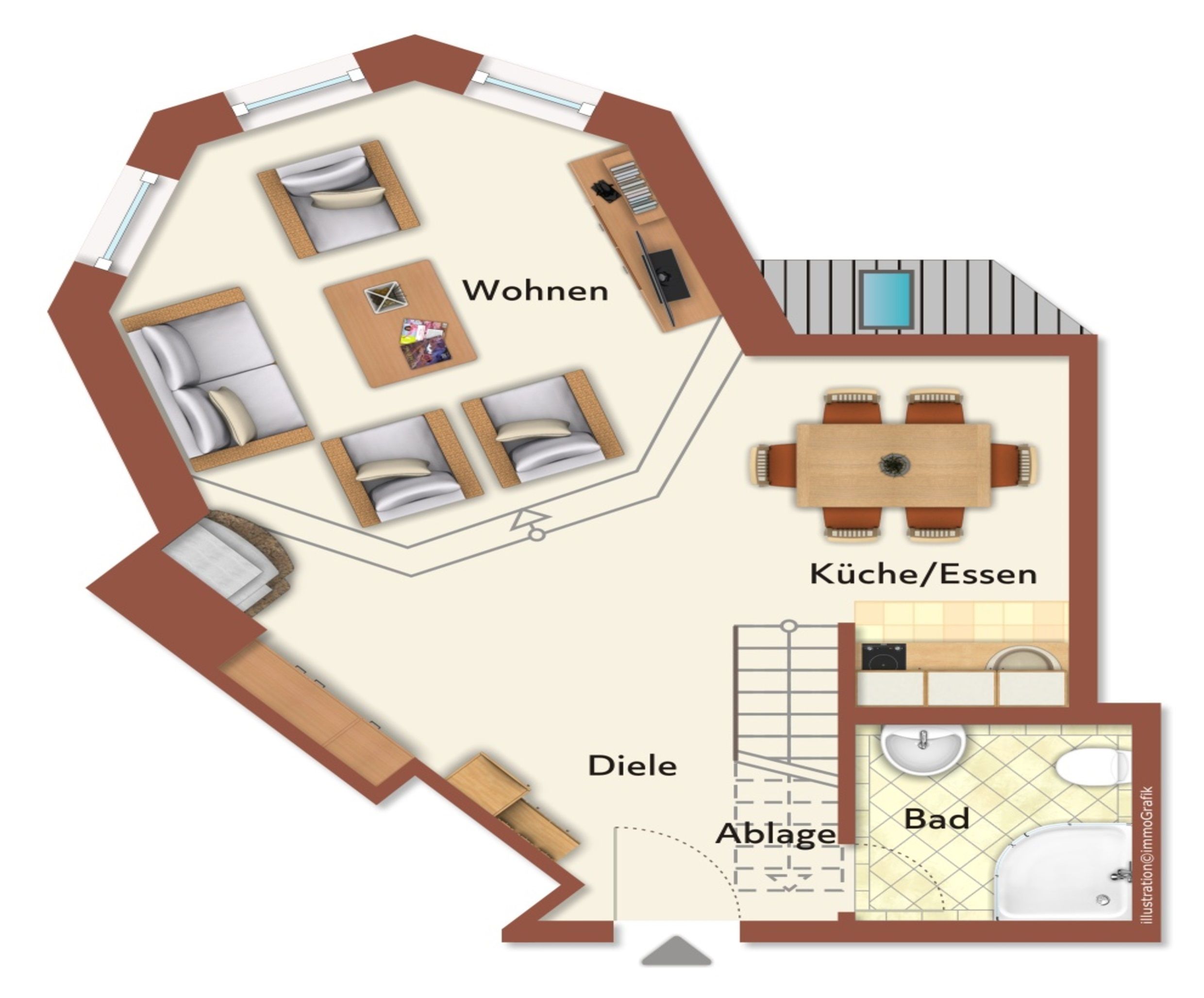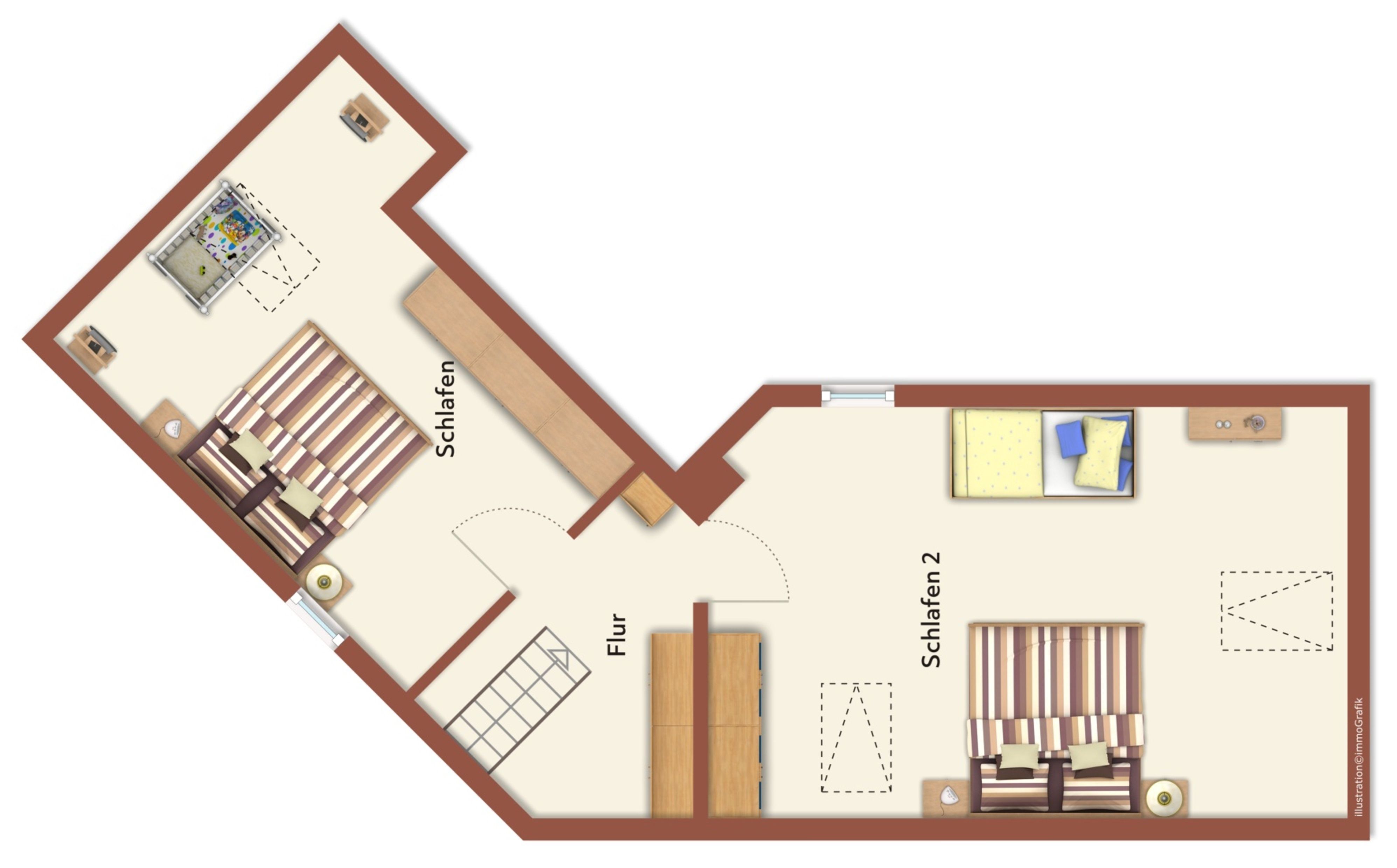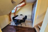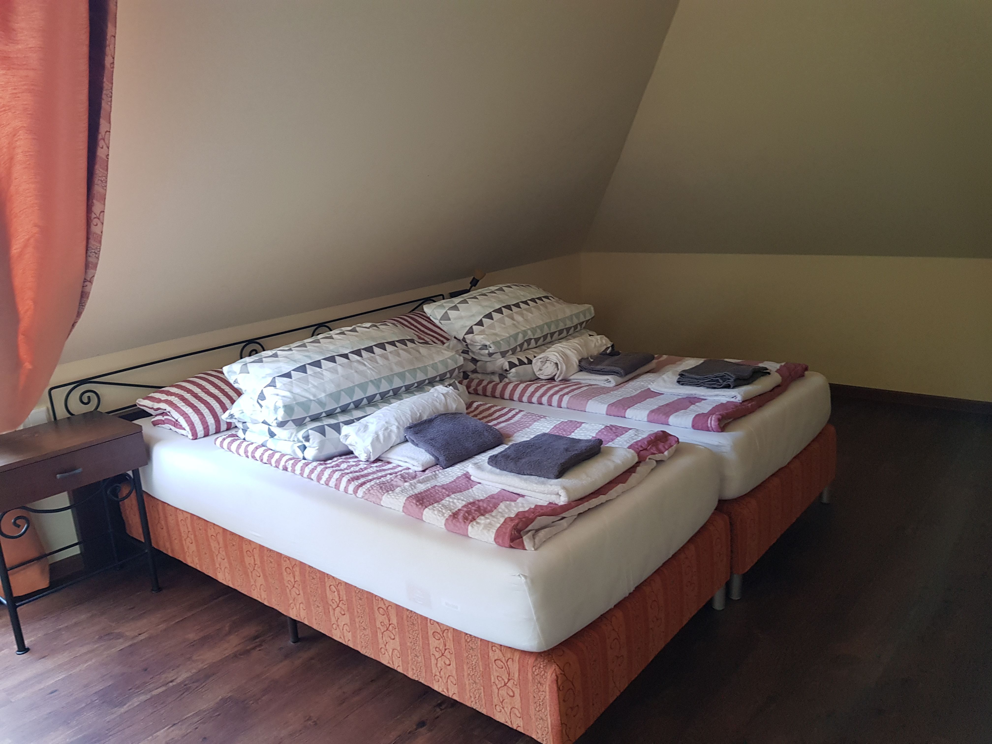 Das attraktive Ferienappartement im 2.OG besteht aus 2 Maisonette- Schlafräumen und einem großzügigen Wohnraum mit Kamin und Erker. Vom Erker und von den beiden Schlafräumen aus den ausklappbaren Cabrio-Dachfenstern hat man einen herrlichen Blick auf die Ostsee. Die Küche ist ausgestattet mit Geschirrspüler, Herd mit Ceranfeld, Mikrowelle mit Grill- und Backfunktion, Kühlschrank, Toaster und Kaffeemaschine. Im Wohnraum befindet sich ein Mediencenter mit SAT-TV, Radio und DVD-Spieler. Sie können die Mahlzeiten entweder im Restaurant im EG oder im Erker genießen. Neben den beiden Doppelbetten und dem einen Einzelbett in den Schlafzimmern kann die Schlafcouch im Wohnzimmer zur Aufbettung genutzt werden. Der Boden ist mit Fußbodenheizung ausgestattet und mit Design-Vinyl Bodenbelag oder Fliesen belegt.