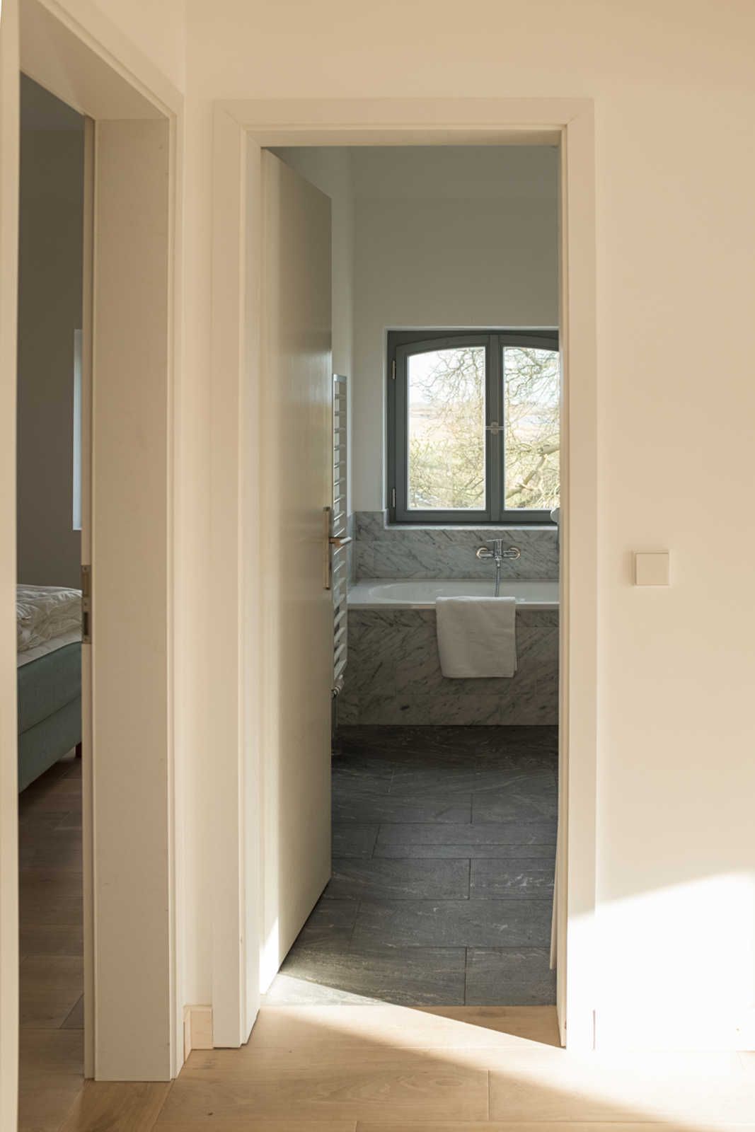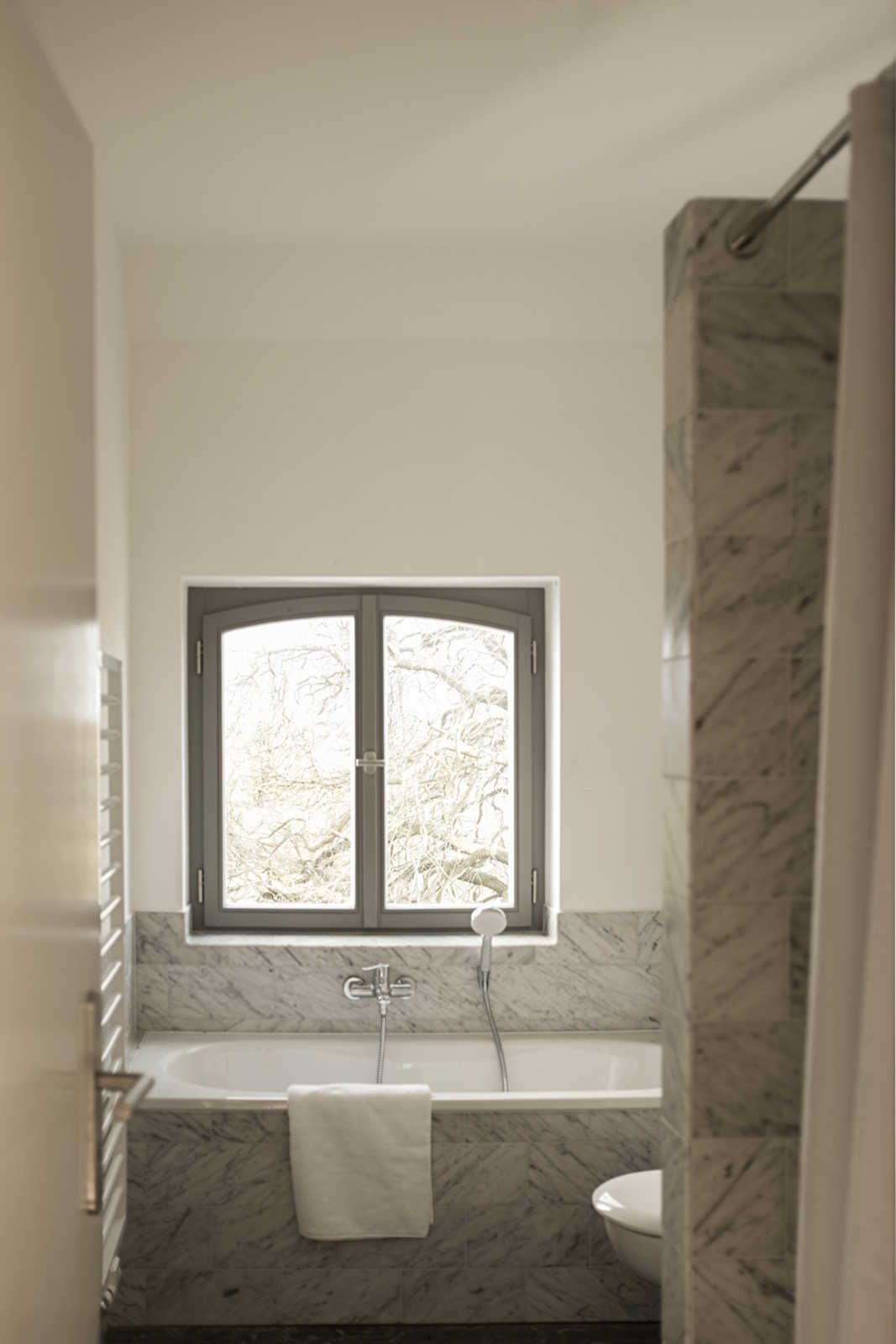 Die Grundmauern der alten Scheunenflächen des ehemaligen landwirtschaftlichen Guts sind wieder sichtbar gemacht worden. Der Ausblick von Haus und Park ist zu allen Seiten geprägt durch die Lage direkt am Wasser.