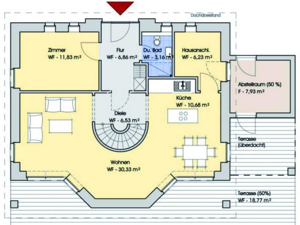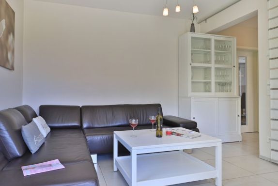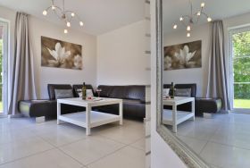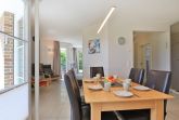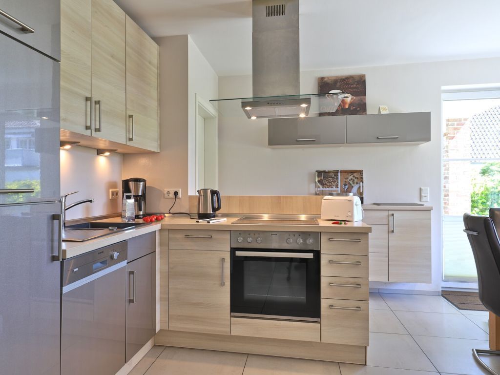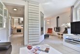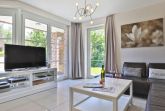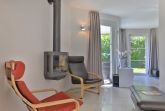In den Wohnbereich integriert ist die hochwertige Küchenzeile, welche bestens ausgestattet ist mit Ceranfeldherd, Backofen, Mikrowelle, Kühlschrank mit Gefrierfach, Geschirrspüler, Kaffeemaschine, Toaster, Wasserkocher sowie weiterem Zubehör. Vom Esstisch haben Sie direkten Zugang auf die große Terrasse mit Garten und Grillmöglichkeit. Zudem befinden sich ein Schlafzimmer mit Doppelbett und Kleiderschrank, wie auch ein Duschbad im Erdgeschossbereich.