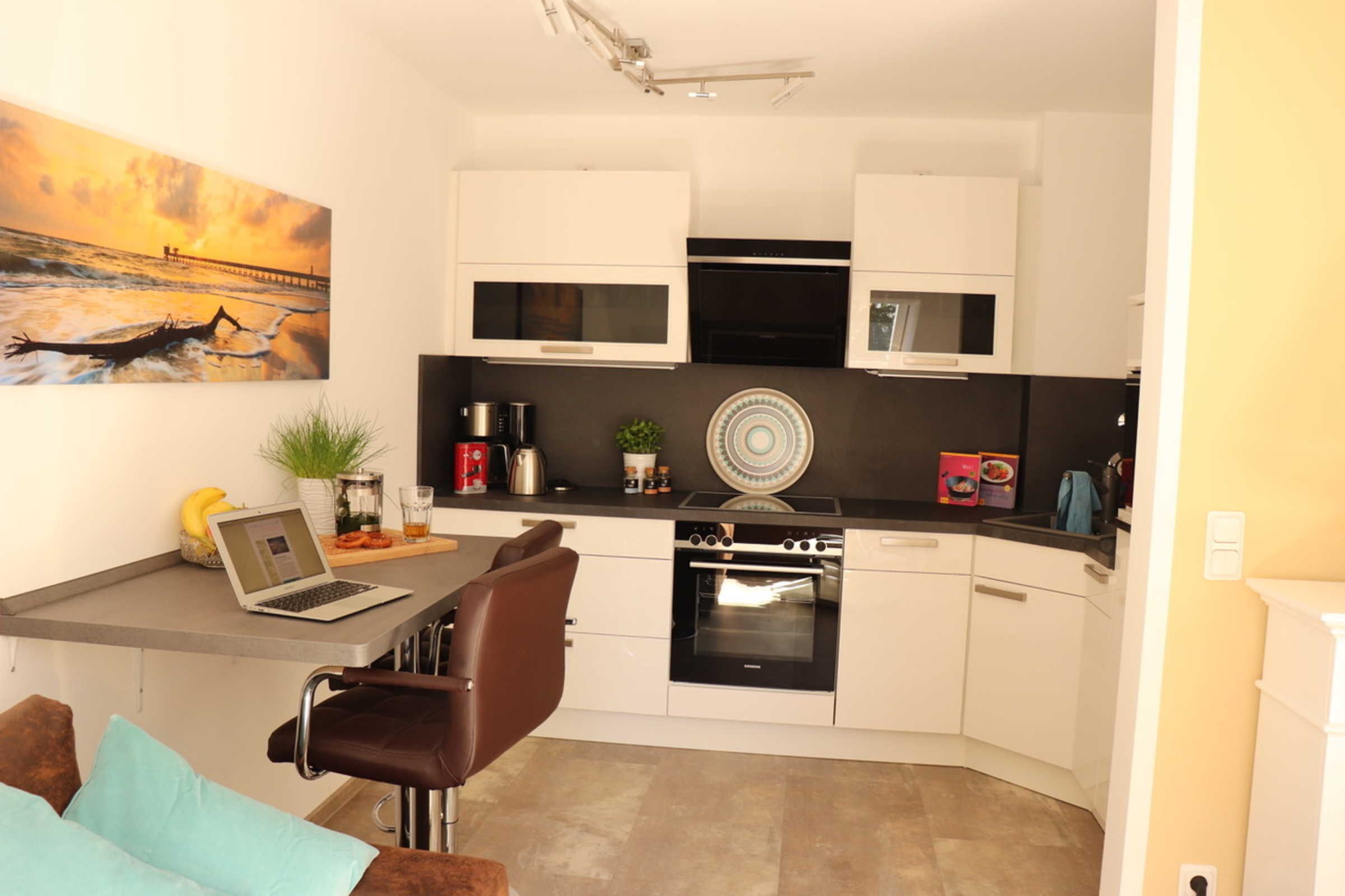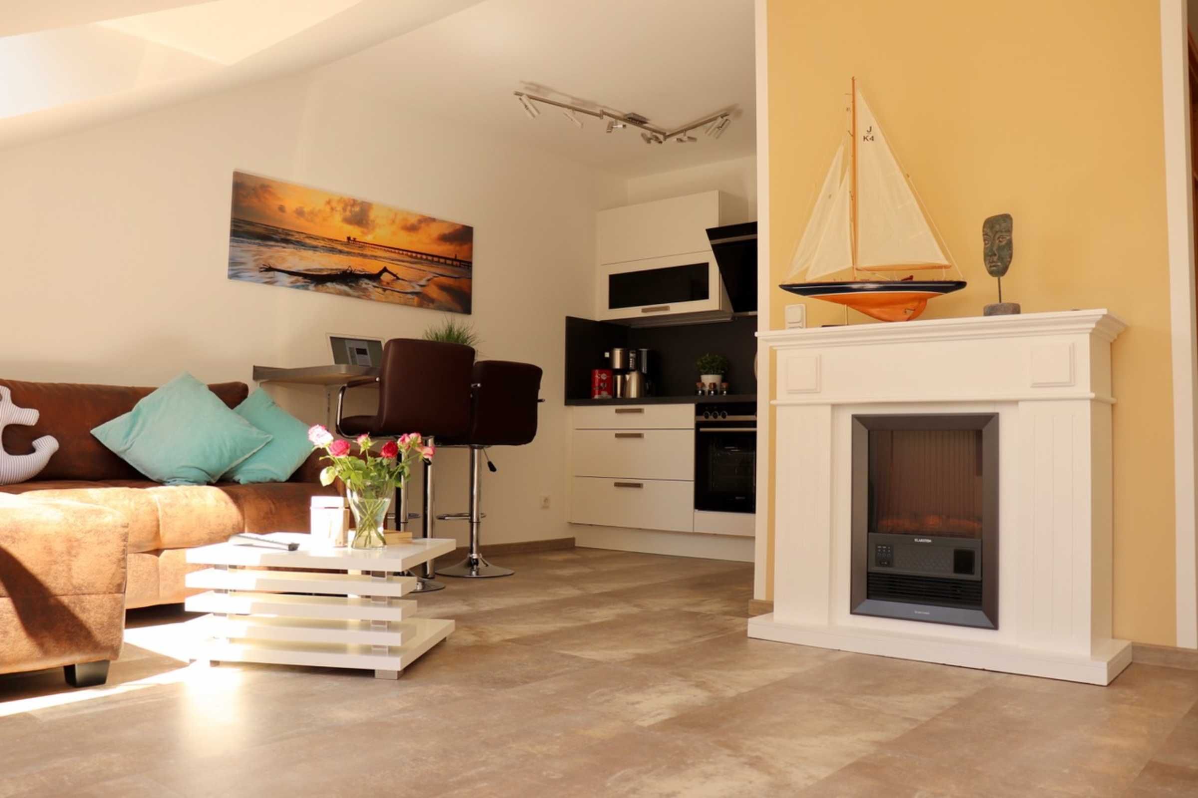 Die in 2018 neu angefertigte hochwertige Einbauküche ist mit jeglichen Komfort und Siemens Markengeräten ausgestattet (4-Felder-Ceranfeld, Backofen, Spülmaschine, Kühlschrank mit Gefrierfach, Mikrowelle, WMF-Wasserkocher, WMF-Kaffeemaschine, WMF-Toaster, Zitruspresse). Ausreichend Geschirr, WMF-Töpfe und Pfannen sowie umfangreiches Zubehör steht Ihnen zur Verfügung. Der Esstisch mit 2 bequemen verstellbaren Barstühlen passt sich zwischen Wohn- und Küchenbereich perfekt ein. Bei Bedarf ist ein Kinderstuhl vor der Anreise dazu buchbar. Das großzügige Badezimmer verfügt über Toilette, Waschbecken und Dusche. Ein Föhn steht Ihnen zur Verfügung. Das kleine gemütliche Schlafzimmer ist mit einem neuen bequemen Bett und Matratzen (180 x 200 cm) ausgestattet, aus dem Sie durch das Dachfenster am Abend in den Sternenhimmel schauen können. In dem Schiebekleiderschrank bekommen Sie bequem alle ihre Sachen verstaut. Für eine besondere Atmosphäre sorgt das LED-Licht mit Farbwechselmöglichkeit. Insofern Sie mit einem Kleinkind anreisen, ist ein Kinderbett zubuchbar. Größere Kinder können auf der ausziehbaren Coach im Wohnzimmer übernachten. Das Wohnzimmer ist mit einem LCD-Fernseher mit Kabelanschluss, einer Stereoanlage, einer kleinen Bibliothek, einer Spielesammlung sowie einer großzügigen Couch ausgestattet. An kühleren Tagen sorgt ein Elektrokamin schnell für Wärme und Atmosphäre. Im Flur finden Sie großzügige Ablagemöglichkeiten für ihre Schuhe, Taschen, Jacken und Co.