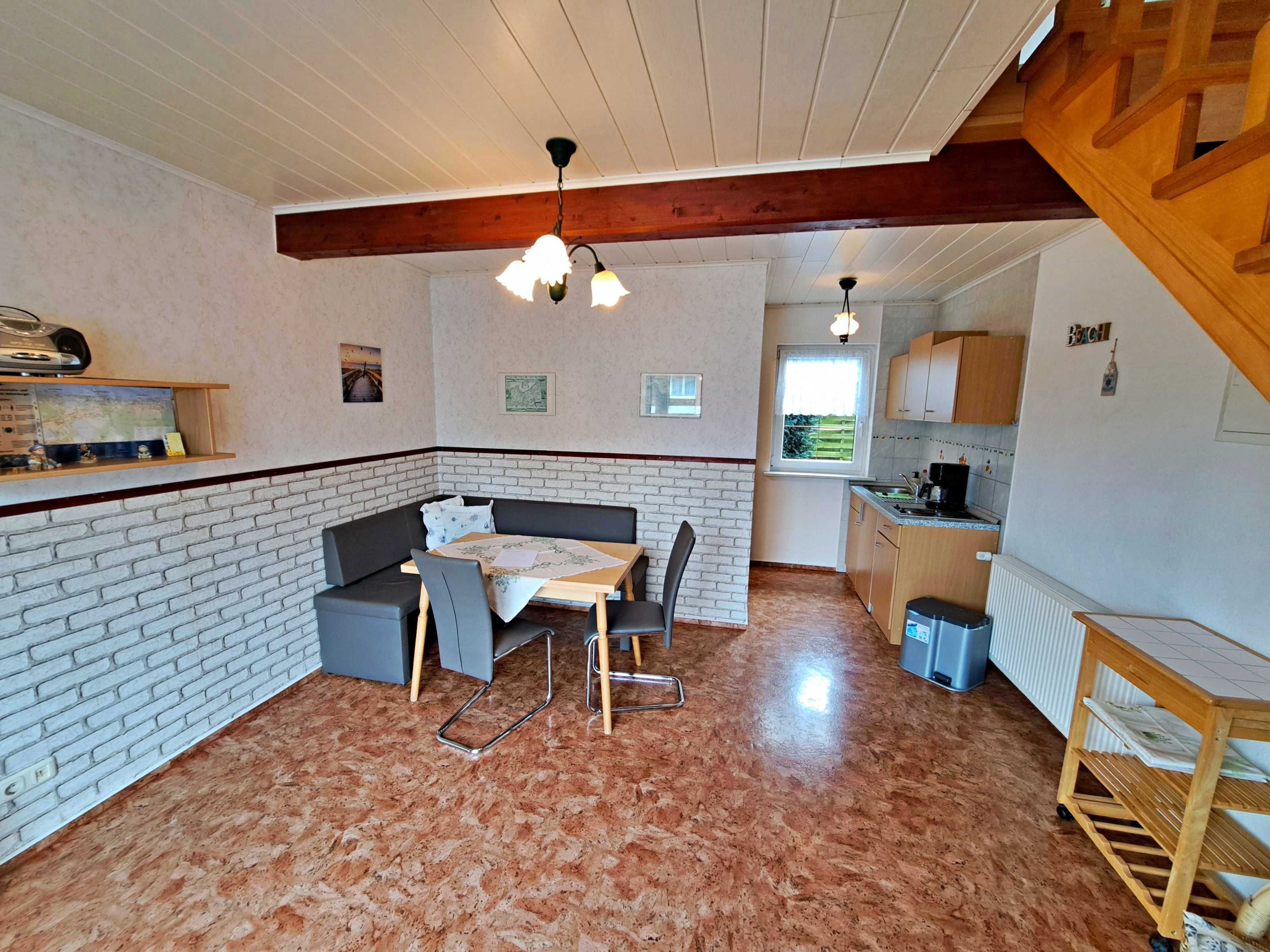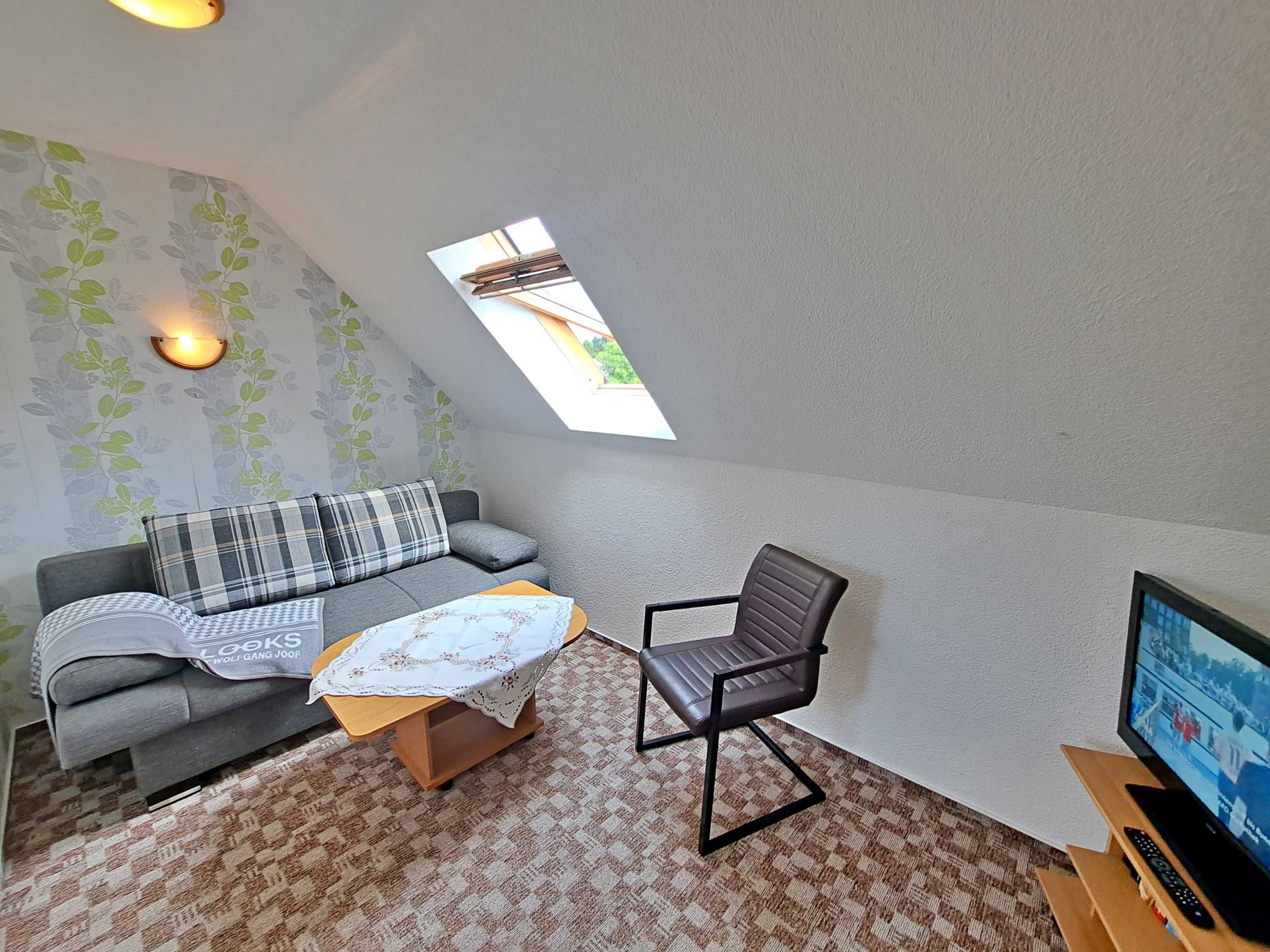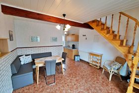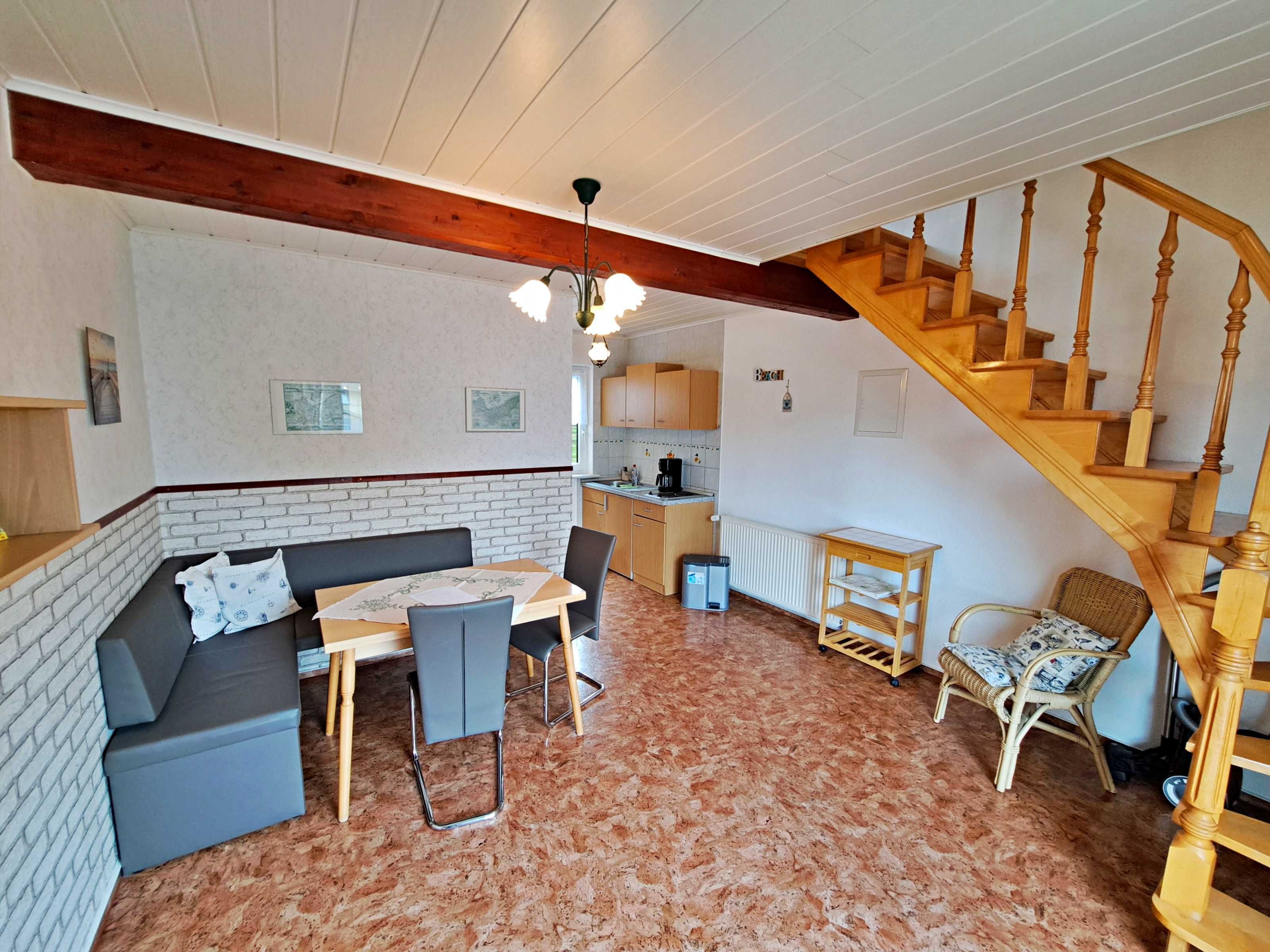 Über eine Treppe gelangen Sie ins 1. Obergeschoss, wo ein einladendes Wohnzimmer mit einer bequemen Couch, die auch als Schlafgelegenheit für zwei weitere Personen dient, auf Sie wartet. Außerdem gibt es ein separates Schlafzimmer mit einem komfortablen Doppelbett und Kleiderschrank. Genießen Sie die frische Luft auf der möblierten Terrasse direkt am Eingang, die perfekt ist um bei schönem Wetter Ihr Frühstück zu genießen oder den Abend mit einem Glas Wein ausklingen zu lassen. Ein Pkw-Stellplatz direkt am Haus sowie kostenfreies W-LAN stehen Ihnen ebenfalls zur Verfügung. Falls Sie gerne grillen möchten, können Sie auf Anfrage eine Grillmöglichkeit direkt beim Vermieter ausleihen. Zudem besteht die Möglichkeit gegen eine Kaution von 50 € eine Mikrowelle zur Verfügung gestellt zu bekommen.