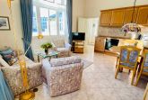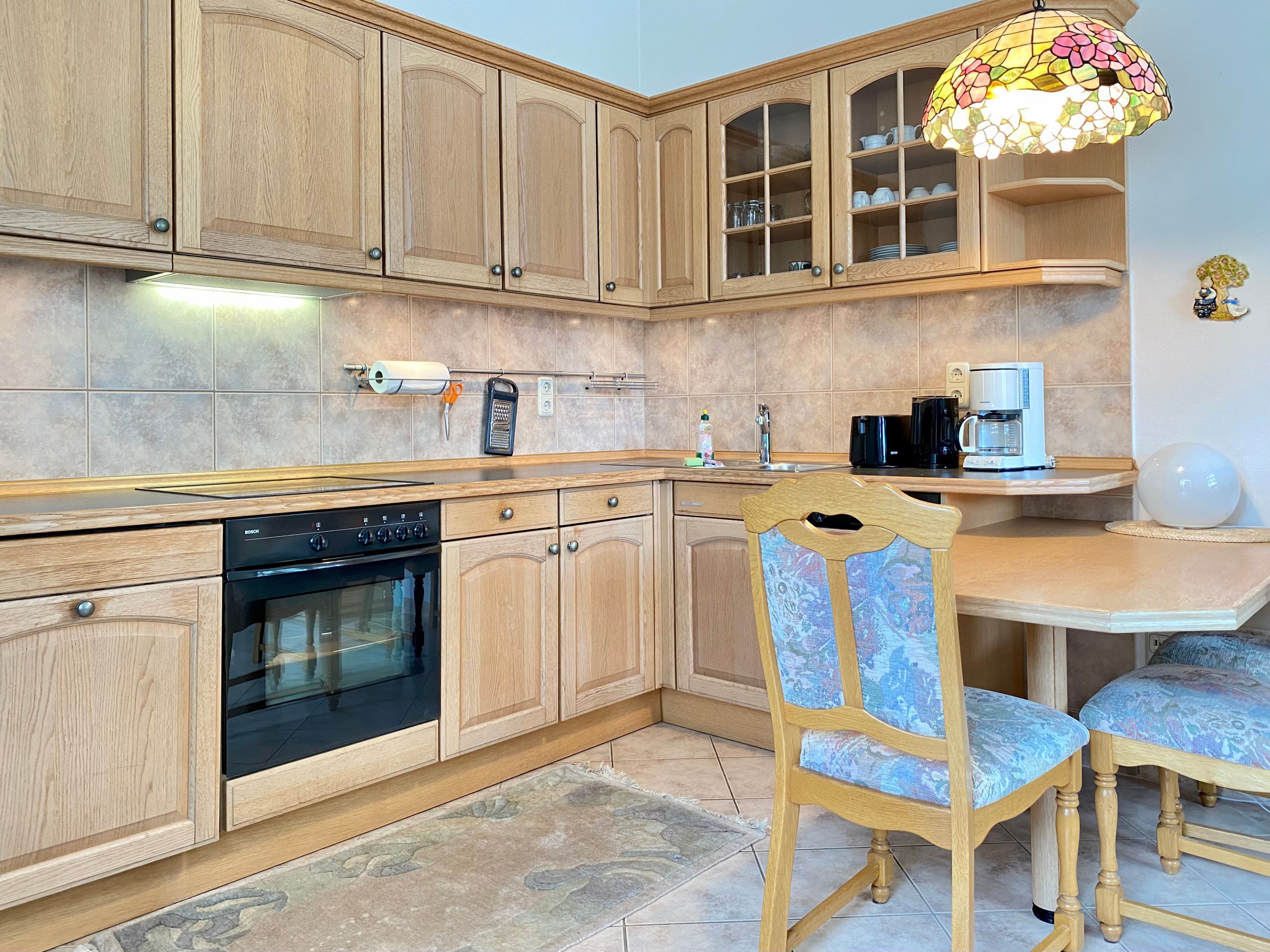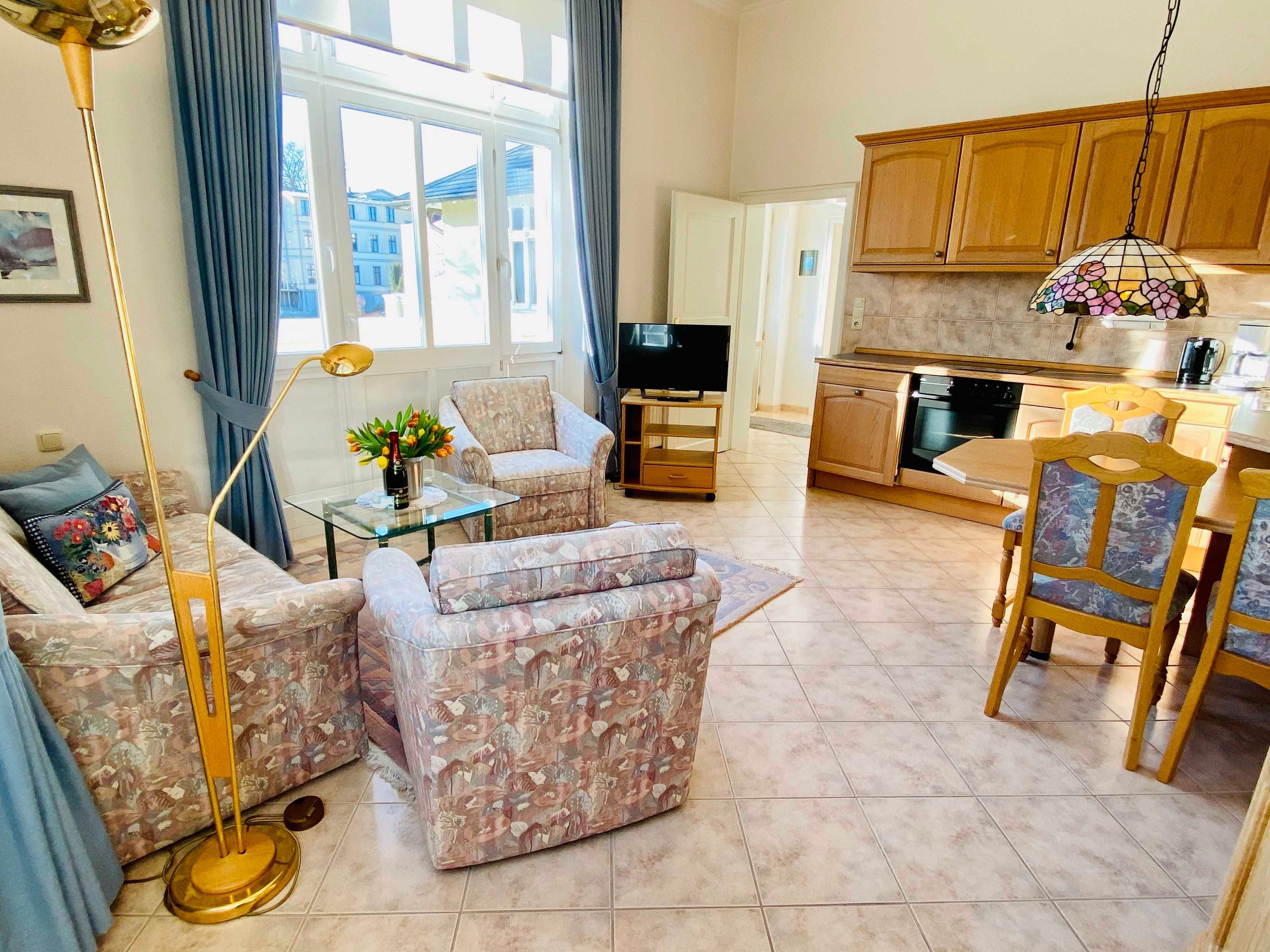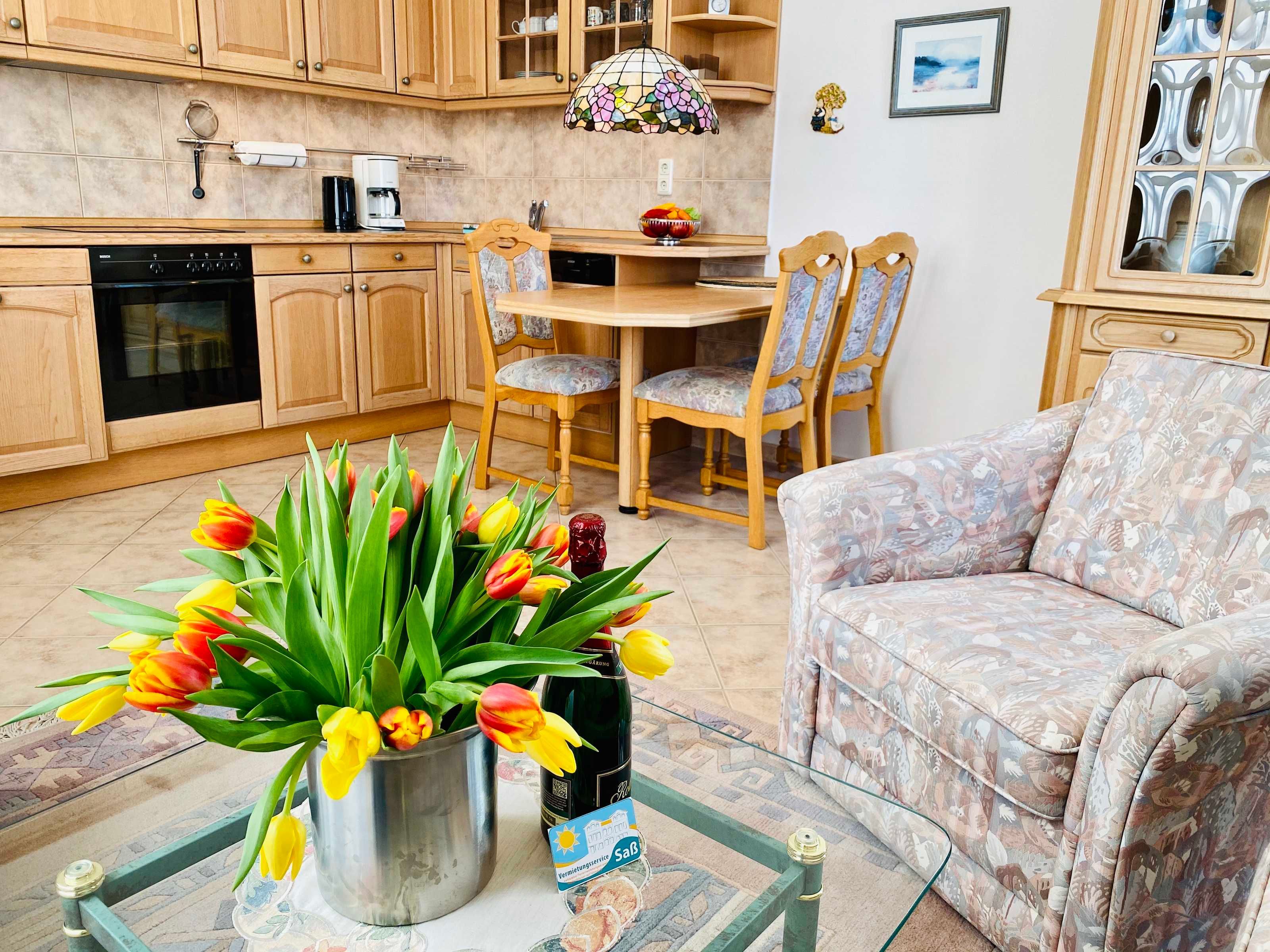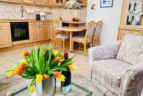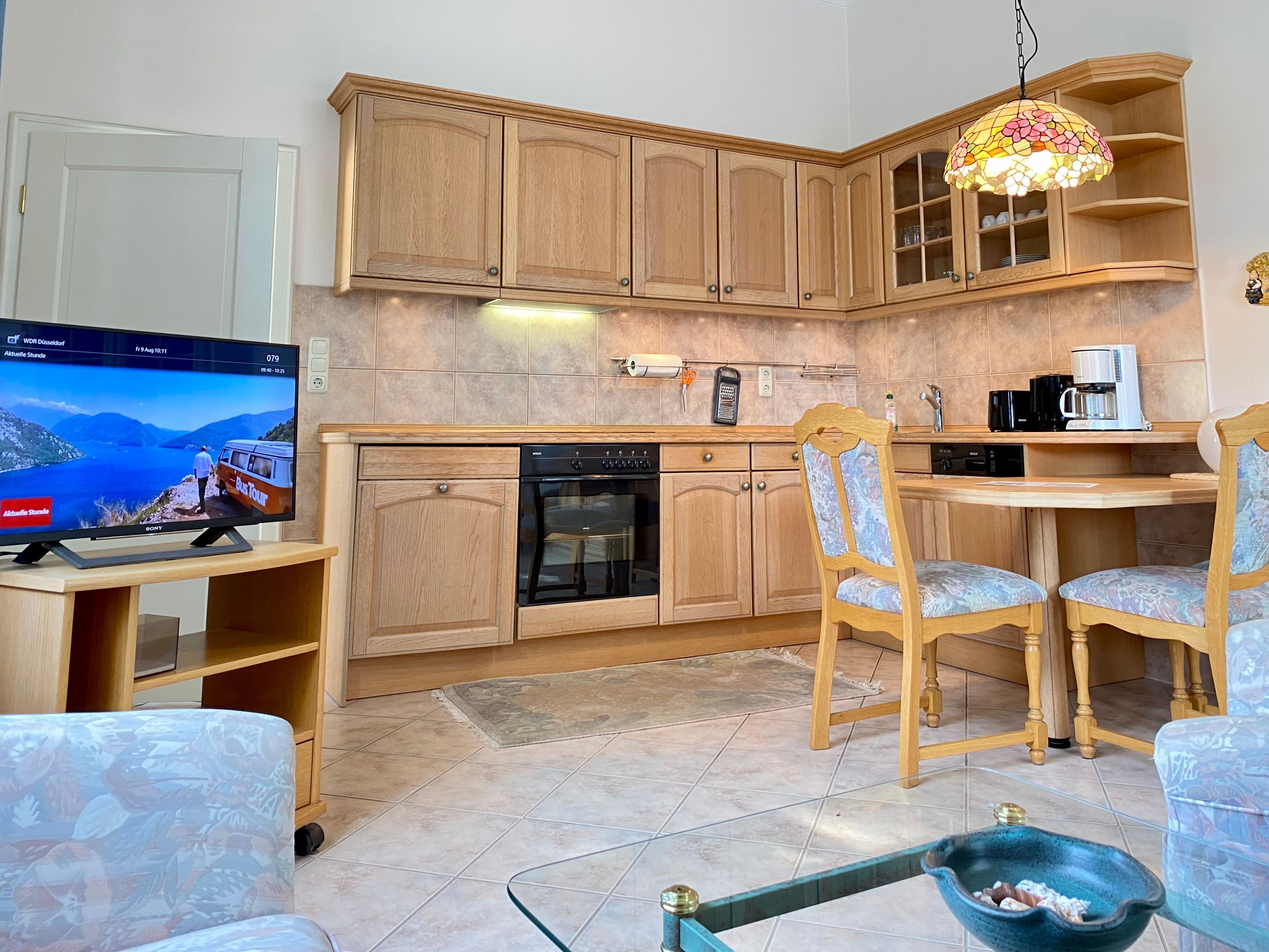 Das gemütliche Wohnzimmer ist mit einer Sitzcouch, ein Sessel und ein kleinen Esstisch und kompletten Küchenzeile ausgestattet. Es gibt ein Schlafzimmer mit Doppelbett und Kleiderschrank. Die Wohnung hat kleines Bad mit Dusche