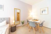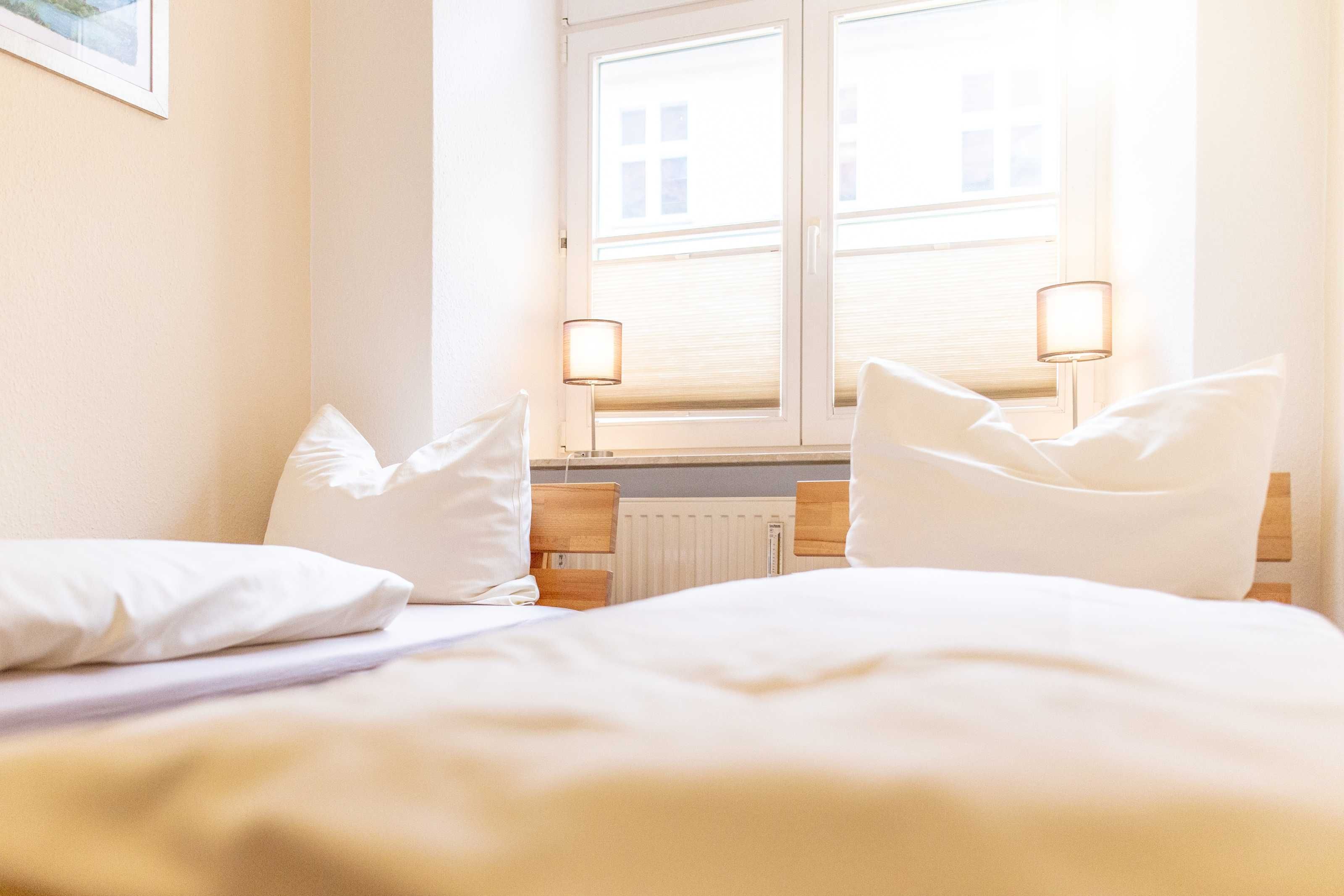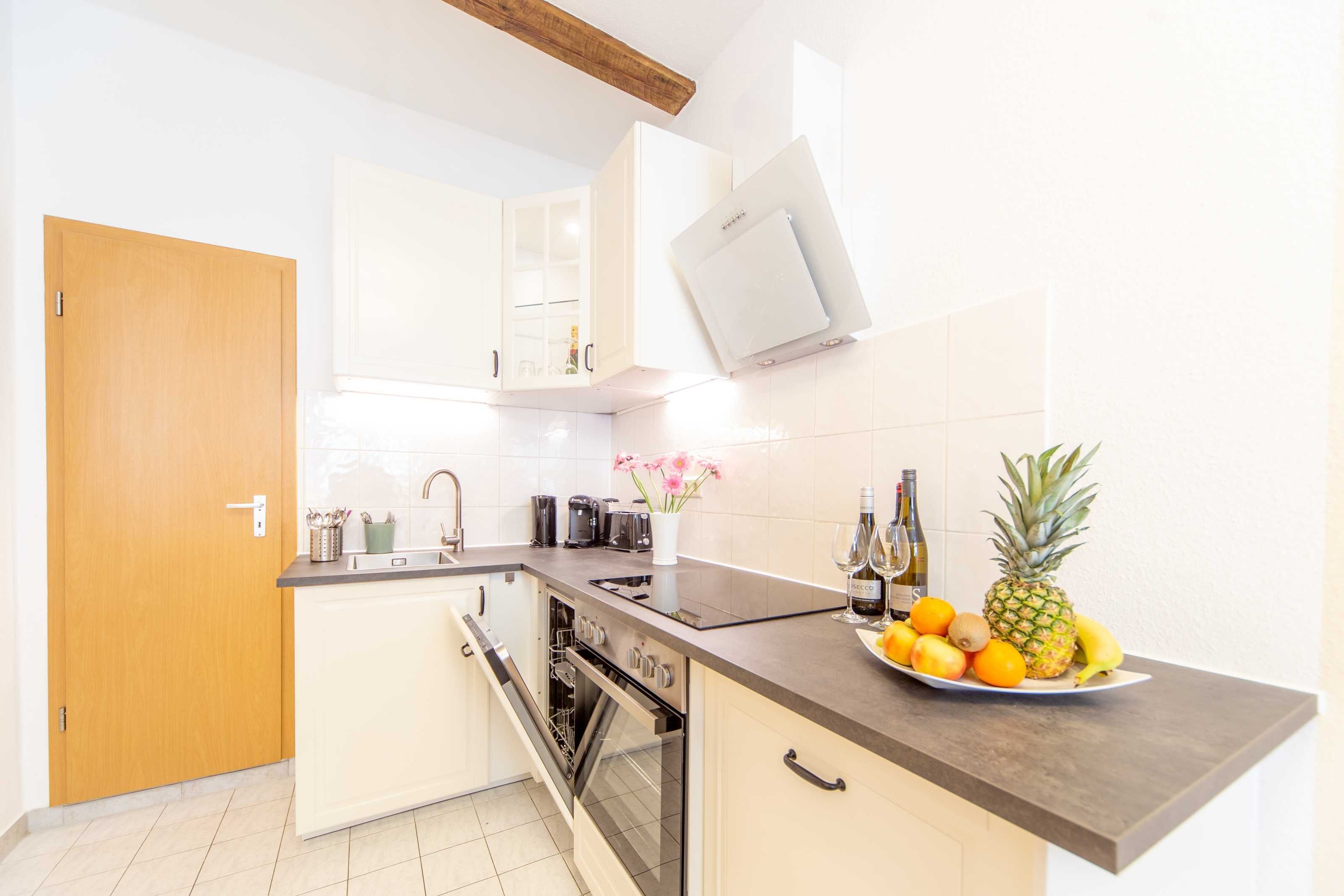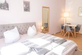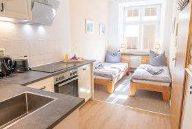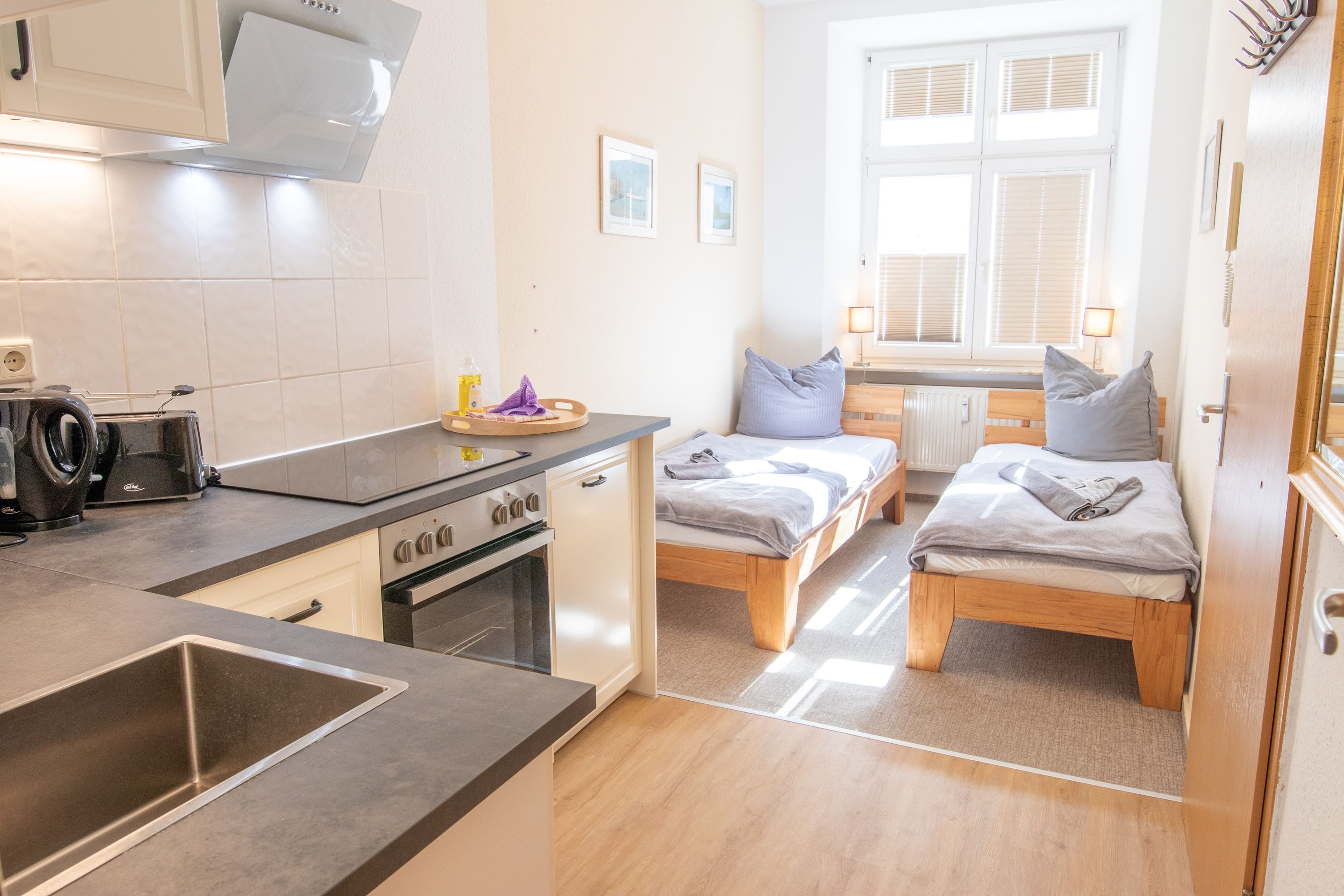 Die Ferienwohnung 1 verfügt auf 35m² Fläche über 2 Räume sowie ein seperates Badezimmer. Die Küche ist mit Spüle, Geschirrspüler, Backofen, Cerankochfeld, Kühlschrank mit Gefrierfach, Wasserkocher, Toaster, Kaffeemaschine, täglichen Küchenhelfern, Besteck, Geschirr etc. ausgestattet. In der Küche befindet sich auch ein Schlafbereich mit zwei zusammenstellbaren Einzelbetten. Der zweite Raum, das Schlafzimmer ist über den öffentlichen, aber sehr ruhigen Hausflur zu erreichen und nur ca. 2 m entfernt. Hier befinden sich ein Doppelbett (180x200cm), Smart-TV und eine gemütliche Sitzecke. Das Badezimmer verfügt über Dusche, WC und Waschbecken.