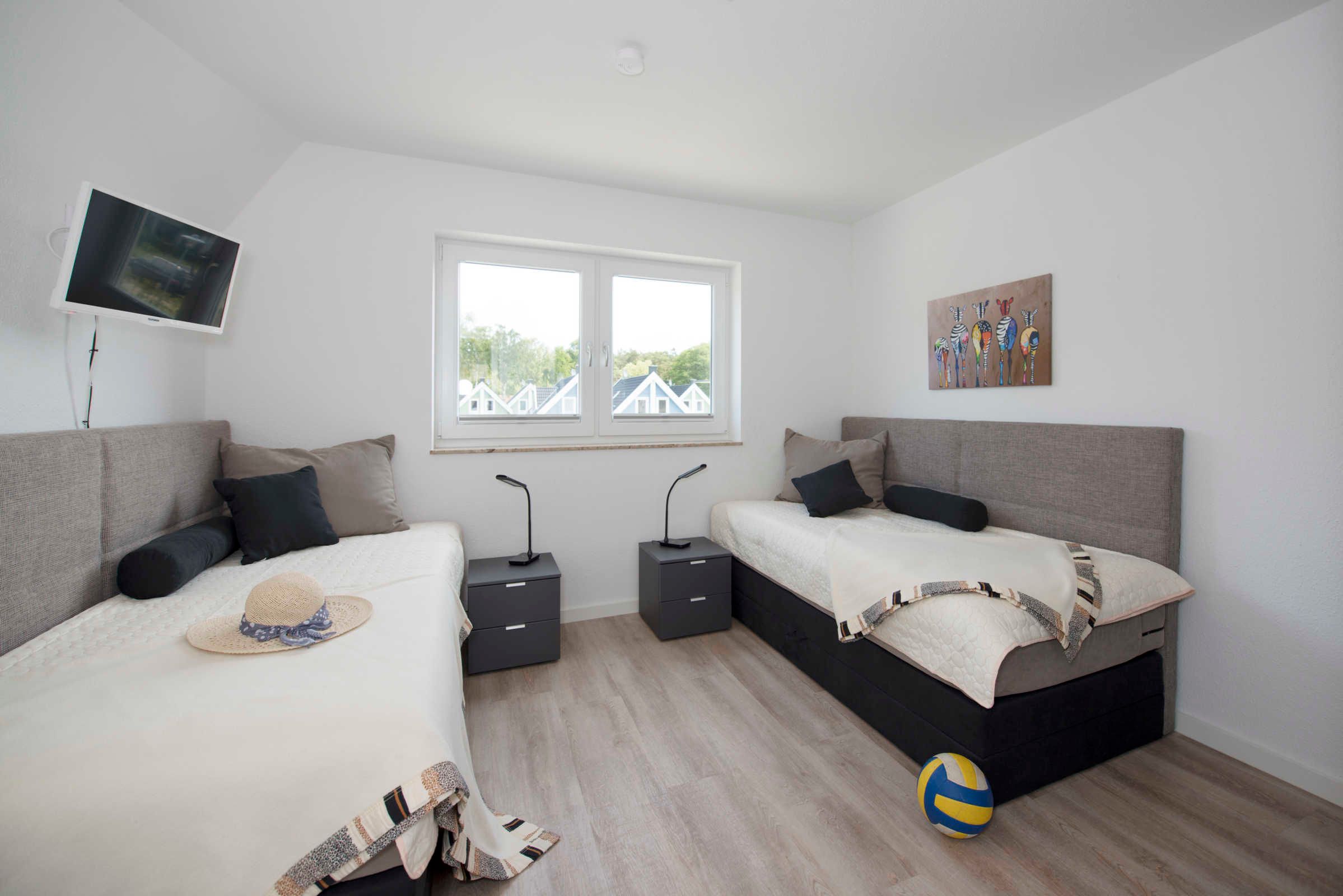 Im Erdgeschoss befindet sich ein Schlafzimmer mit zwei Einzelbetten. Zwei weitere Schlafzimmer im Obergeschoss verfügen über ein großes Doppelbett bzw. 2 Einzelbetten.