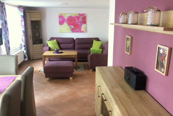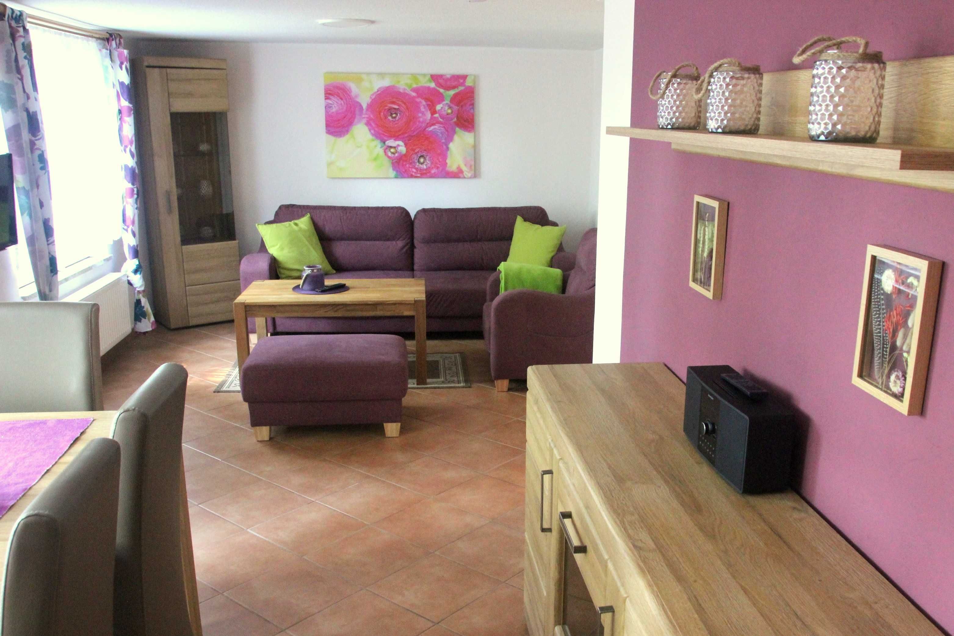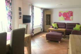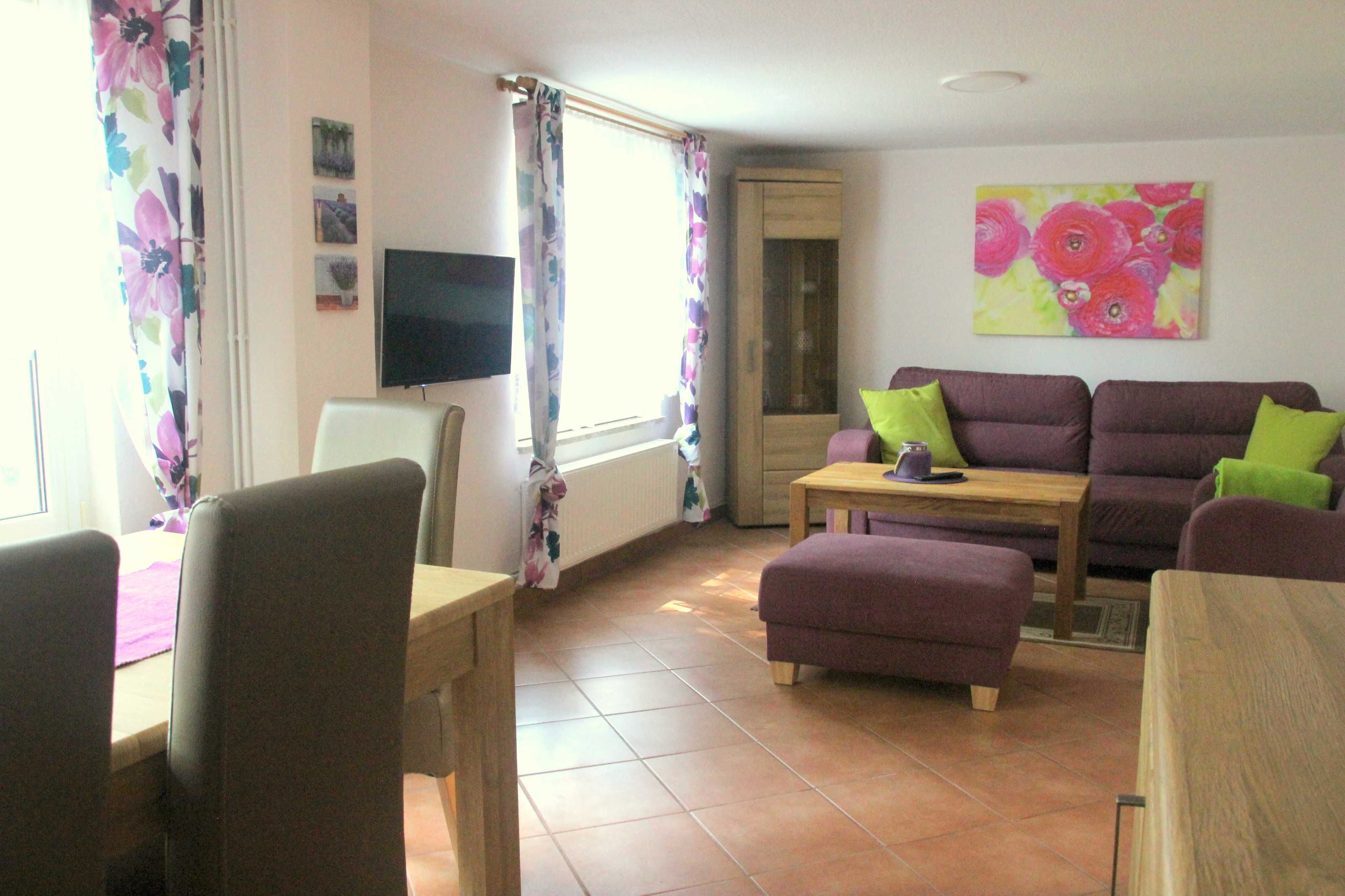 Das Wohnzimmer ist mit einer Couch und einem Essbereich für 4 Personen ausgestattet.