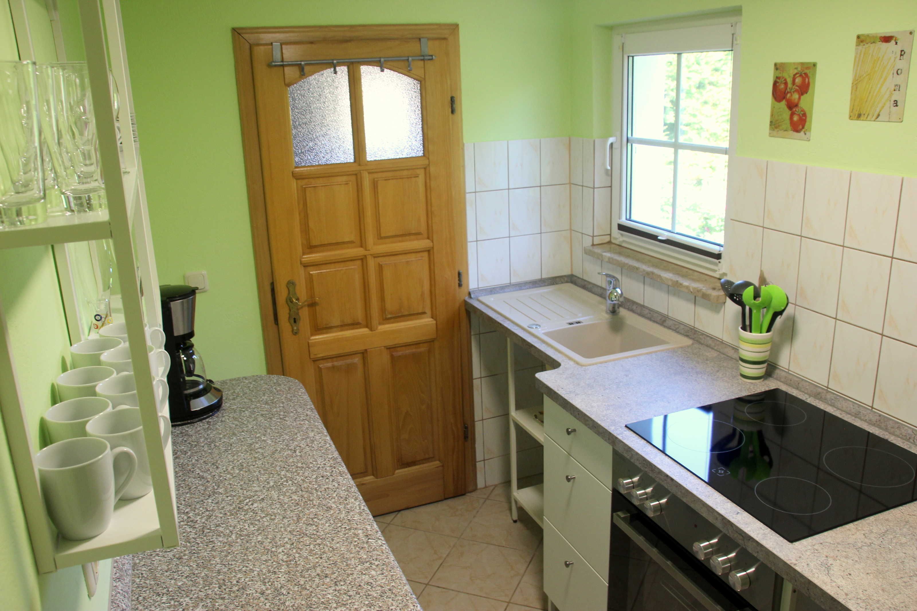 Die Küche bietet einen Kühlschrank mit Gefriermöglichkeit, einen Backofen, einen Geschirrspüler, eine Mikrowelle sowie Kaffeemaschine und Wasserkocher.