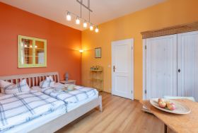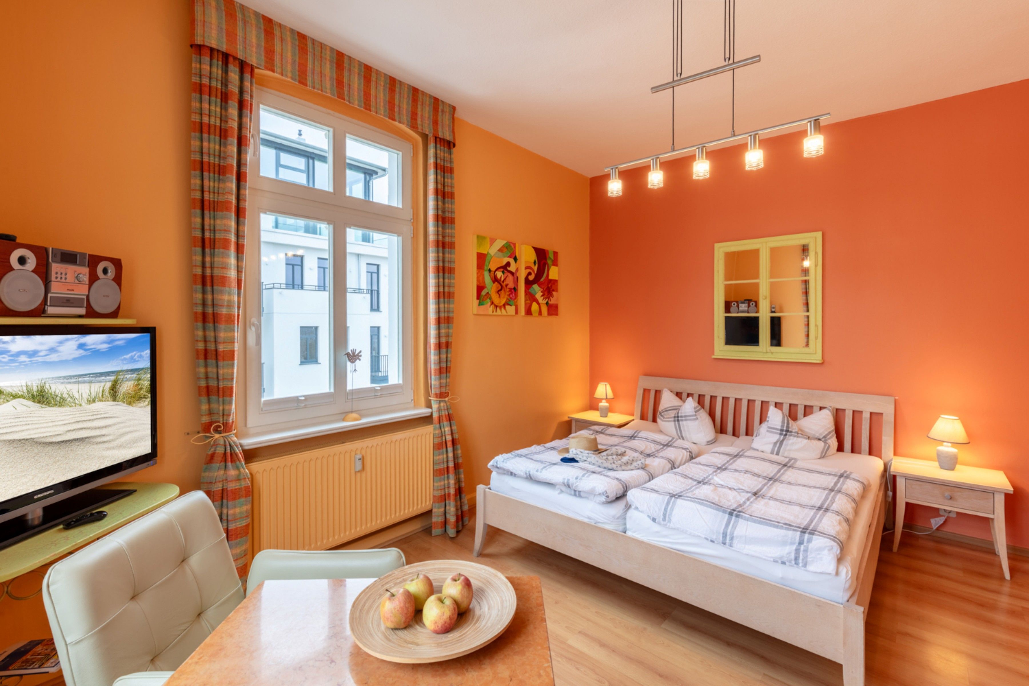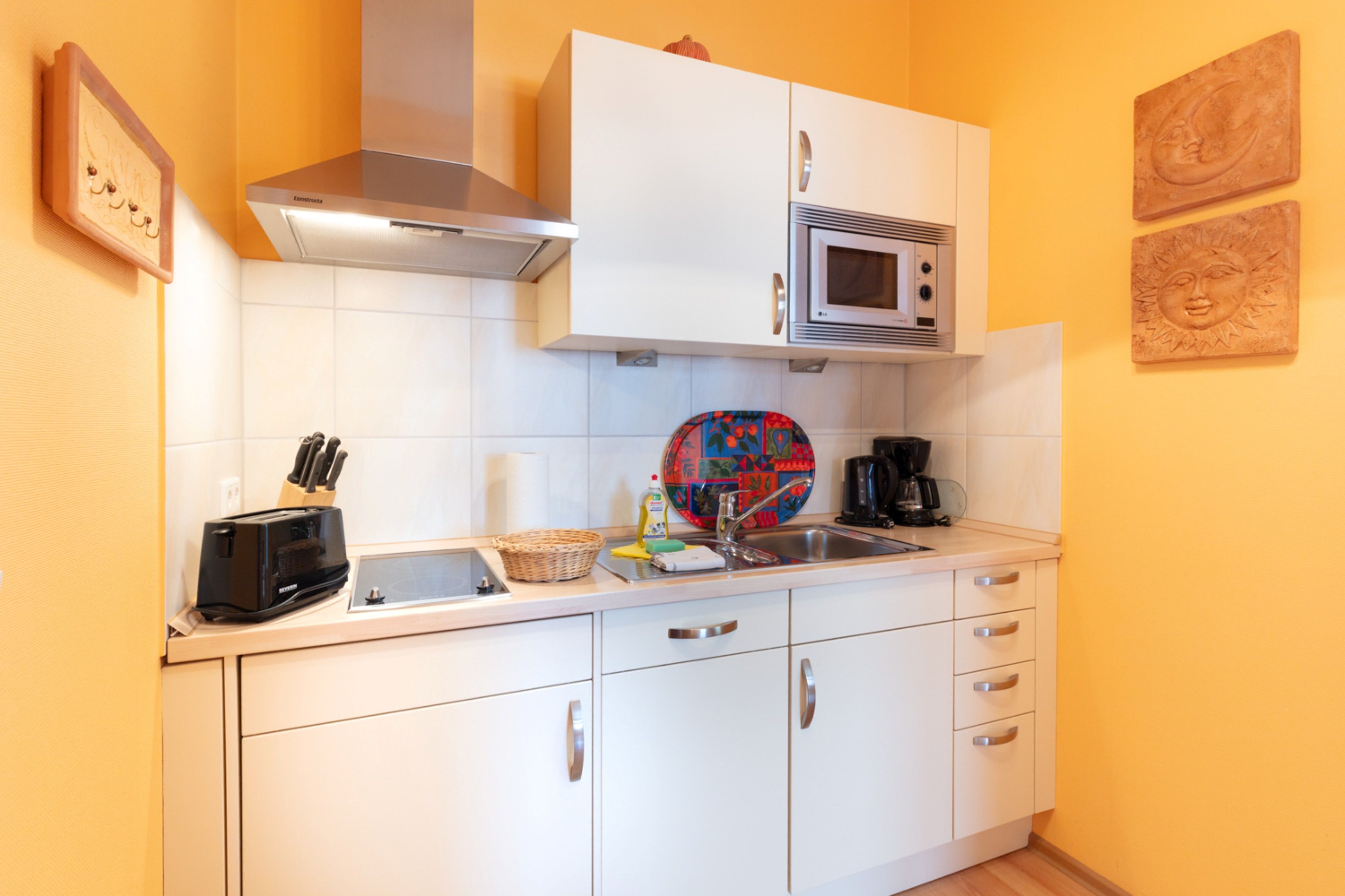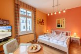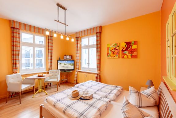 Die 27 qm große komfortable 1-Raum-Ferienwohnung befindet sich in der zweiten Etage und verfügt über seitlichen Seeblick. Die Wohnung besteht aus einem kombinierten Wohn- u. Schlafraum mit einem Doppelbett, Sat-TV, Radiowecker, Telefon, Schranktresor, einer kleinen Küchenzeile mit 2 Herdplatten, Kühlschrank, Mikrowelle, Spüle, Kaffeemaschine, Geschirr etc.. Bad mit Dusche und WC.