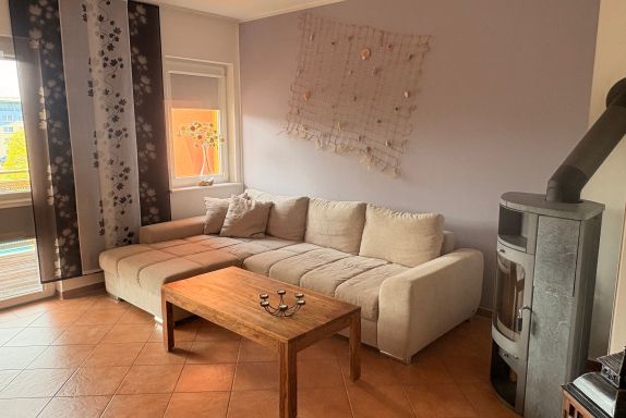 Gemütlich und modern eingerichtete Ferienwohnung mit einem Kamin und Balkon.
