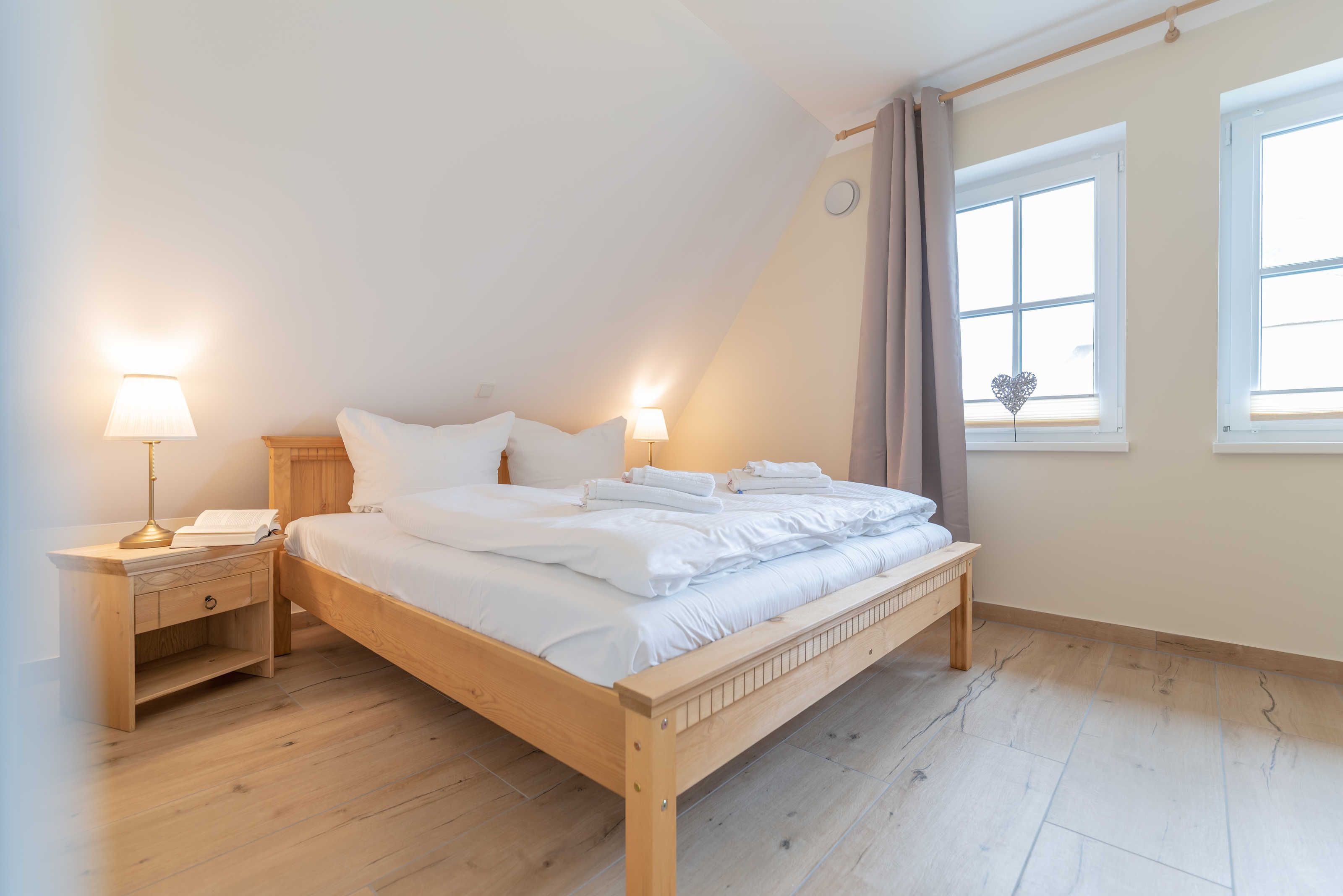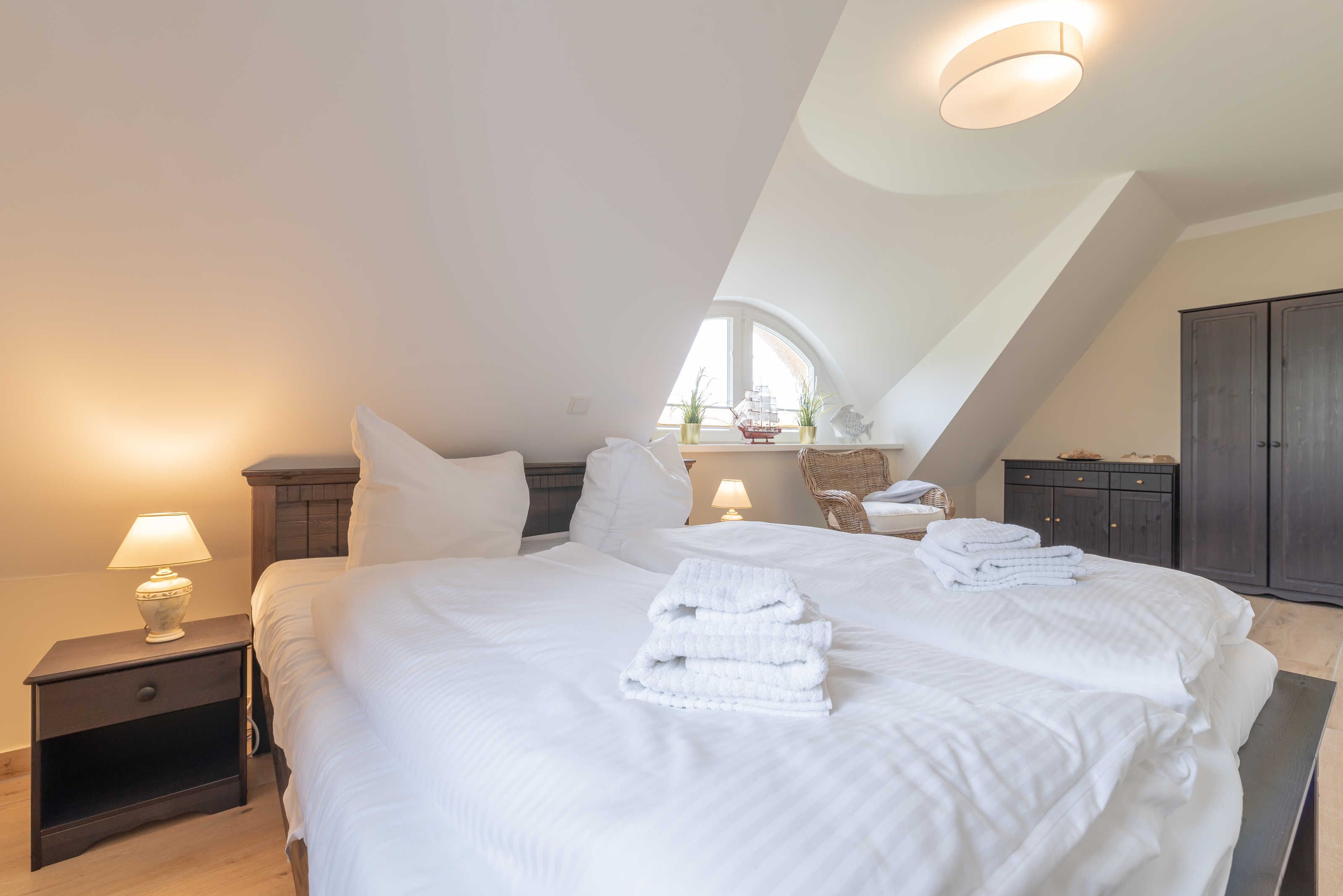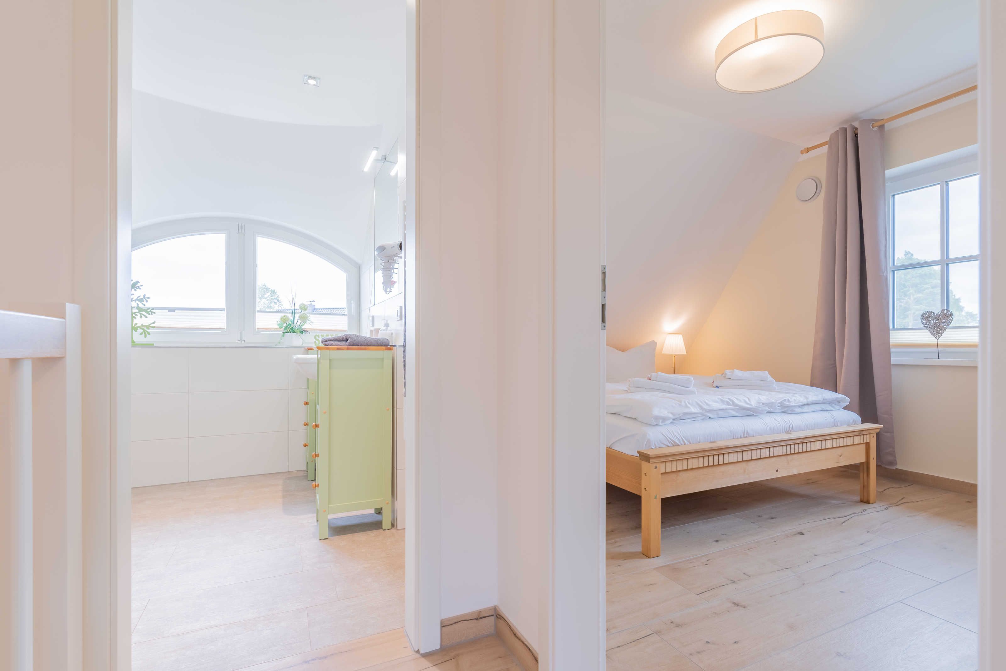 Im Obergeschoss befindet sich das zweite großzügig und hell angelegte Badezimmer mit Dusche und Handtuchtrockner. Beide sich im Obergeschoss befindlichen Schlafzimmer sind mit geräumigen Kleiderschränken, Sitzgelegenheiten und Kommoden, sowie zwei Doppelbetten (1,80 x 2,00 m) mit einer großen Matratze ausgestattet. Zum besseren Einschlafen kann im großen Schlafzimmer auf den installierten Flat-TV Fernsehen geschaut werden.