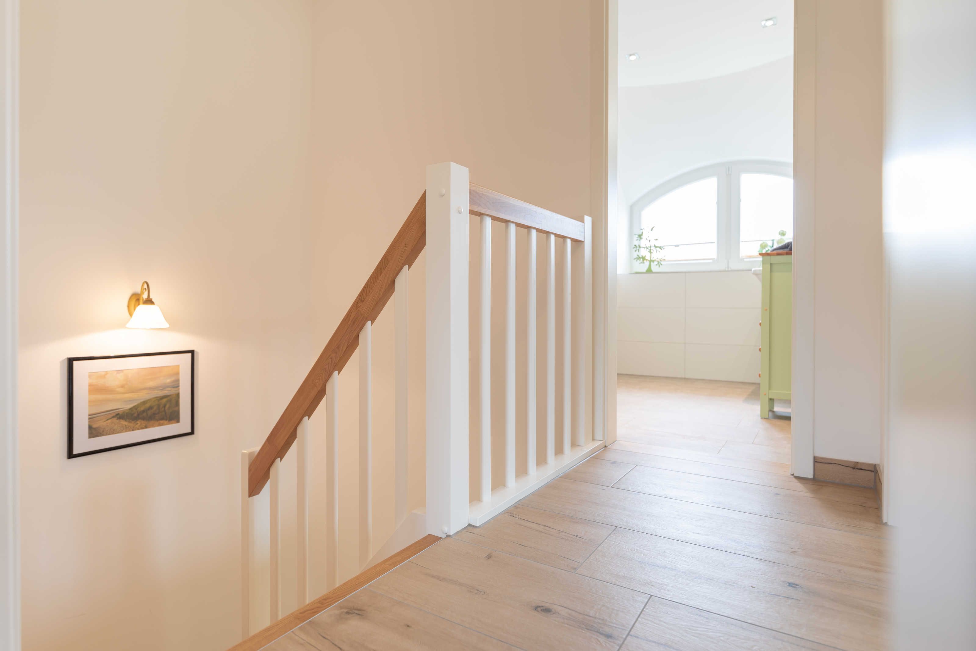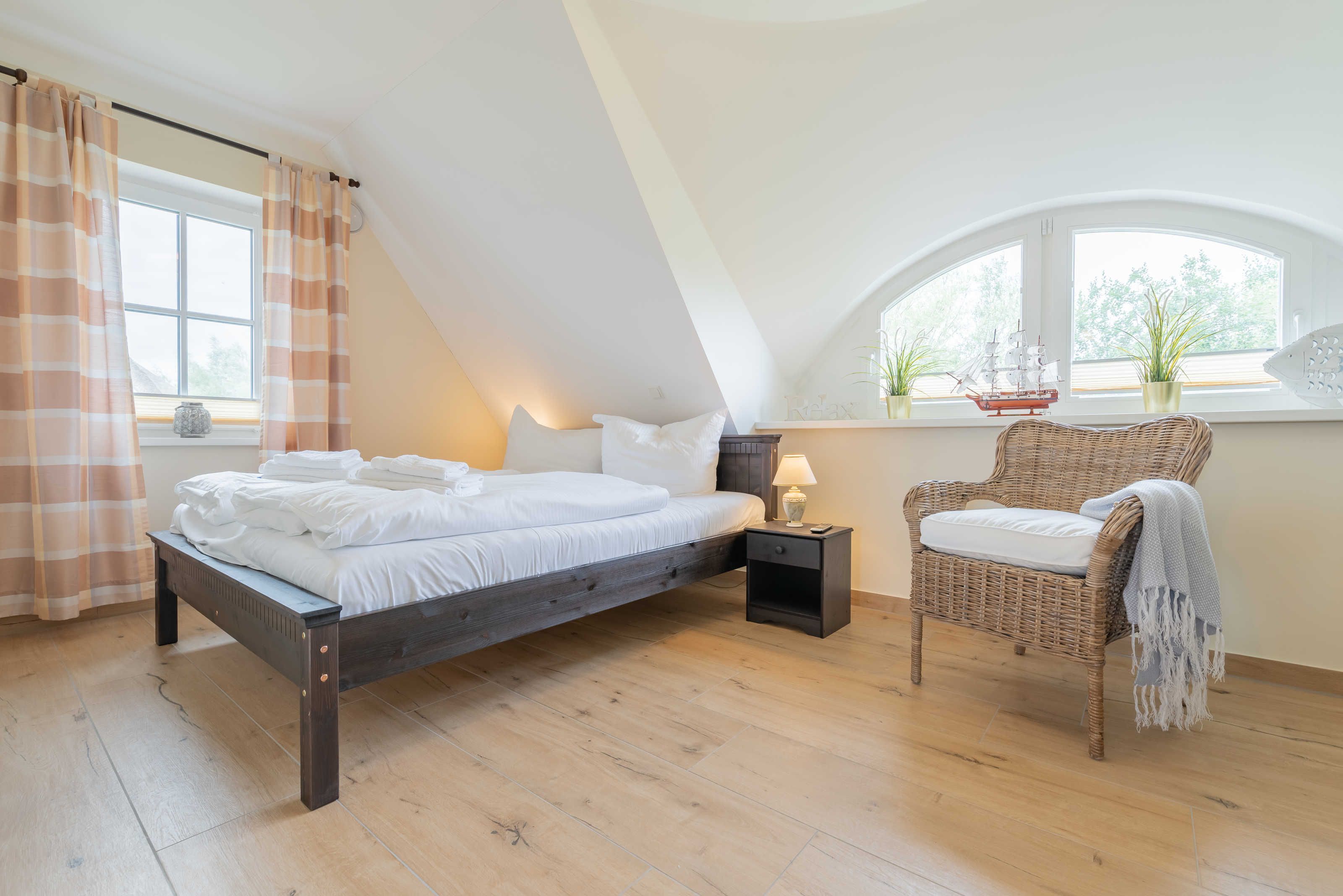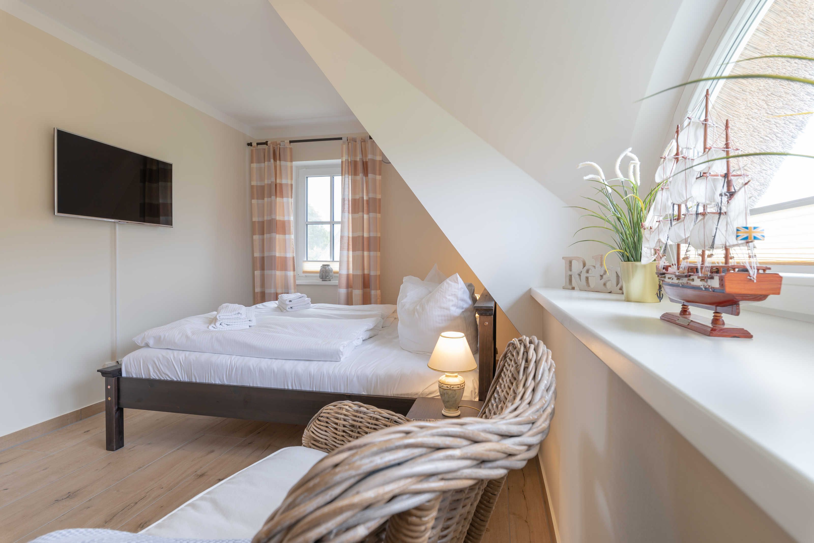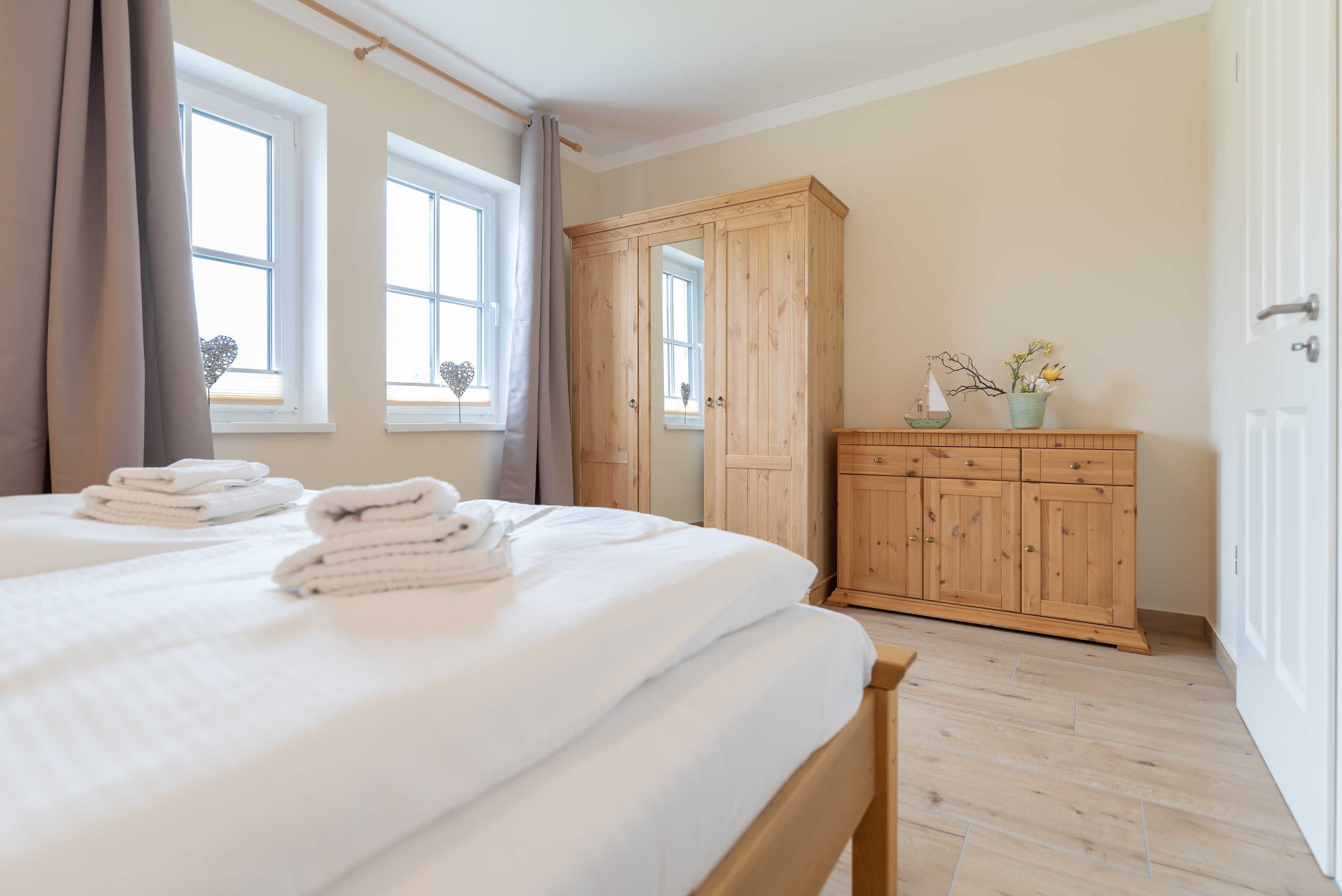 Im Obergeschoss befindet sich das zweite großzügig und hell angelegte Badezimmer mit Dusche und Handtuchtrockner. Beide sich im Obergeschoss befindlichen Schlafzimmer sind mit geräumigen Kleiderschränken, Sitzgelegenheiten und Kommoden, sowie zwei Doppelbetten (1,80 x 2,00 m) mit einer großen Matratze ausgestattet. Zum besseren Einschlafen kann im großen Schlafzimmer auf den installierten Flat-TV Fernsehen geschaut werden.
