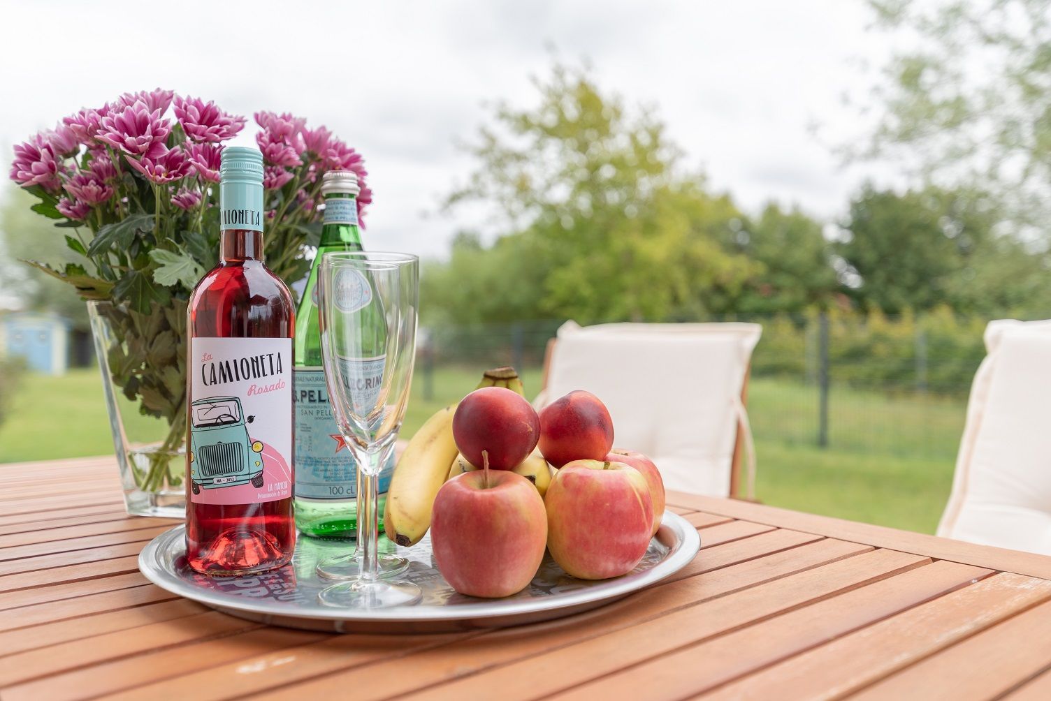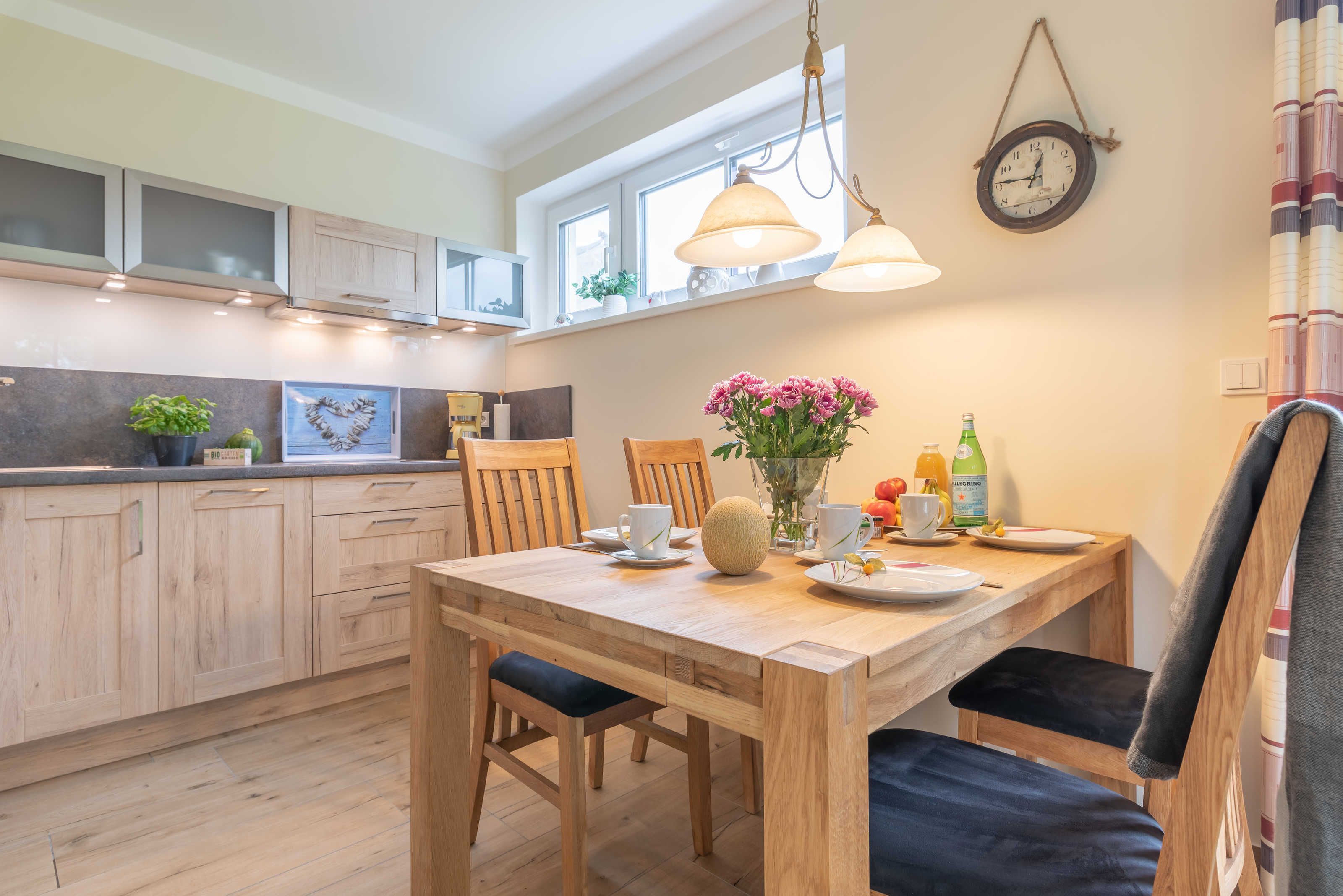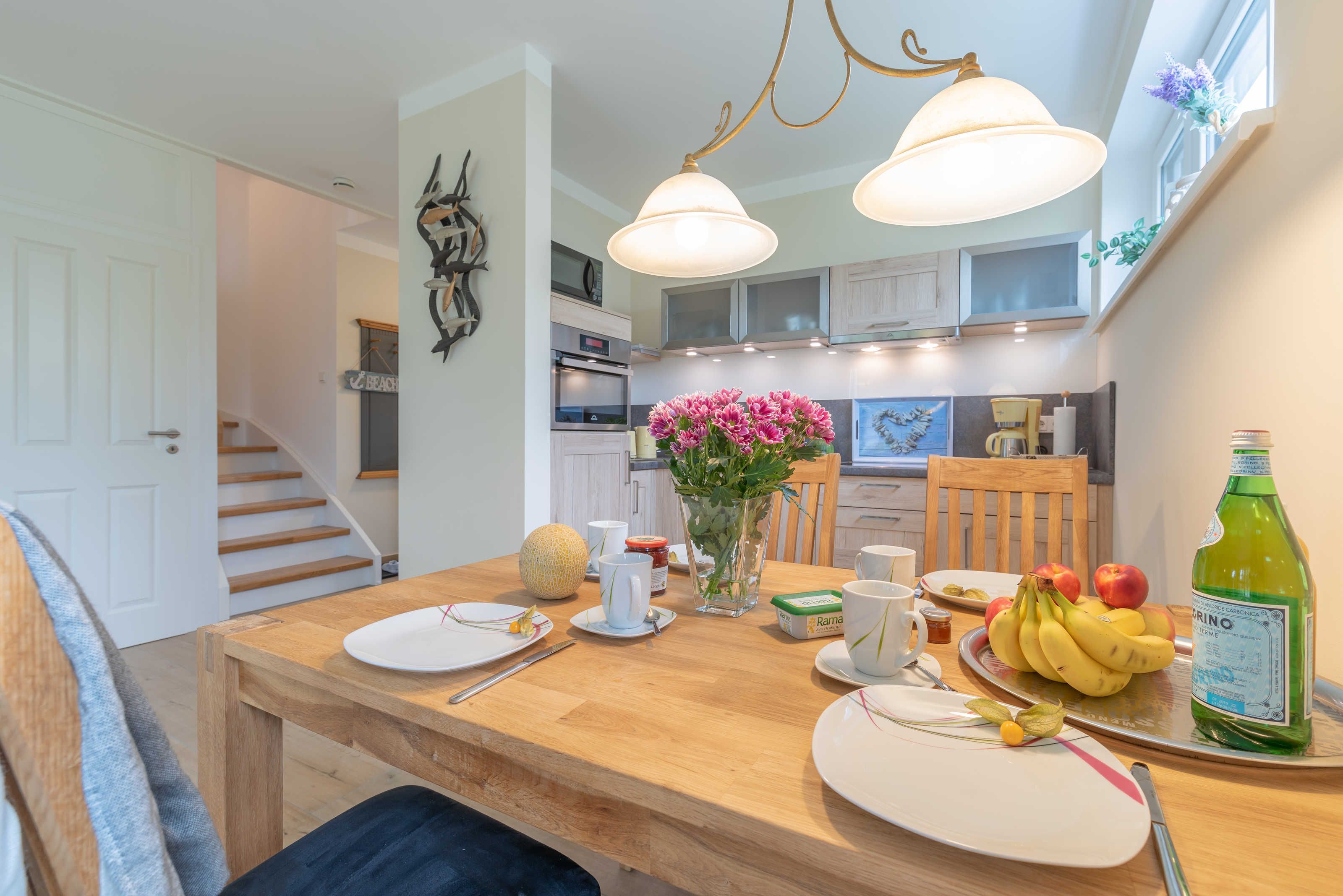 Der großzügig gestaltete Wohn-Essbereich befindet sich ebenfalls im Erdgeschoss. Die Einbauküche im klassischen Landhausstil sowie div. Küchengeräte wie Toaster, Eierkocher, Kaffeemaschine, Wasserkocher, Mikrowelle und Herd mit Cerankochfeld und Backofen bieten ambitionierten Hobbyköchen, auch im Urlaub, die Möglichkeit Essen nach eigenen Wünschen zu kochen. Im Küchenbereich rundet ein massiver Holztisch inkl. vier Stühlen das freundlich warme Design ab.