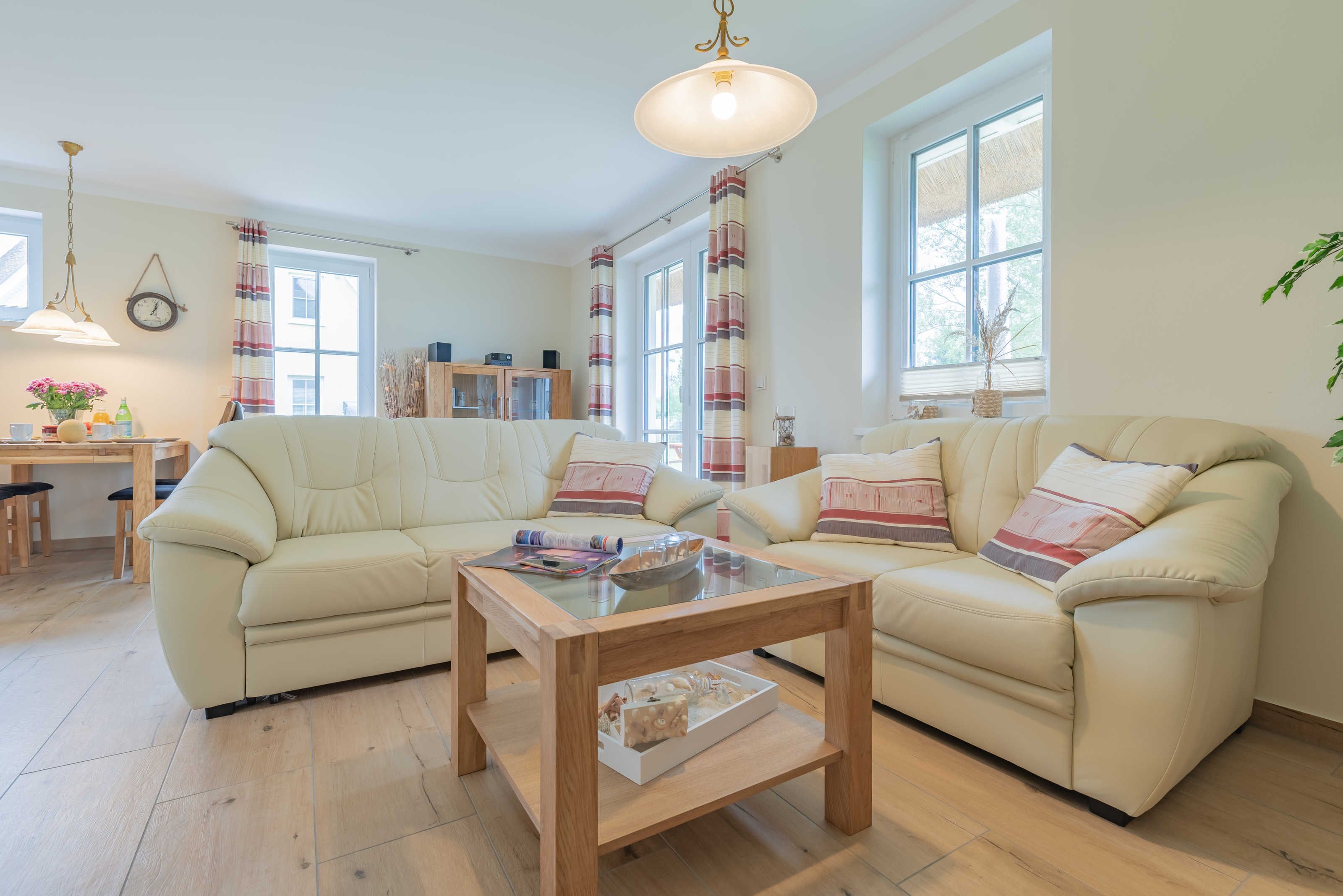 Die gemütliche Couchecke im Wohnbereich eignet sich ideal zum entspannen nach einen ausgedehnten Strandspaziergang.