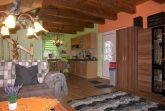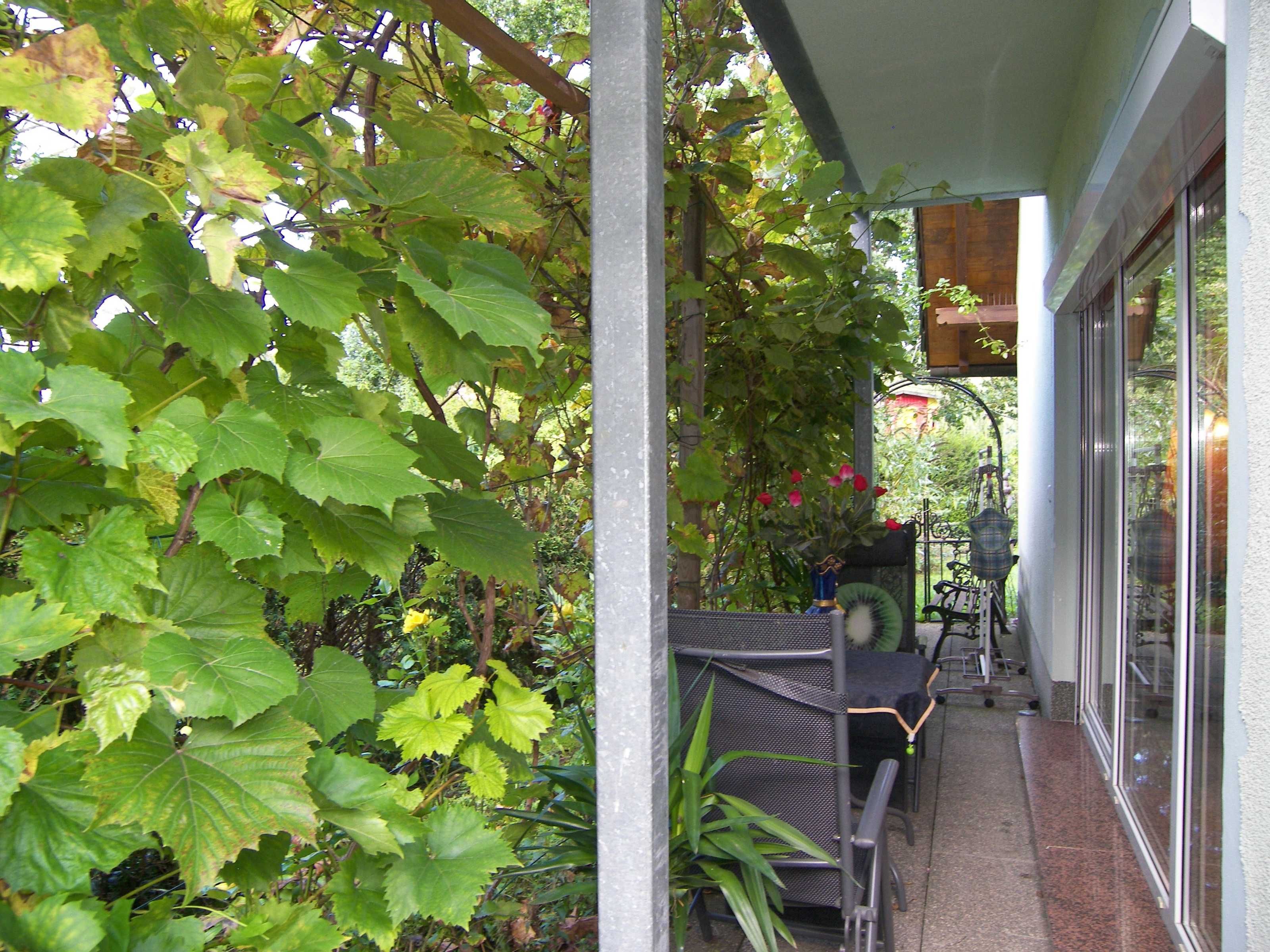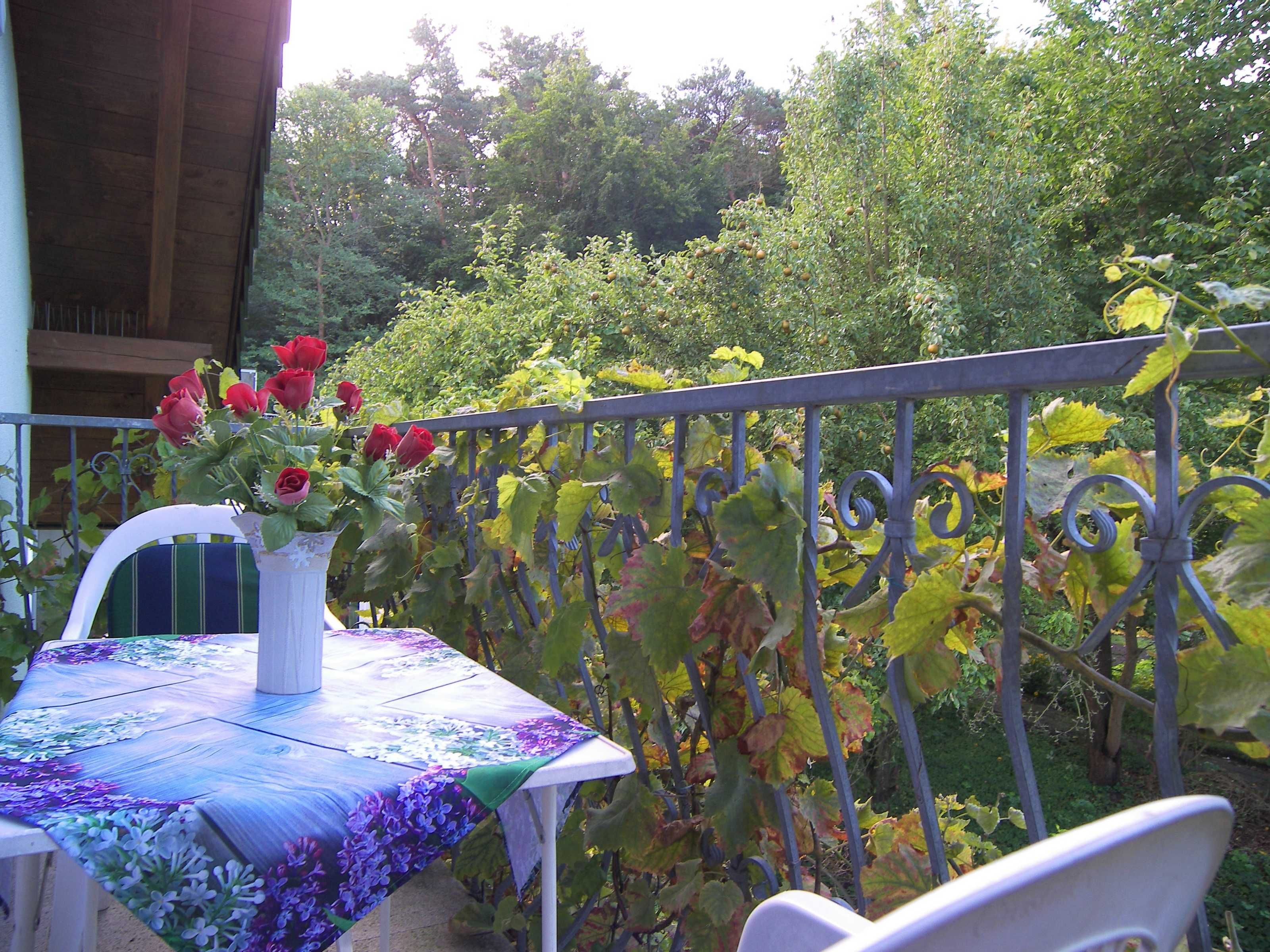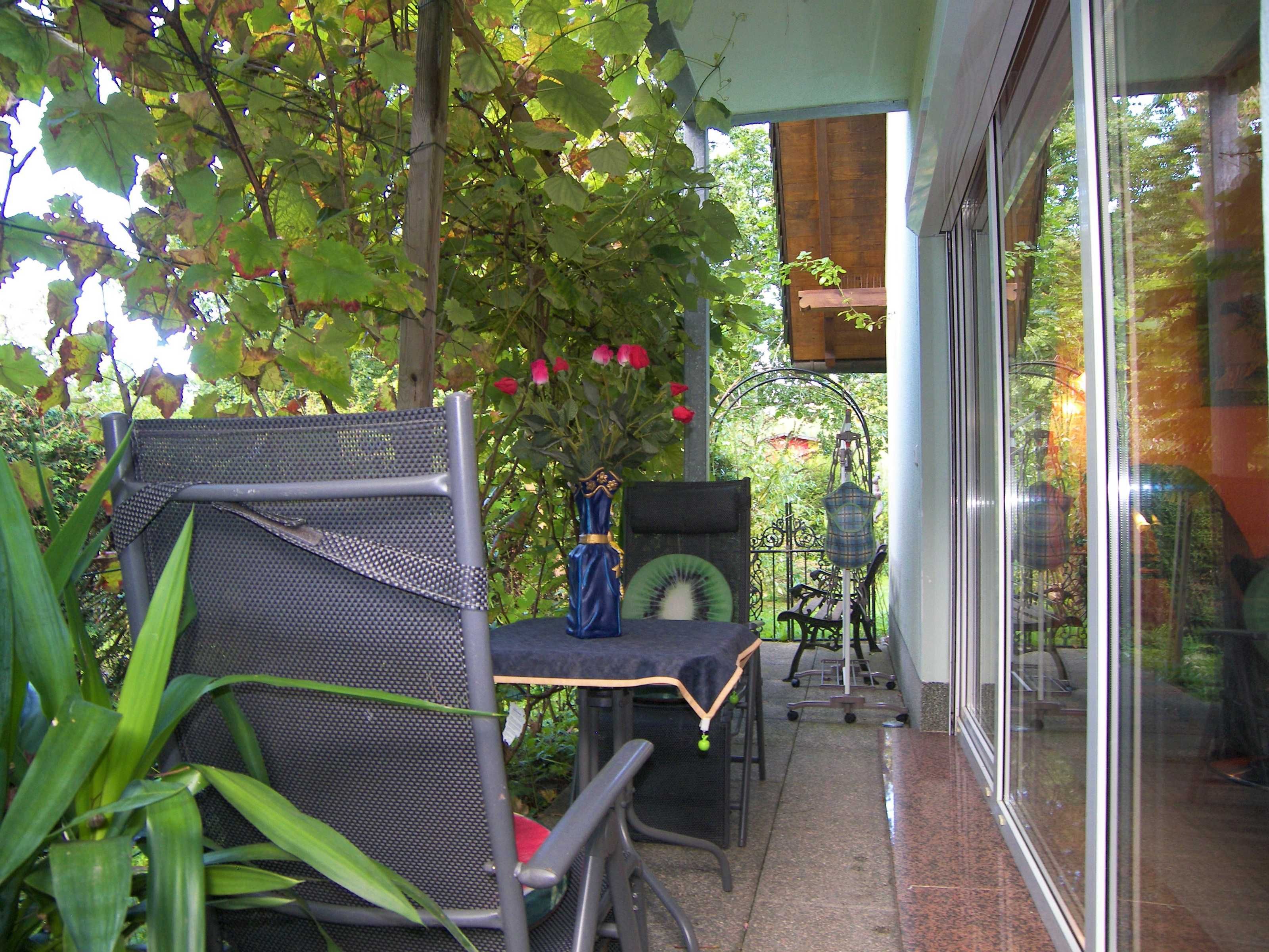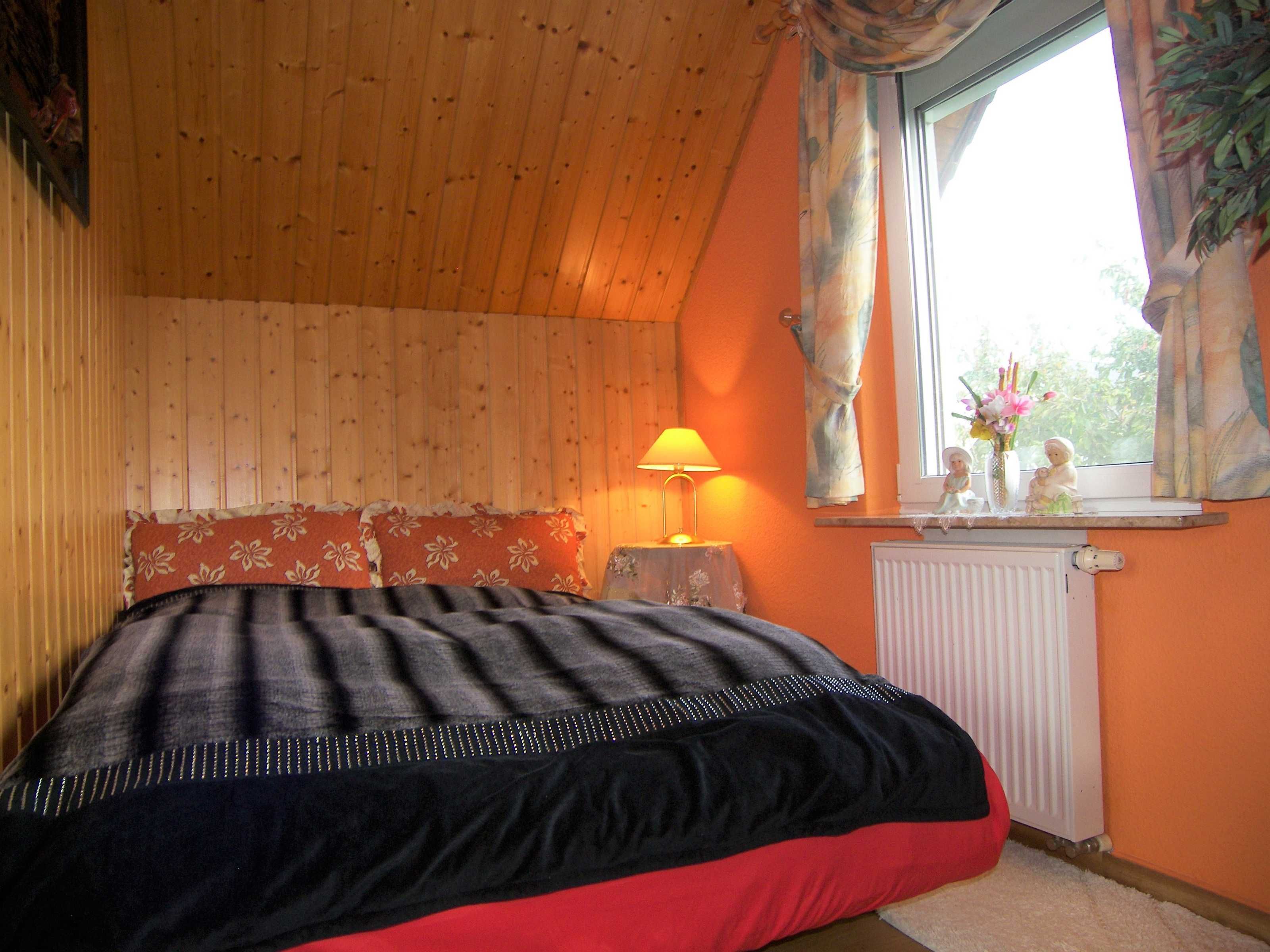 Über eine Treppe erreicht man das Obergeschoss (nicht durch eine Tür abgetrennt). Hier befinden sich ein Schlafraum mit einem Doppelbett (1,80 x 2,00 m), eine Sitzgruppe mit Tisch und ein zweites TV-Gerät. Von diesem Zimmer hat man zutritt zum Balkon mit einem schönen Blick ins Grüne.
