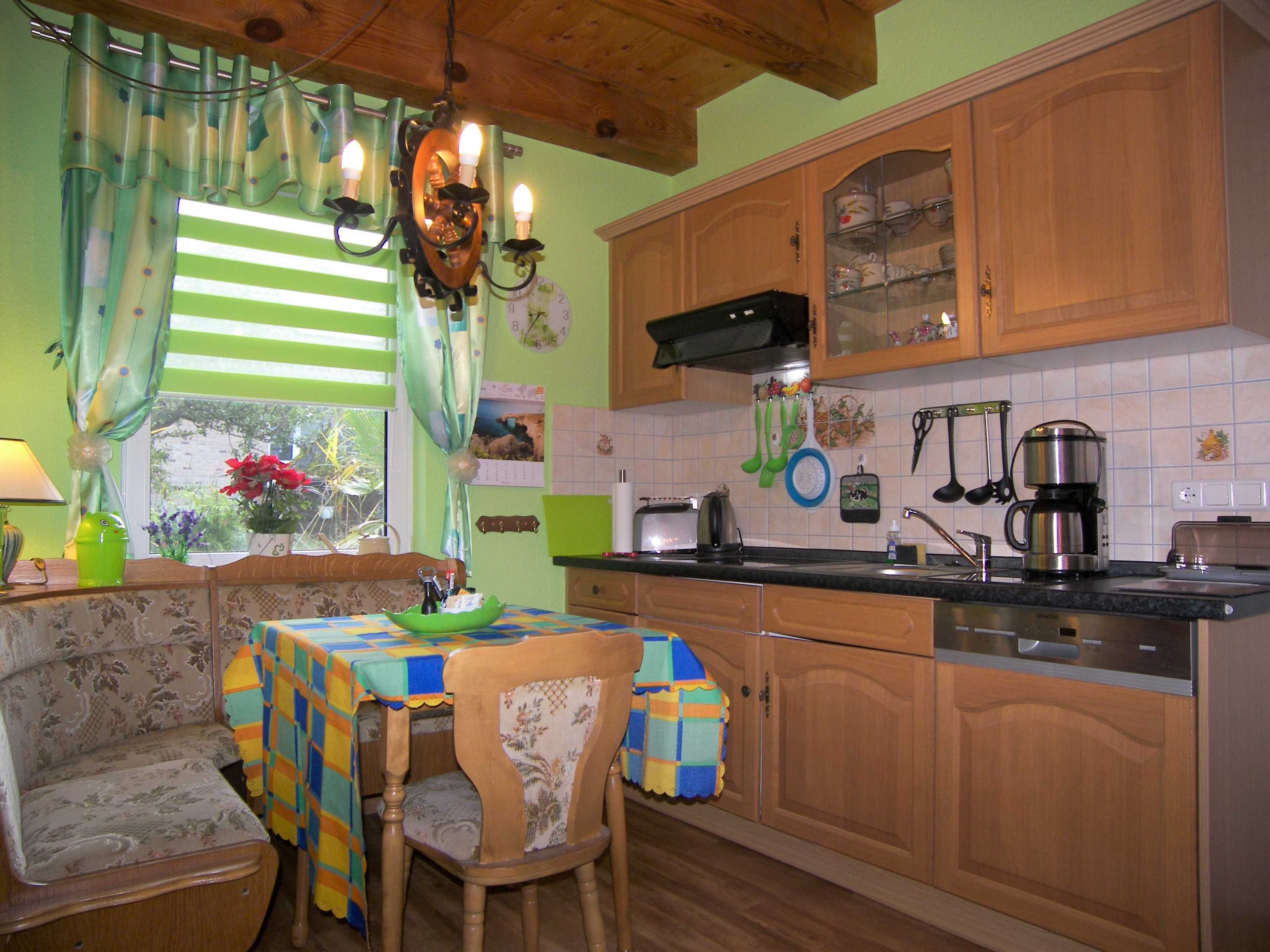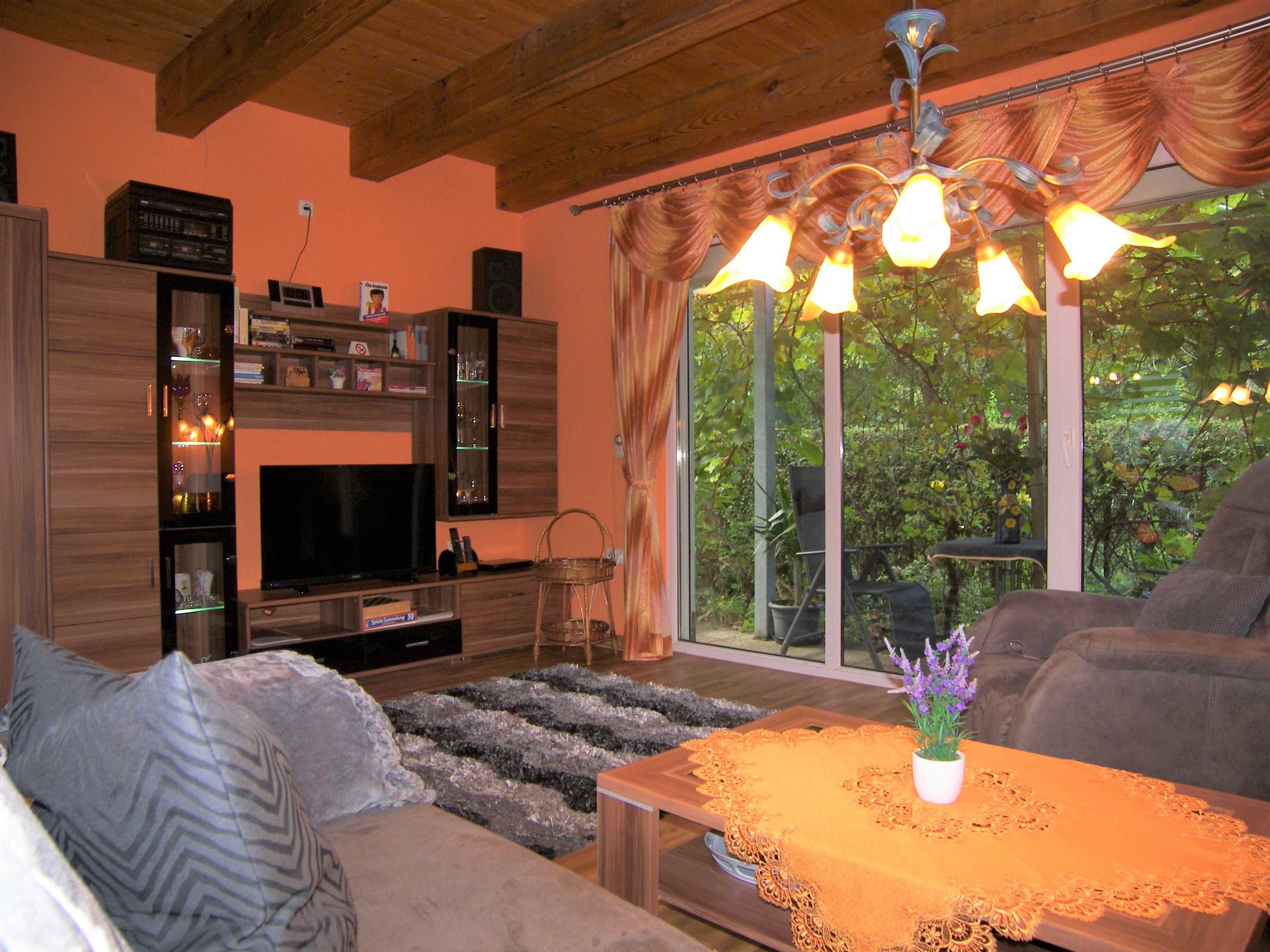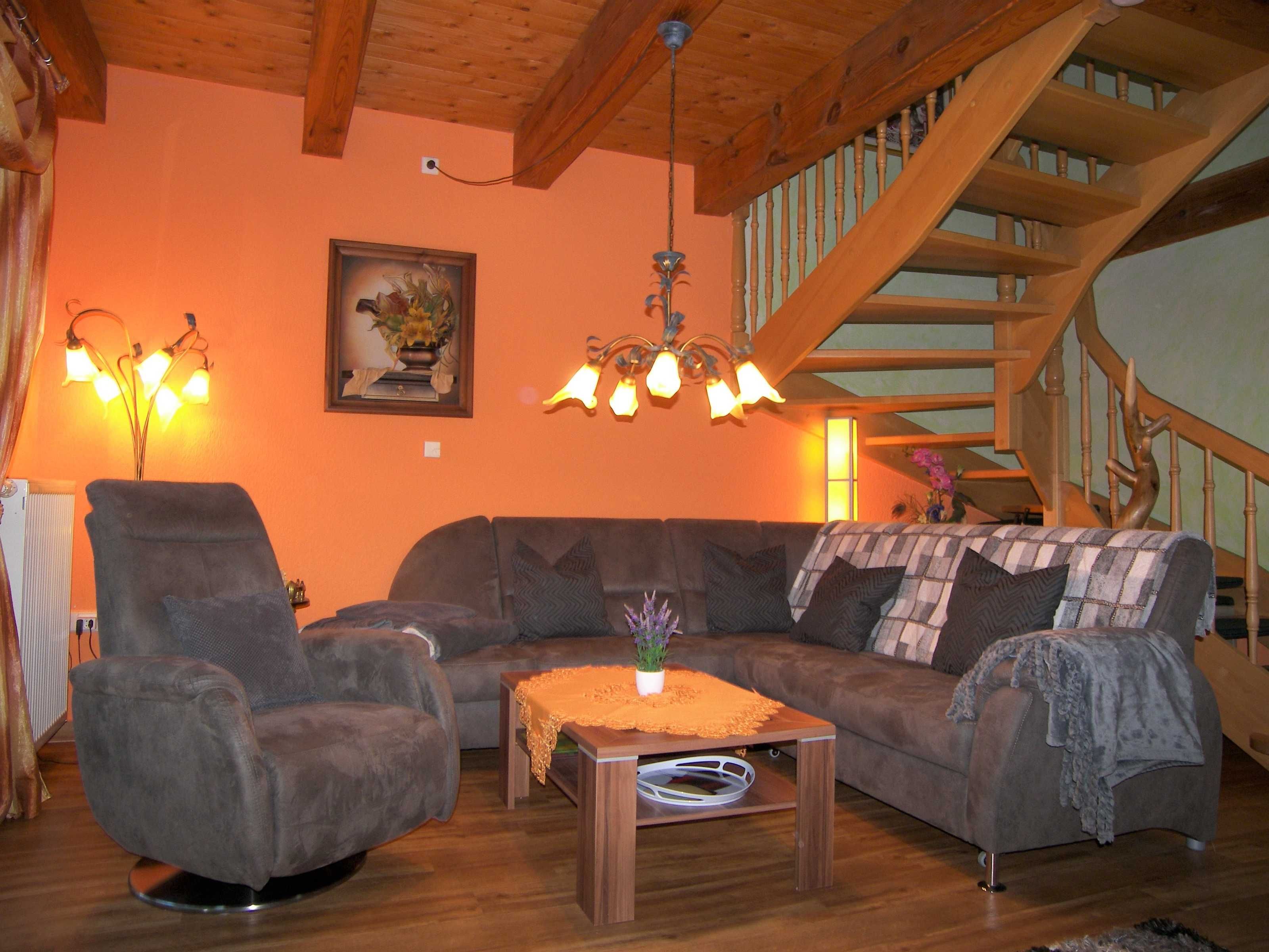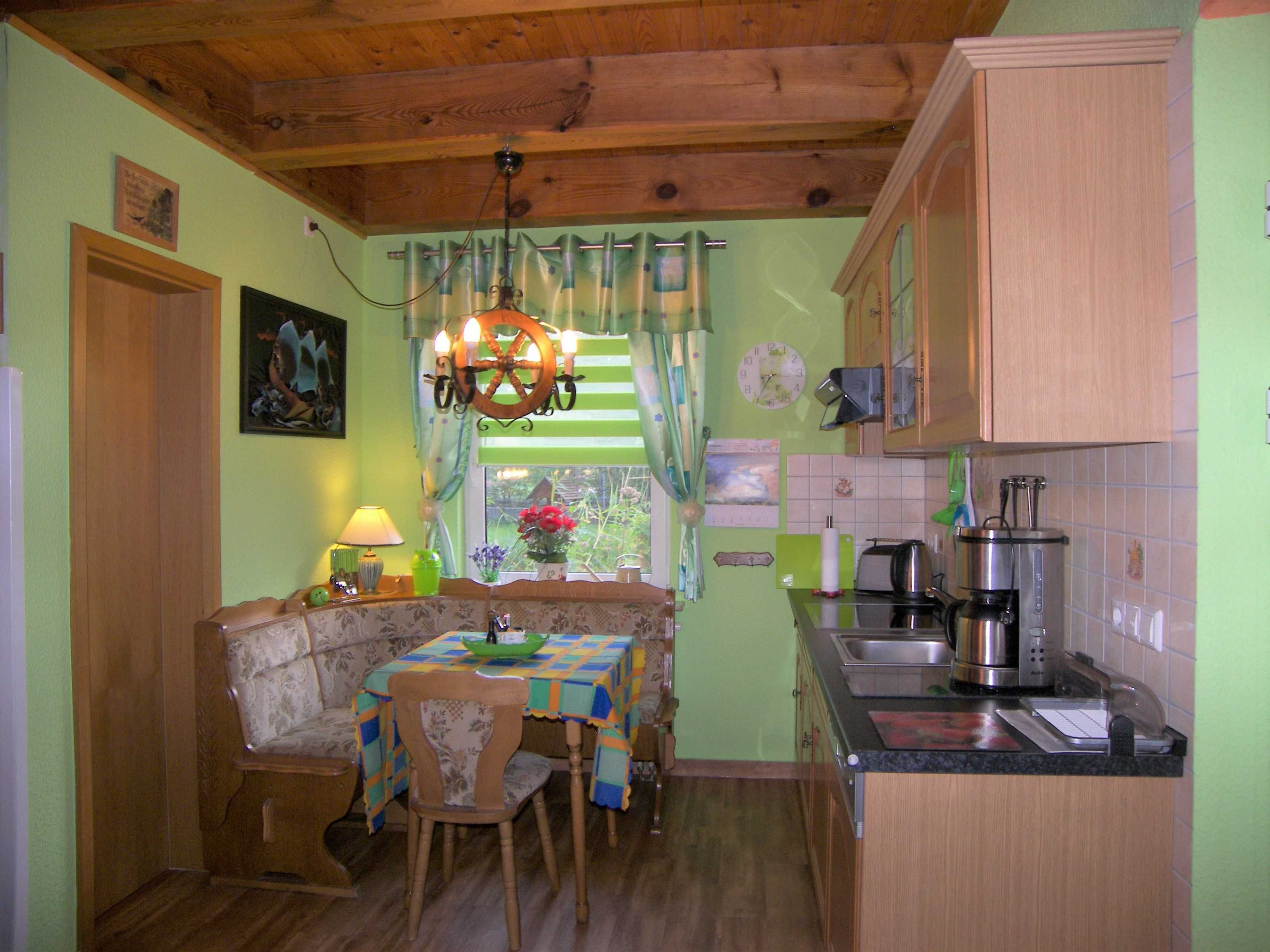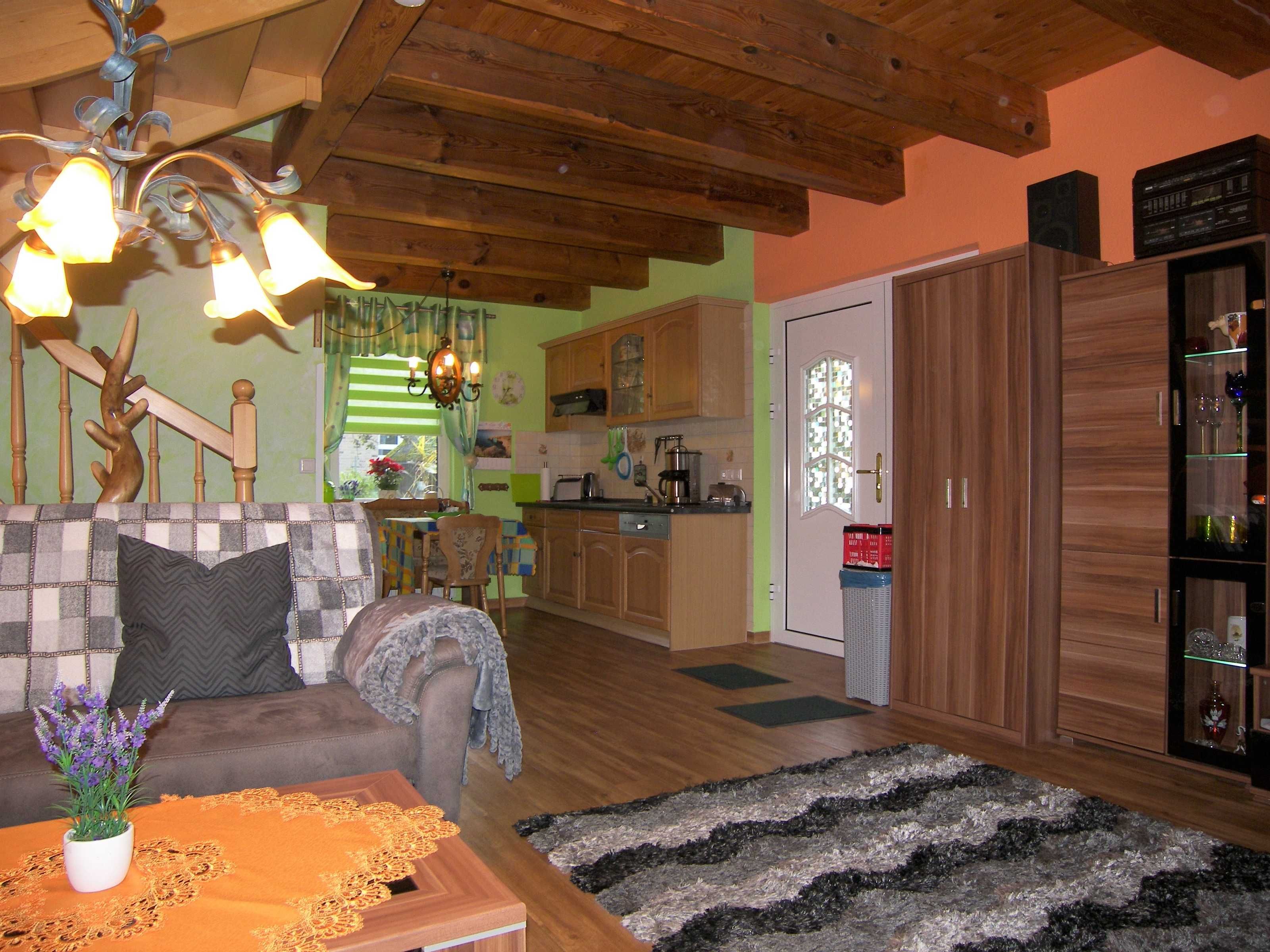 Das Ferienhaus ist ca. 80 qm groß und erstreckt sich über zwei Etagen. Es verfügt im Erdgeschoss über einen geräumigen Wohnraum mit einer Couchsitzgruppe und einer Schrankwand mit SAT-TV, Blue-Ray- und DVD-Player sowie einer Stereoanlage. Eine kleine Auswahl an Büchern, Spielen, CDs und DVDs sind vorhanden. Im Erdgeschoss befindet sich weiterhin eine Küchenzeile mit Geschirrspüler, 4-Platten-Herd, Toaster, Kaffeemaschine, Wasserkocher und Geschirr. Neben der Küchenzeile befindet sich eine rustikale, gemütliche Sitzecke mit Esstisch. Das Bad, ebenfalls im Erdgeschoss, verfügt über Dusche, WC und Haartrockner.