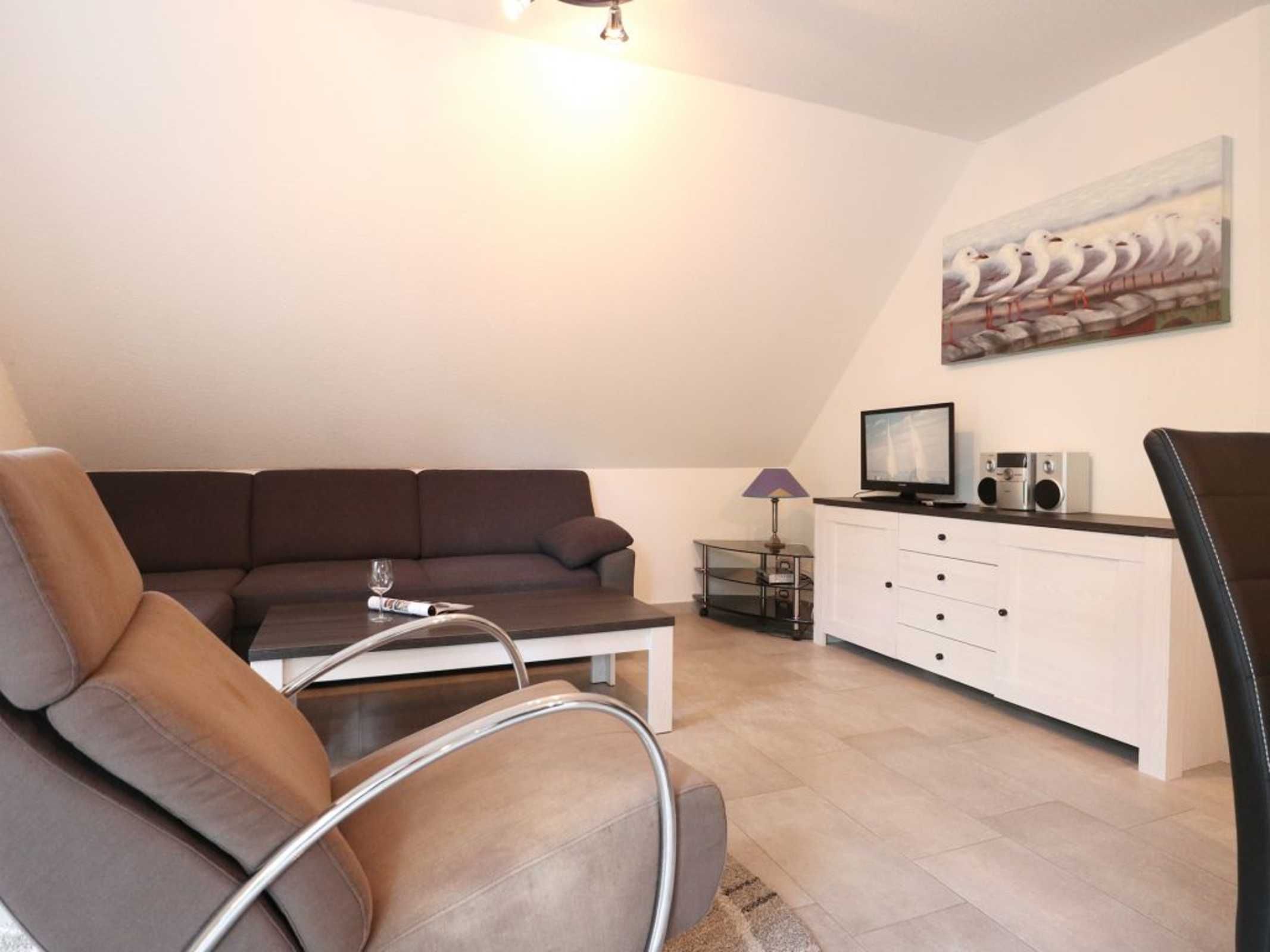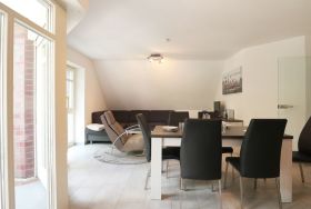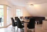 Diese tolle 4 -Zimmer Meerblick Maisonettenwohnung mit zwei Balkonen und zwei Bädern, befindet sich im 2.Obergeschoss des Hauses. Mit einer großzügigen Wohnfläche von 90qm ist die Ferienwohnung für eine Belegung mit max. 6 Personen geeignet. Im modern möblierten Wohn-Essbereich mit Balkonzugang, erwartet Sie ein bequemes Sofa mit Ruhesessel, ein Esstisch sowie Fernseher, Musikanlage und gebührenfreies WLAN sind ebenfalls vorhanden. Ideal für die Eigenversorgung ist die integrierte, voll ausgestattete Wohnküche mit: Ceranfeldherd, Backofen, Mikrowelle, Dunstabzug, Kühlschrank mit integr. Frostfach, Geschirrspüler, Toaster, Kaffeemaschine, Wasserkocher usw. Ihre Mahlzeiten nehmen Sie am Esstisch zu sich, oder Sie genießen den saisonal möblierten Balkon in nördliche Ausrichtung. Zudem befinden sich auf der unteren Wohnebene zwei separate Schlafzimmer. Das erste Schlafzimmer ist sehr geräumig und verfügt über ein Doppelbett, Kleiderschrank, Kommode, Sitzgelegenheit, Fernseher. Im zweiten Schlafzimmer erwartet Sie ein Doppelbett, Kleiderschrank, Schreibplatz. Auch ein Tageslichtbad mit Wanne, Dusche, Waschtisch, WC befindet sich auf dieser Ebene.