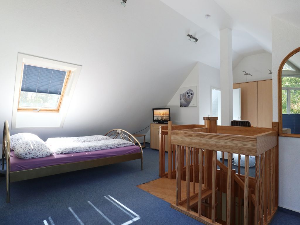 Über eine Wendeltreppe gelangen Sie in den oberen Wohnungsbereich mit einem weiteren Balkon. Hier steht ein dritter Schlafbereich zur Verfügung mit Doppelbett, Sitzgelegenheiten und Fernseher. Idealerweise befindet sich auf dieser Etage ein zweites Tageslicht Duschbad, Waschtisch, WC. Kinderreisebett und Kinderhochstuhl gehören zur Ausstattung.