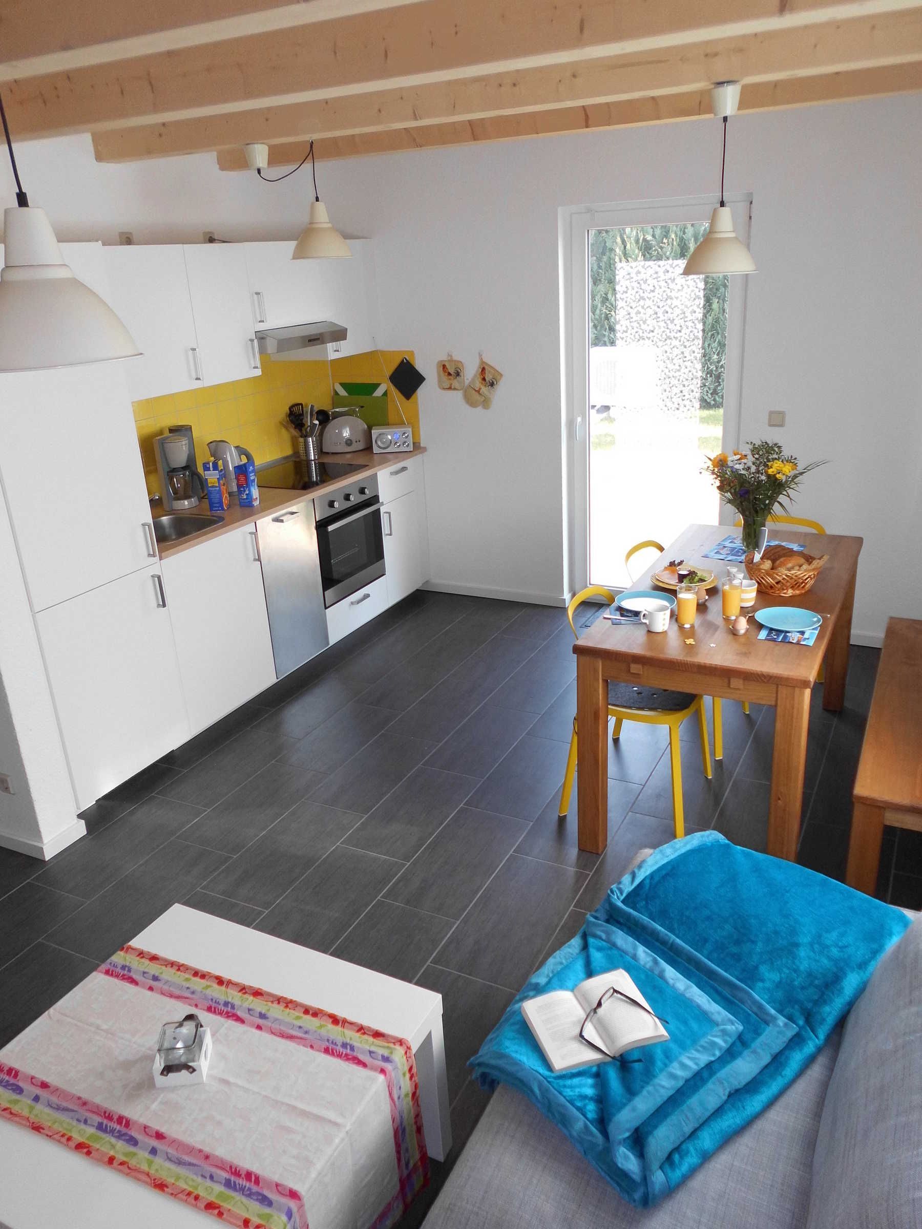 Haus Sonne verfügt über eine komplett ausgestattete Einbauküche mit Kühl- bzw. Gefrierschrank, Geschirrspülmaschine sowie Herd mit Ceran-Kochfeld inkl. Backofen. Weiterhin stehen u.a. ein Wasserkocher, ein Toaster, ein Eierkocher, eine Kaffeemaschine und ein Radio zur Verfügung.