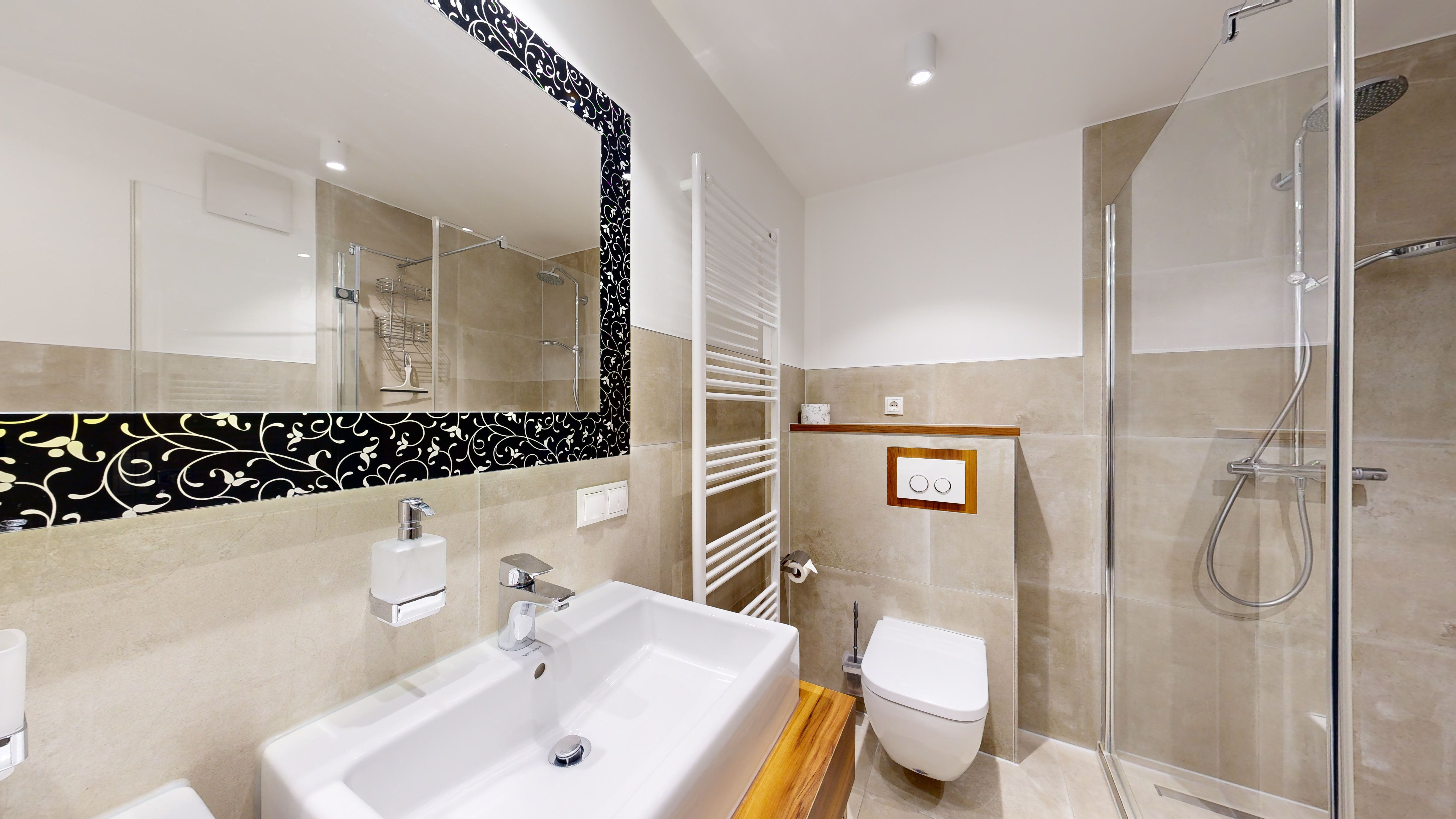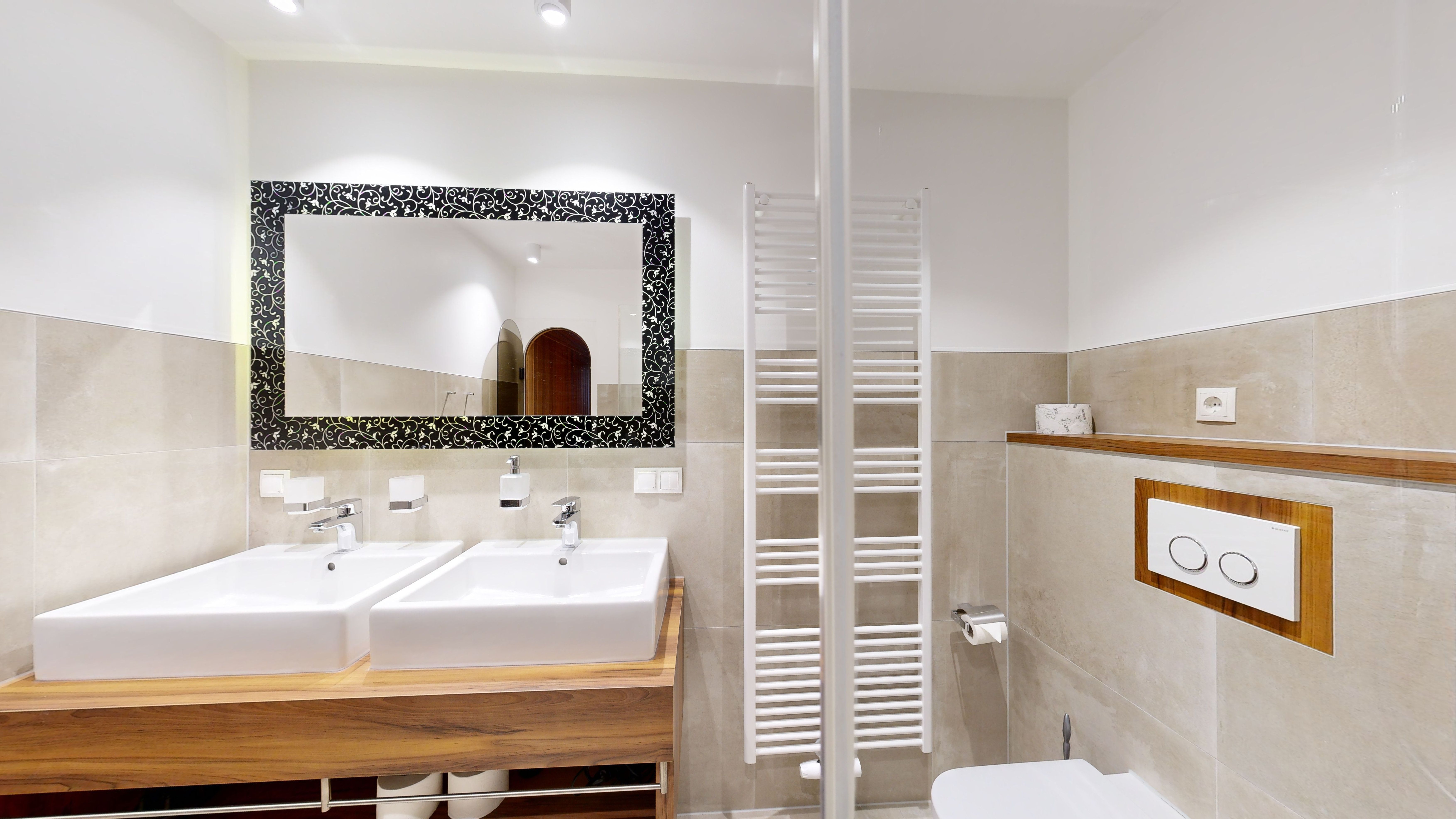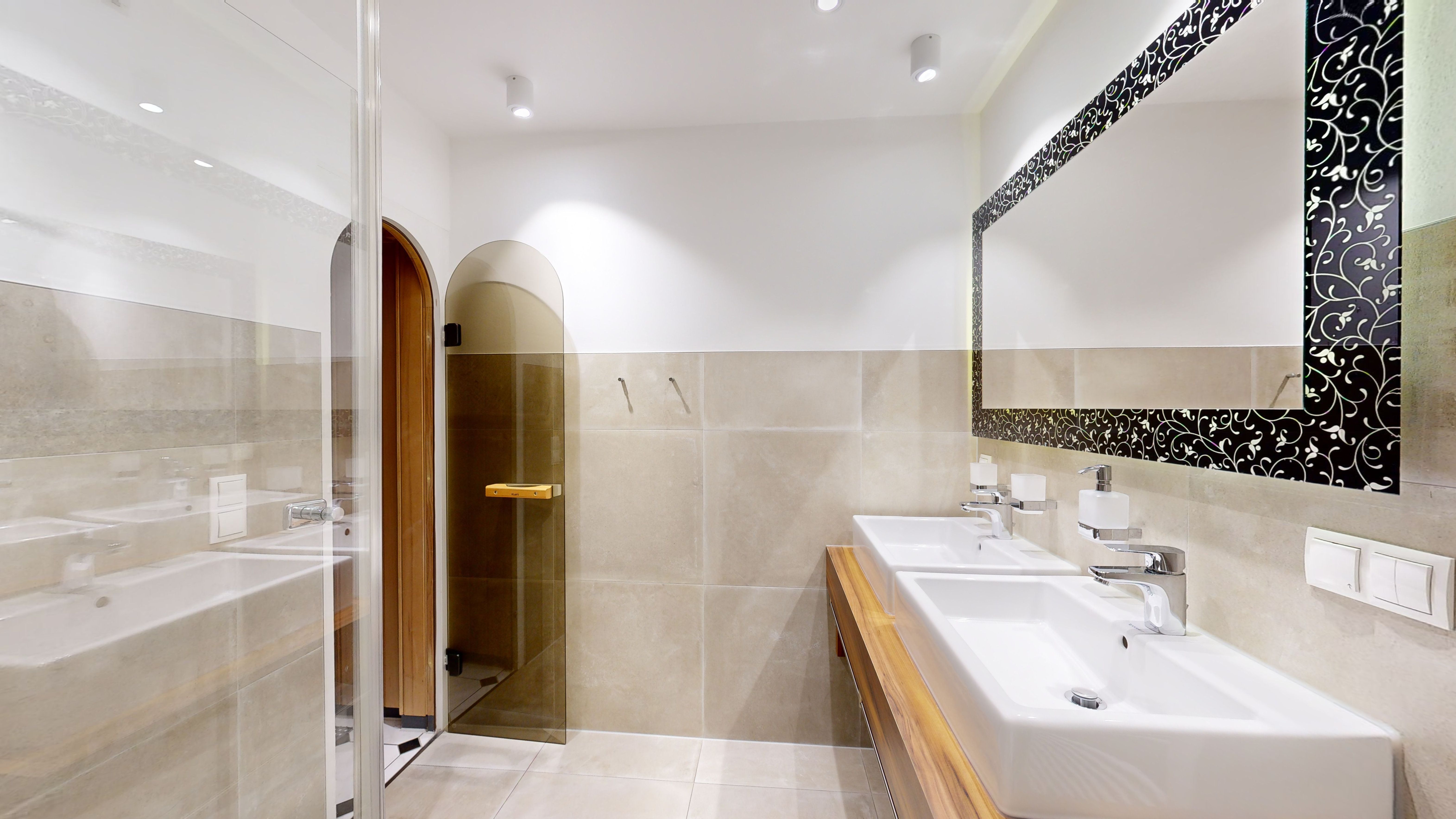 Ein großes Badezimmer mit Doppelwaschbecken, Dusche, Föhn, WC und Sauna