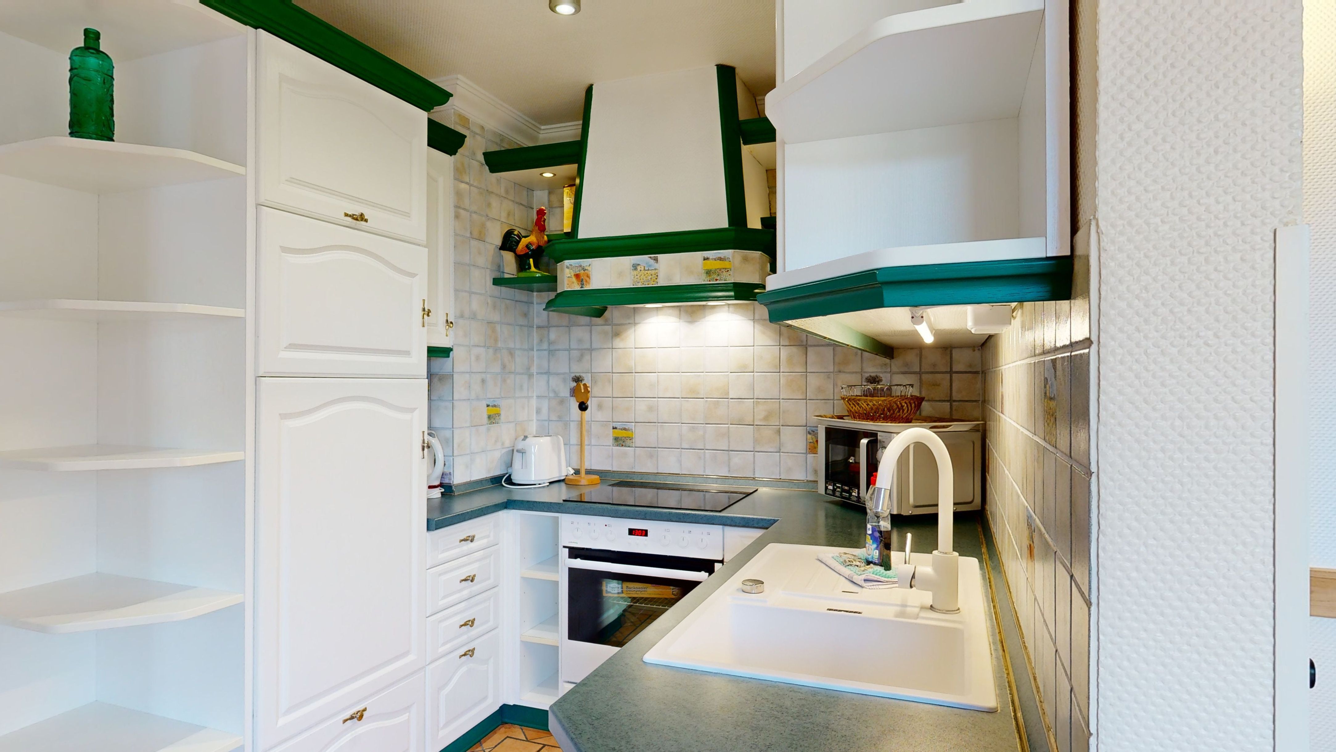 Komfortable Küche: Ceran-Herd mit Backofen, Spülmaschine, Mikrowelle, Gefriermöglichkeit, Kaffeemaschine, Toaster und Wasserkocher