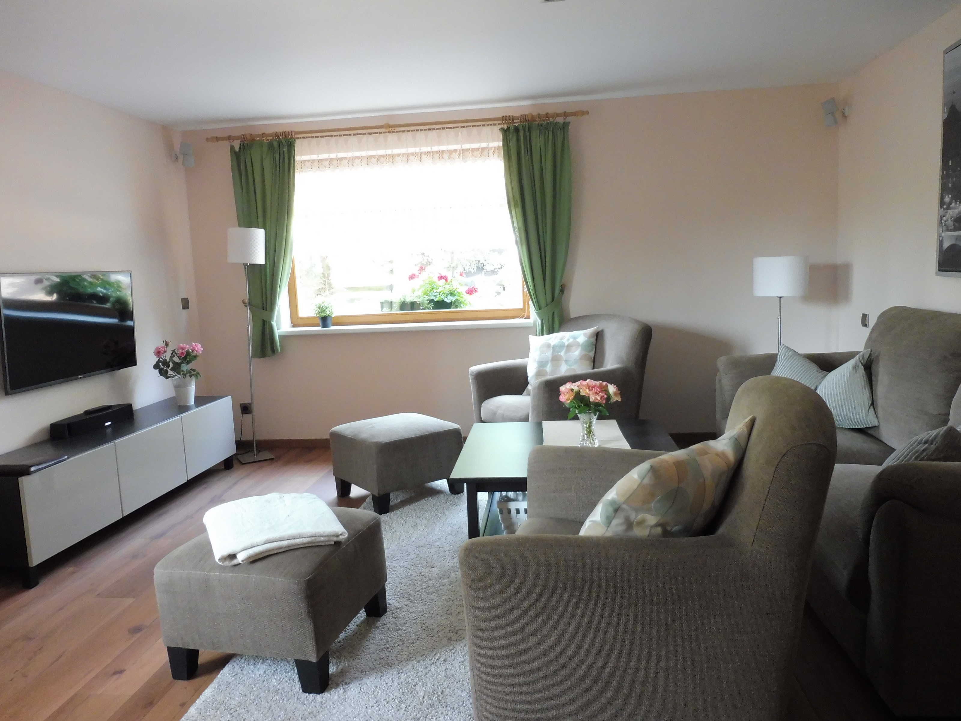 Die ruhige Lage und das gemütliche Ambiente der Ferienwohnung bieten viel Raum für Erholung. Auf 96m² befinden sich liebevoll eingerichtete Zimmer für max. 4 Personen. Es erwarten Sie 2 komfortable Schlafzimmer mit TV, 2 moderne Tageslichtbäder mit Dusche, WC und Fön, 1 offener Wohnraum mit Küchenzeile und Essbereich sowie 1 gemütliches Wohnzimmer mit Radio und TV. In der gesamten Wohnung können Sie freies Wlan nutzen. Die 2 überdachten Terrassen sind mit den Gartenliegen und –möbeln eine Ruhe-Oase zum Genießen. Die Gartensauna ist nicht Inclusiv und wird nach Absprache vergeben. Für PKW und Fahrräder sind kostenfreie Stellplätze vorhanden.