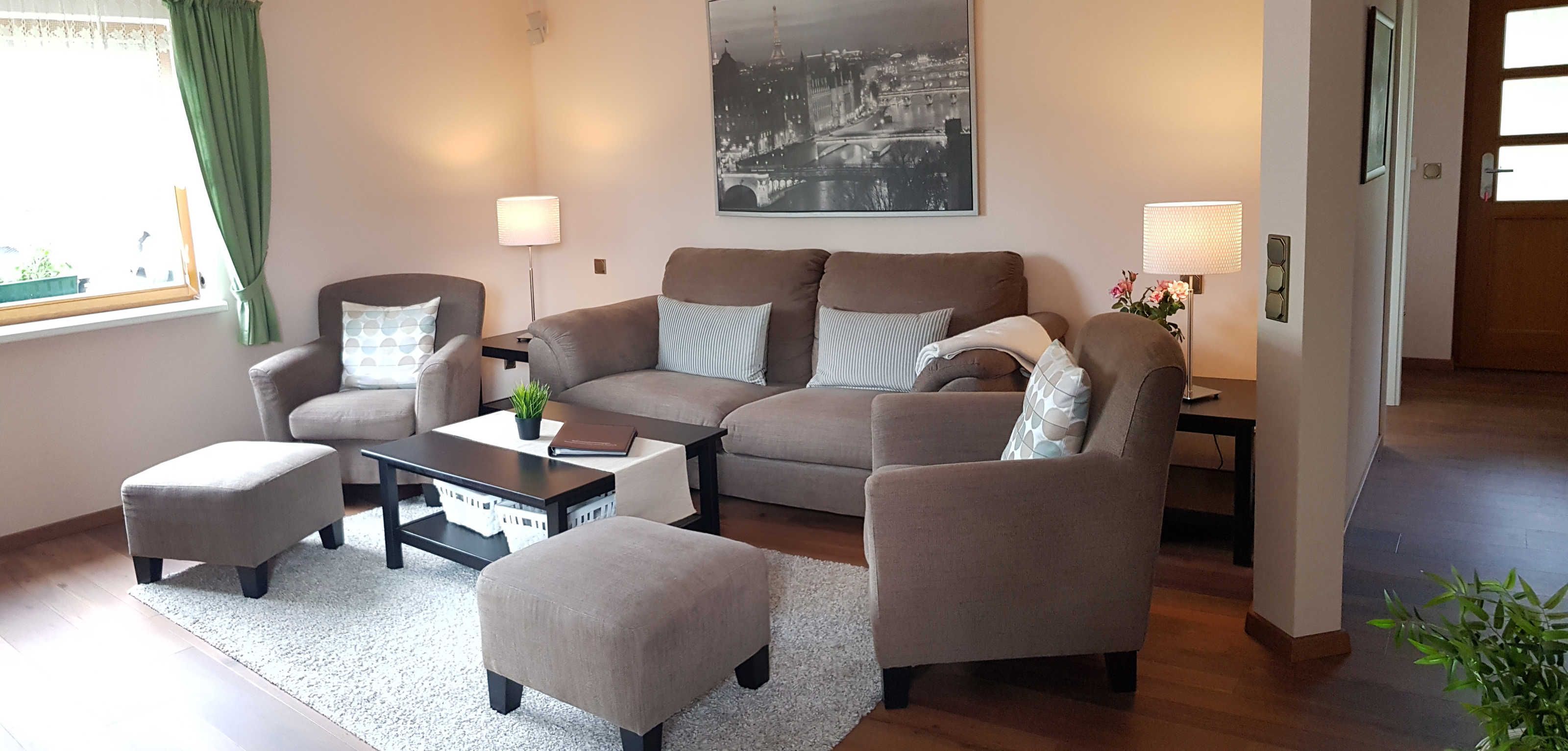 Die Ferienwohnung Knurrhahn befindet sich in einer ruhigen Nebenstraße auf einem gepflegten Privatgrundstück. In gemütlich eingerichteten 96m² können Sie Ihre Privatsphäre genießen.