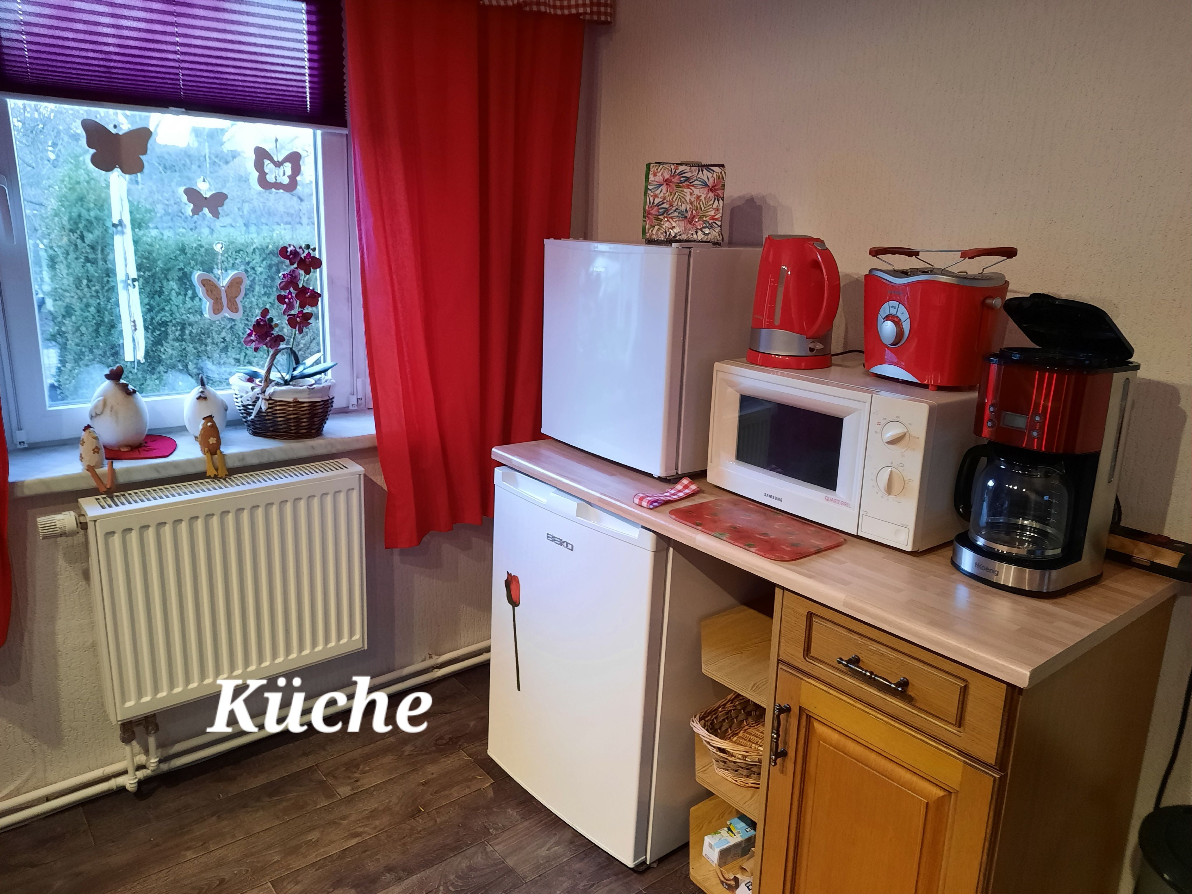 • komplette Küche mit ausreichend Geschirr und Töpfen, Kaffeemaschine und Wasserkocher