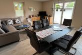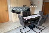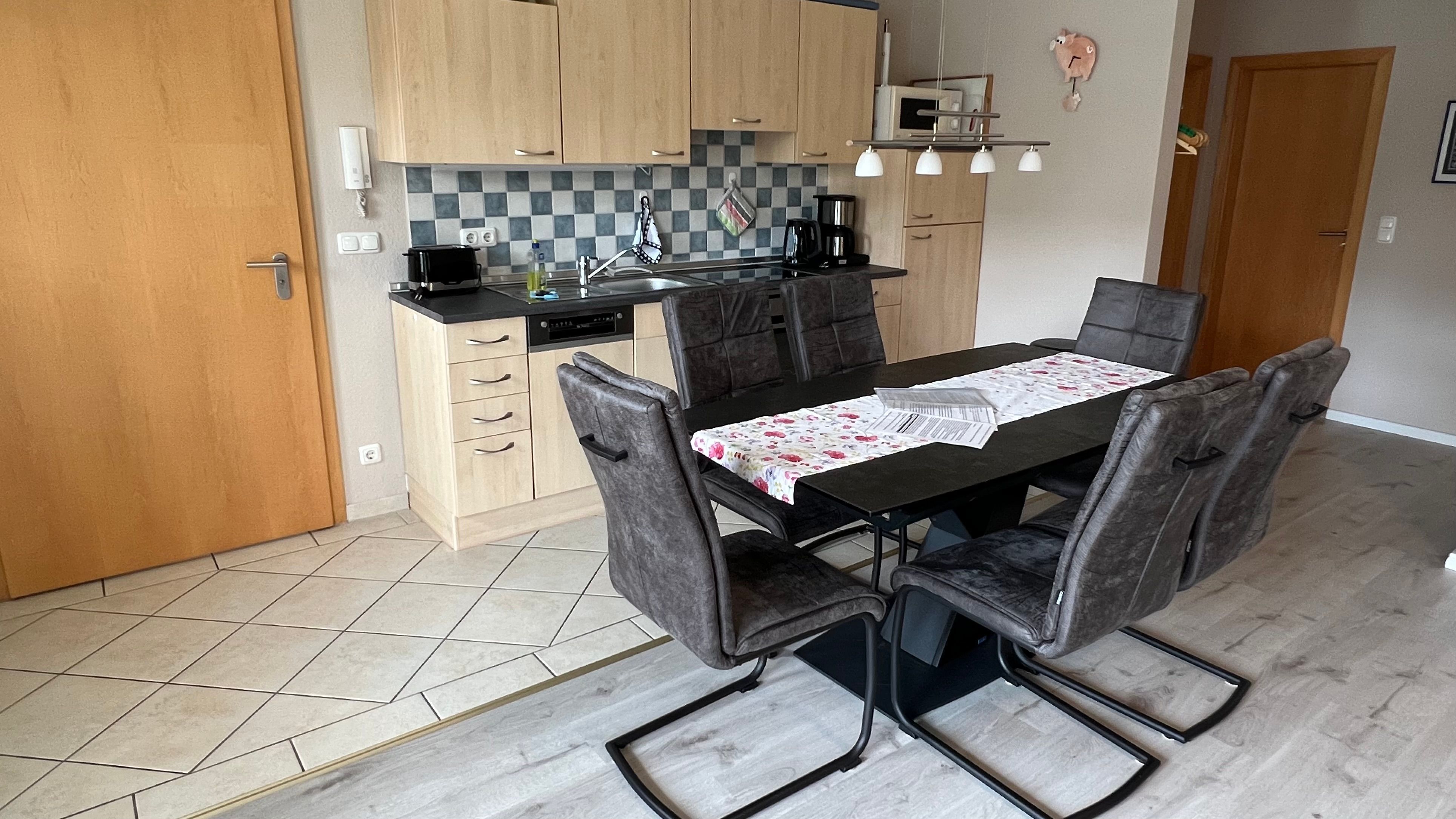 Der angegliederte Essbereich besteht aus einem großen Esstisch mit ausreichend bequemen Stühlen.