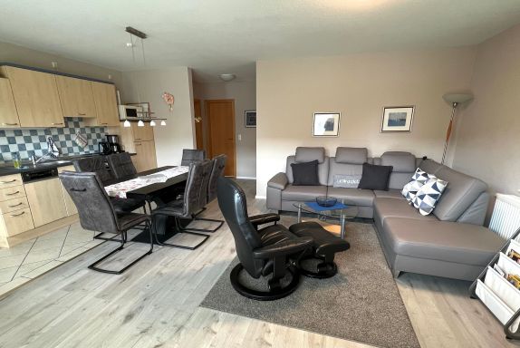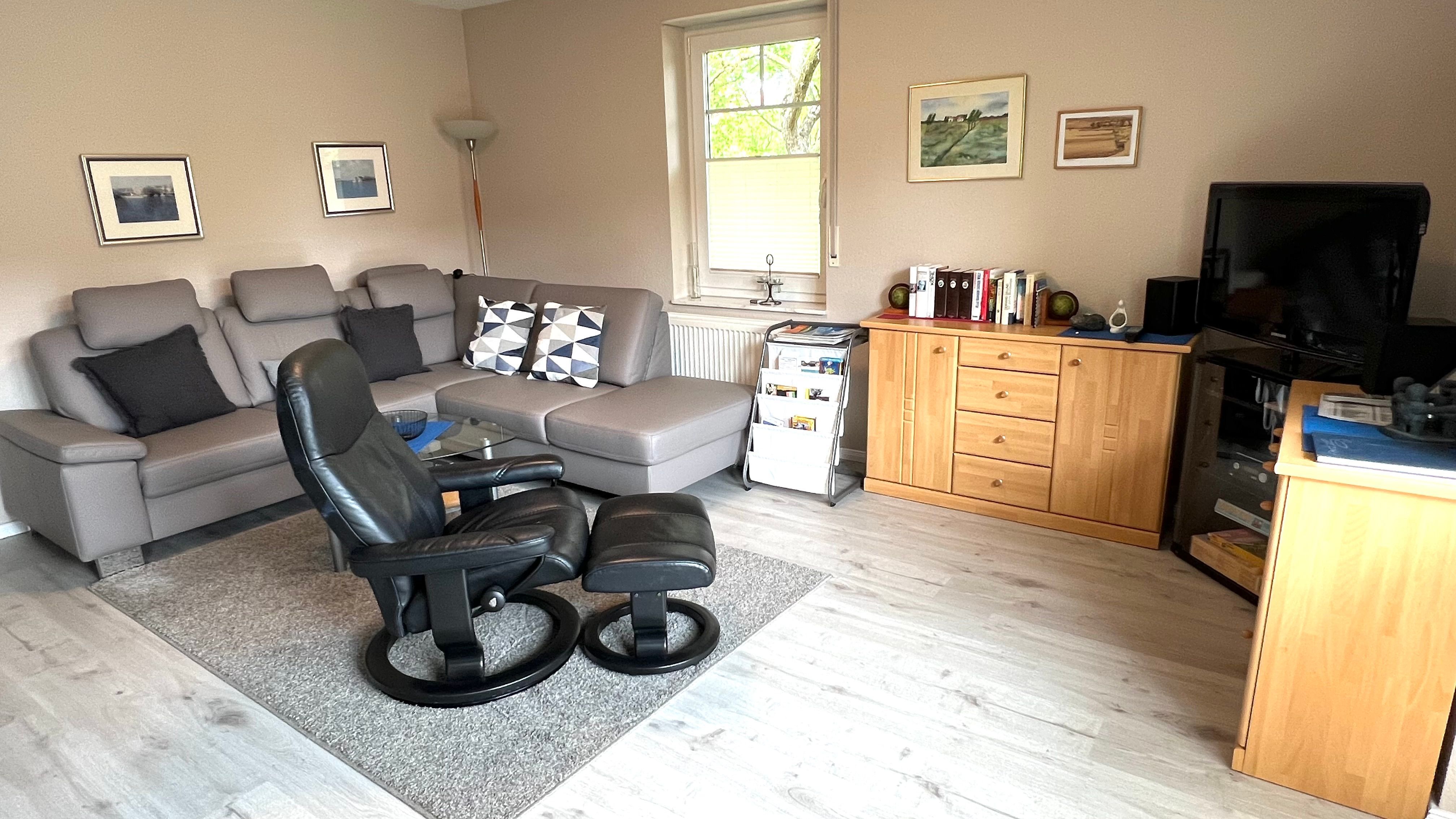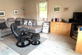 Sie verfügt über einen hellen, lichtdurchfluteten Wohnraum mit Couchecke, Fernsehsessel,Sat- TV und WLAN.