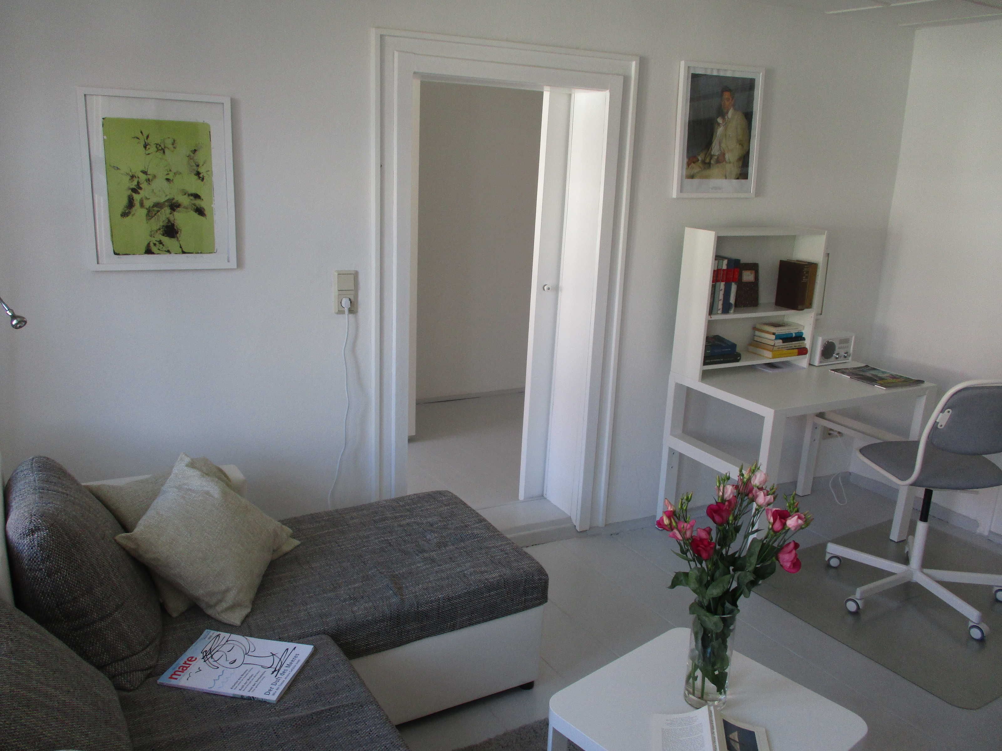 Gemütliche Wohnung mit Blick auf den Markt. 45 m2 für zwei Personen, ganzjährig und gern auch länger mietbar. Direkt über der Friedrich-Wagner-Buchhandlung im Herzen der Ueckermünder Altstadt lädt diese charmante, gemütliche Wohnung zum längeren Aufenthalt. Voll ausgestattet mit Wohnzimmer, Schlafzimmer für 2 (Bett 120x200), Küche, Bad und Arbeitsplatz. Es gibt keinen Fernseher, aber jede Menge gute Bücher und natürlich WLAN. Im romantischen Innenhof lädt eine Terasse zum Verweilen.