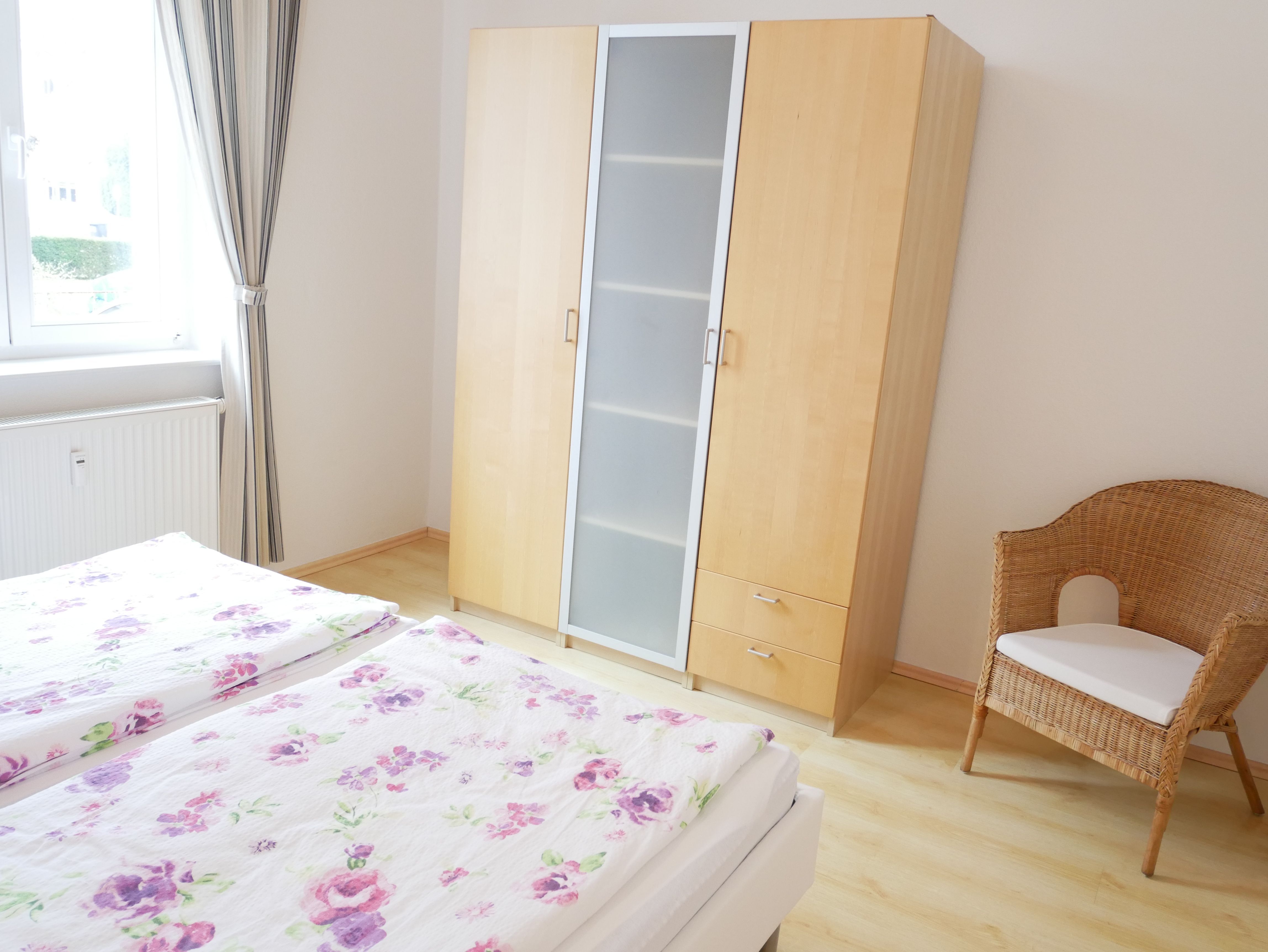 Im Schlafraum finden Sie ein Doppelbett (1,80m x 2,00m), ein Kleiderschrank und einem Rattan Sessel stehen.