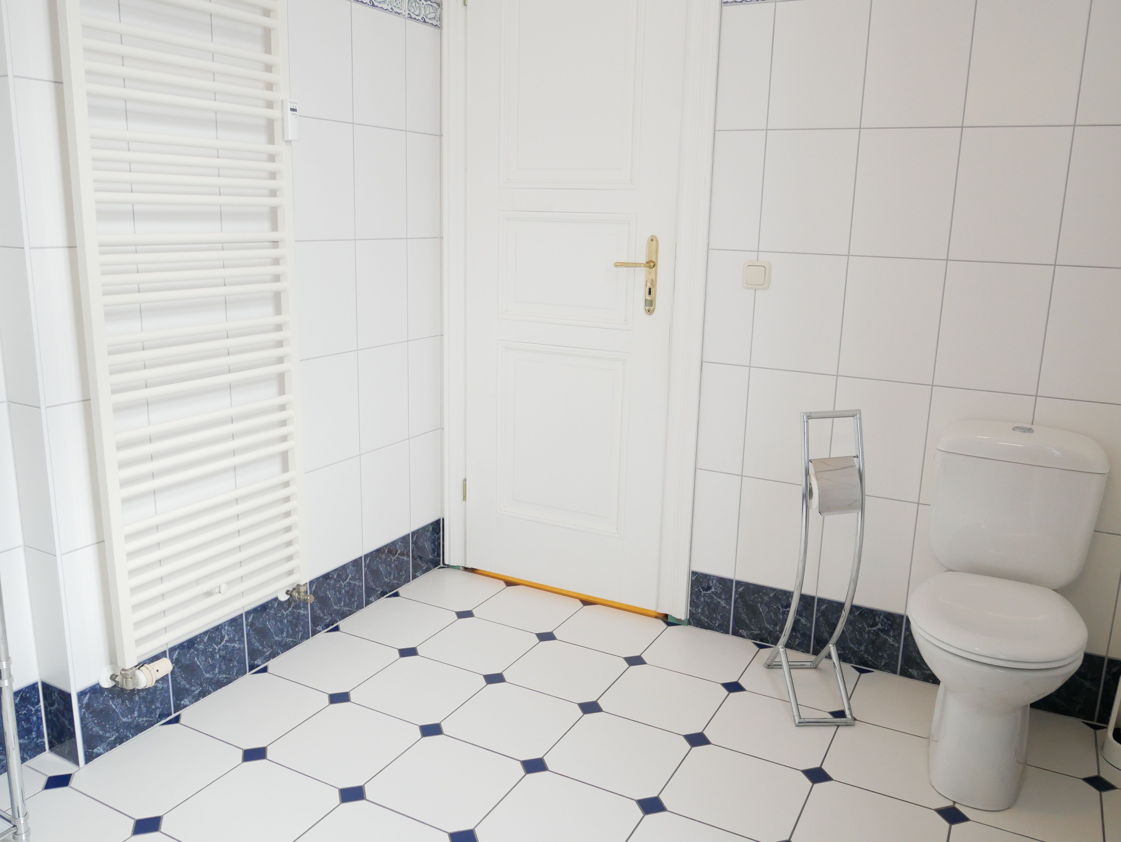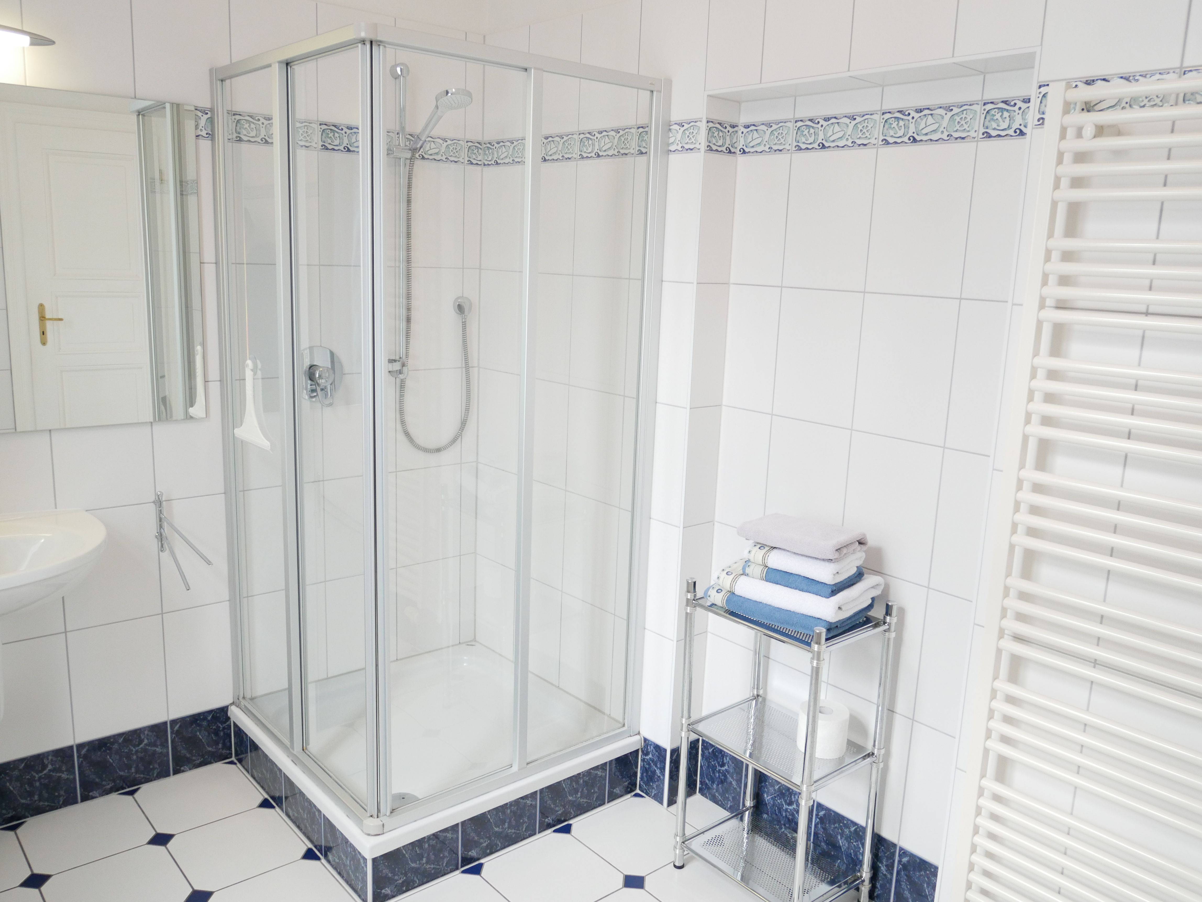 Im Bad befinden sich eine Dusche und WC in den Farben Blau/Weiß.