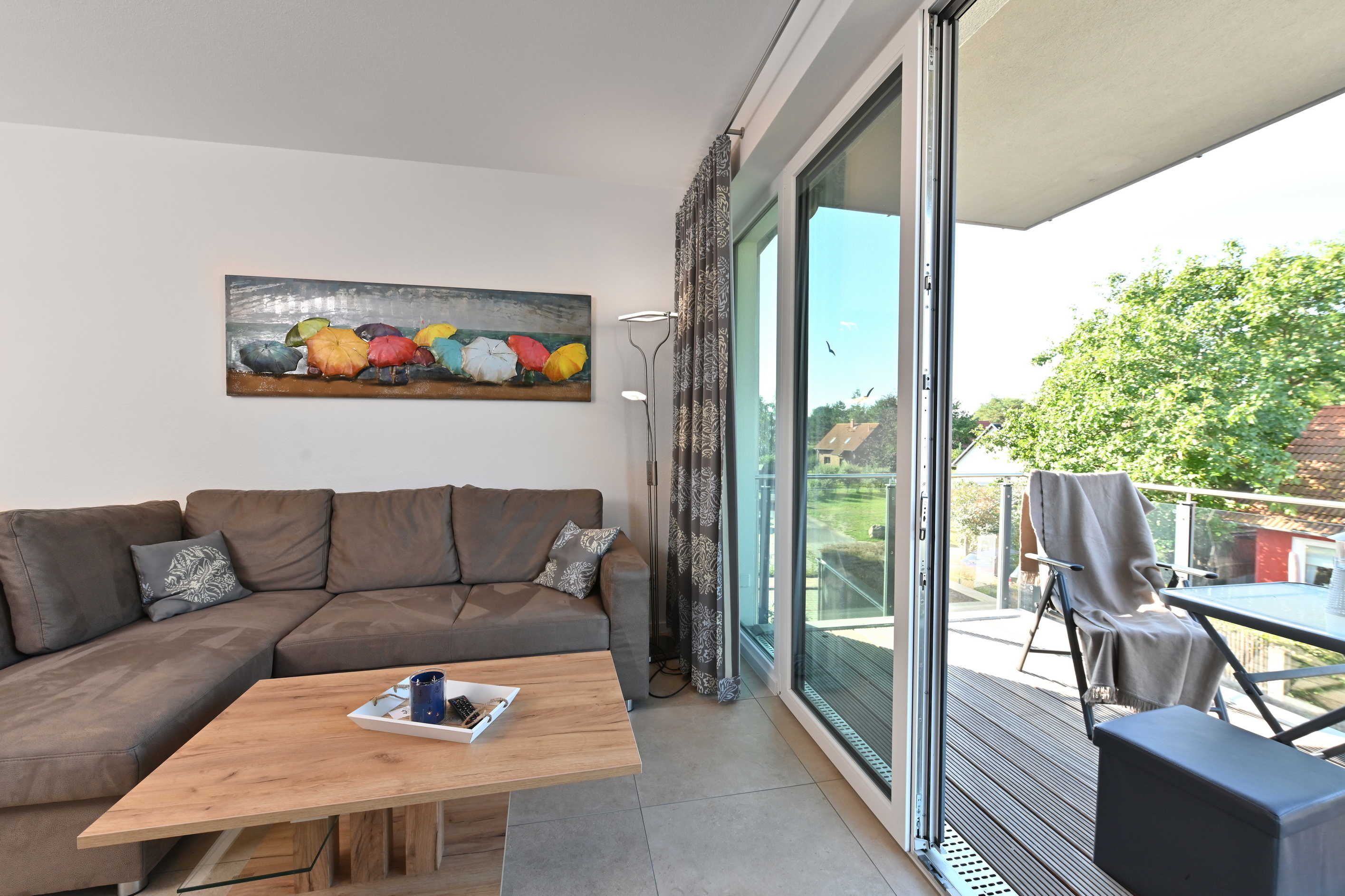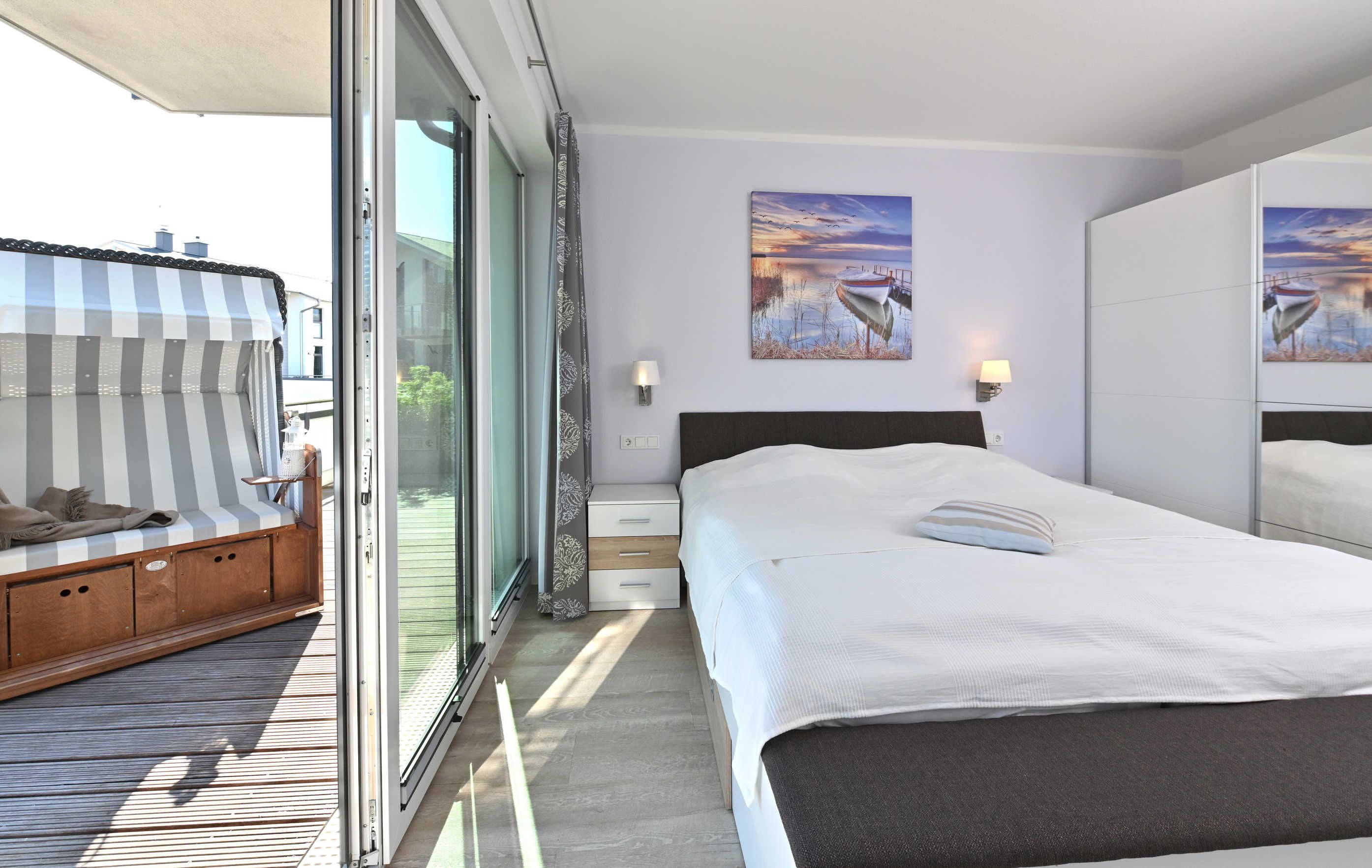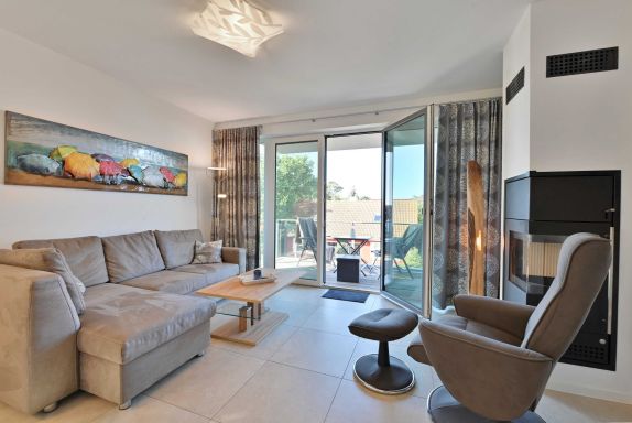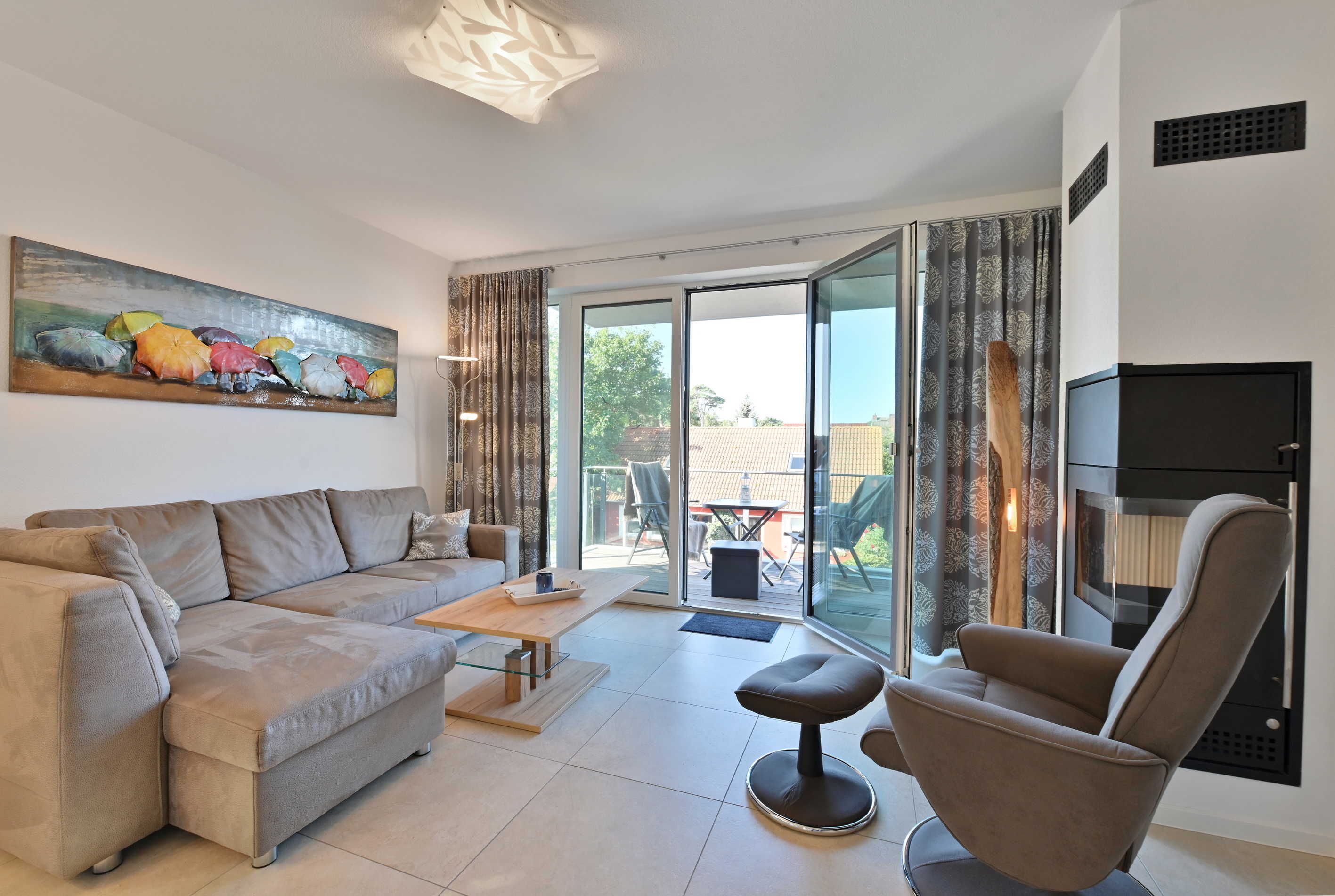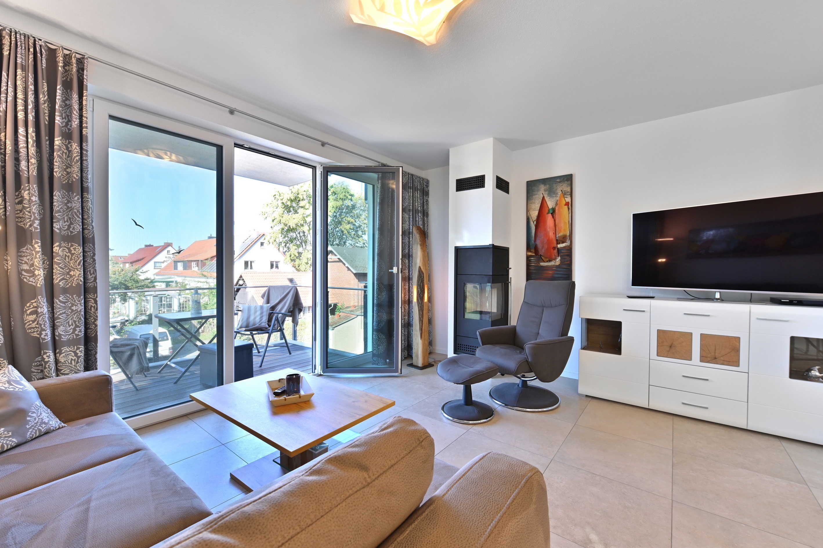 Das Sonnendeck bietet Platz für bis zu 6 Personen (4 Erwachsene und 2 Kinder). Die Wohnung bietet auf 96qm Wohnfläche einen gemütlichen Wohnraum mit integrierter Küche, zwei Schlafräume mit jeweils einem Doppelbett, ein Bad mit Dusche und ein Gäste-WC. Aus allen Räumen erreichen Sie entweder die Terrasse oder den Balkon. Im großzügigen Wohnbereich mit Couchlandschaft mit Schlaffunktion, TV-Gerät und Kamin für gemütliche Stunden ist der Essbereich und eine komfortable Küche integriert. Auf der großen Dachterrasse (61m²) mit Süd-West-Ausrichtung lassen Sie die Seele im Strandkorb baumeln.