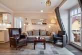 Wohnzimmer mit Couch, Esstisch, Küchenzeile, Kabel-TV, Radio und passwortgeschütztes WLan