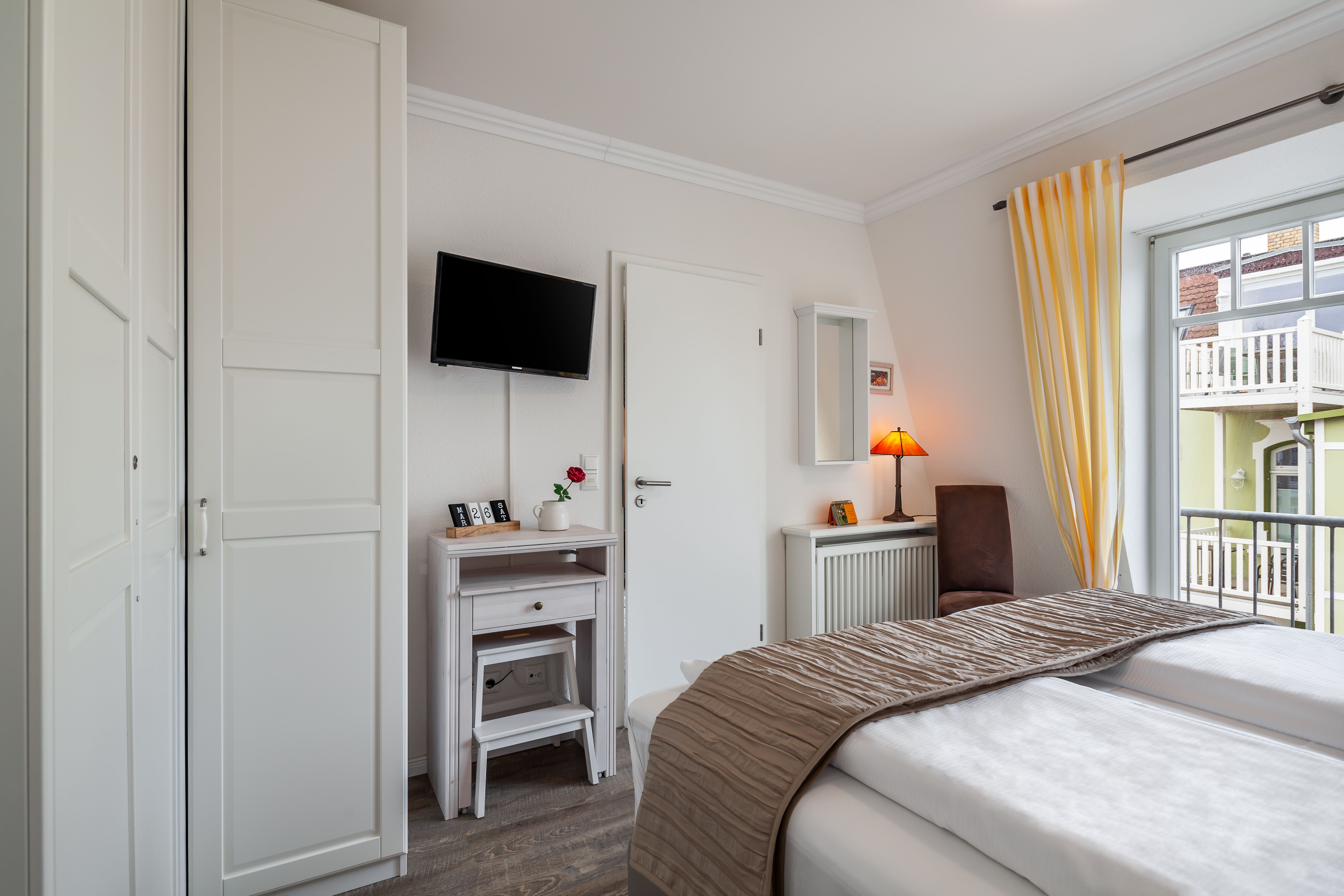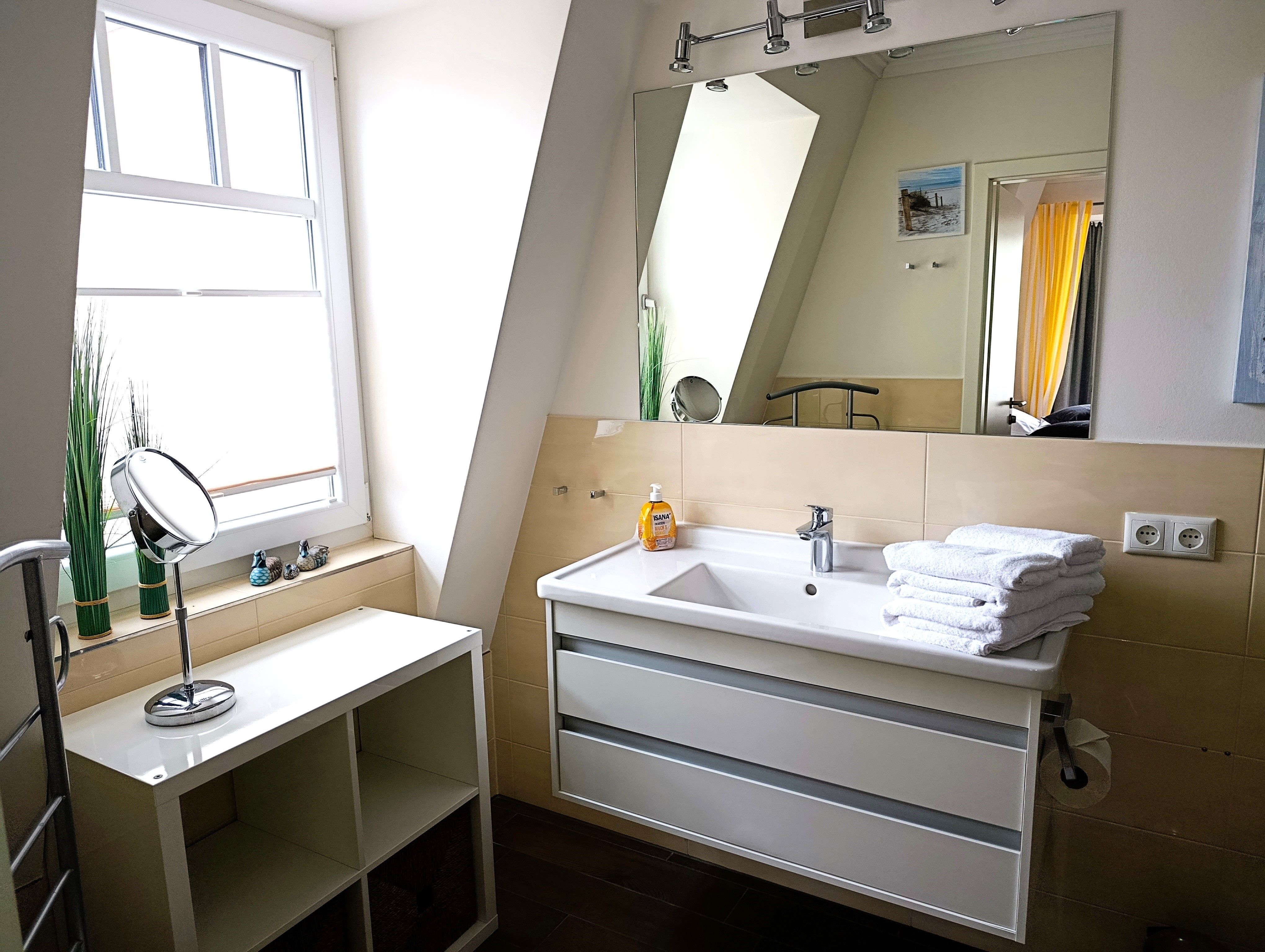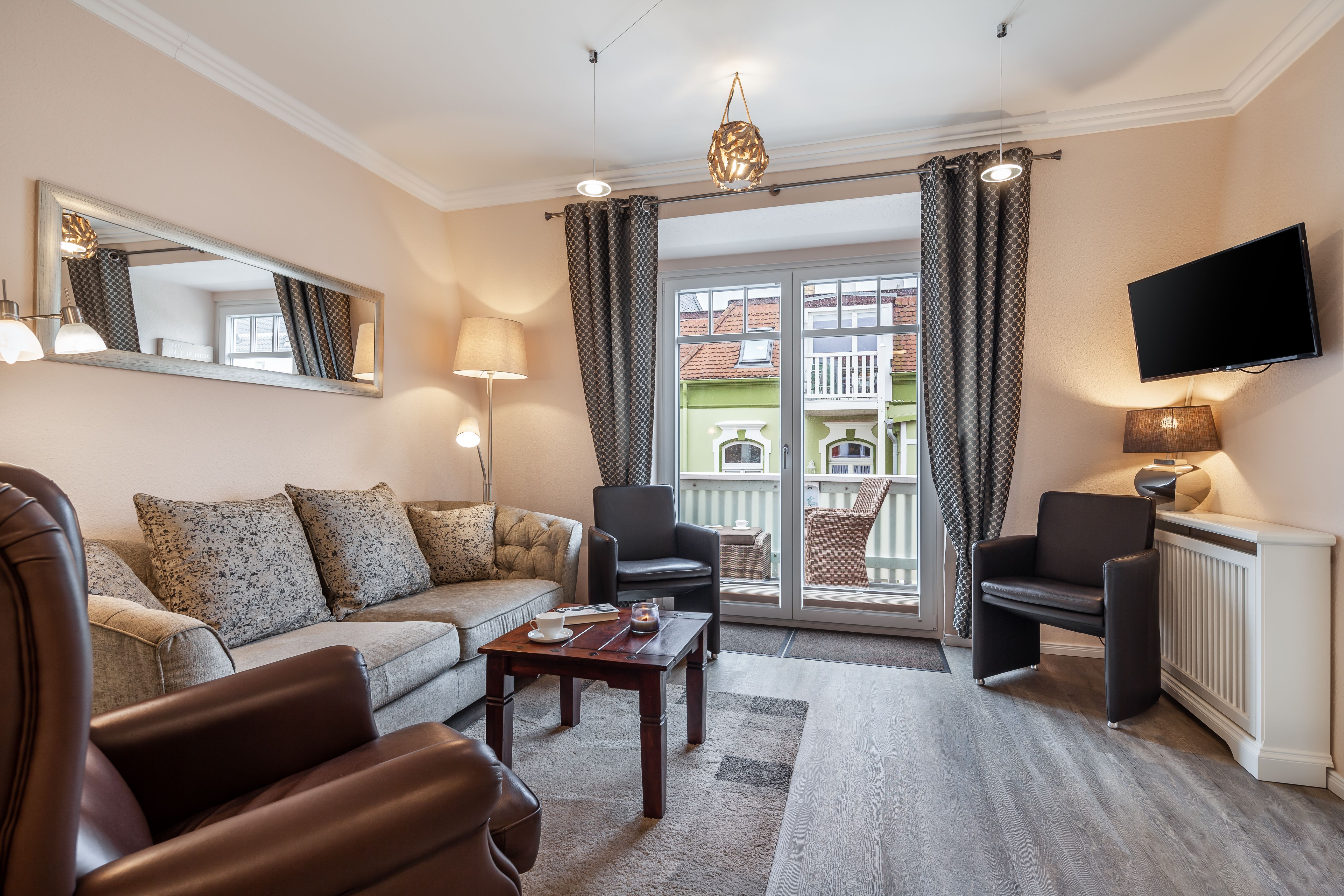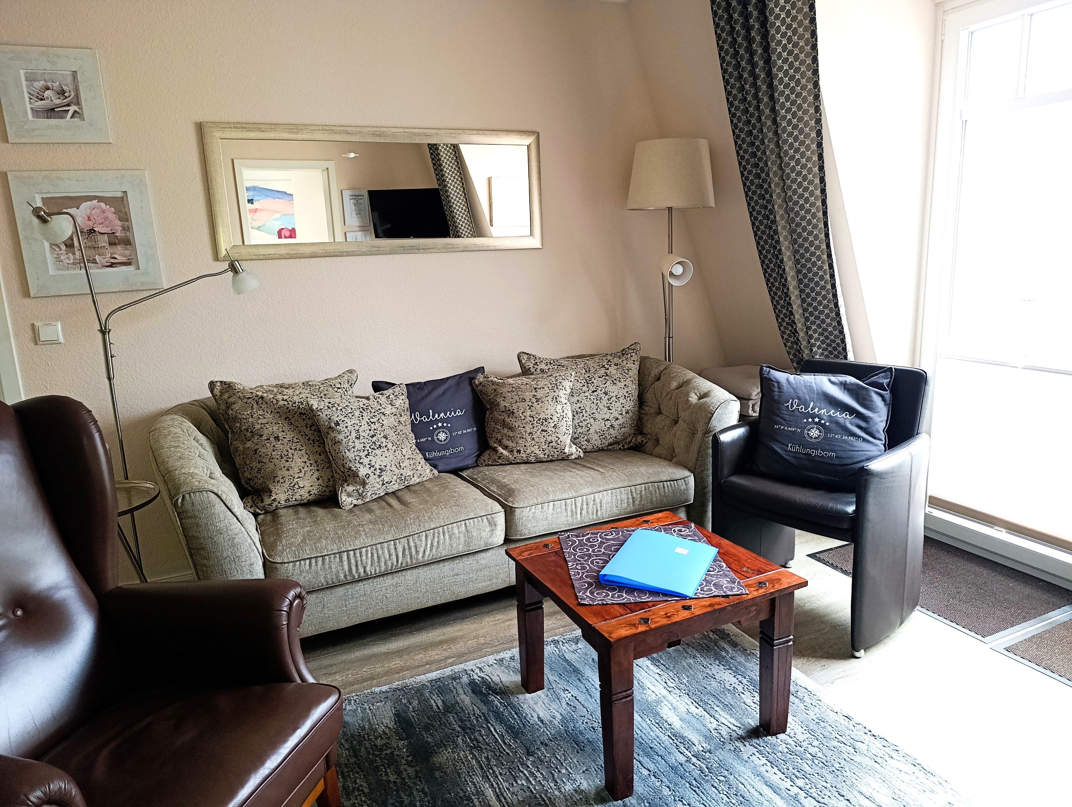 Nur 150 m vom Strand wohnen Sie in einer 3-Raum-Ferienwohnung. Die 68 qm  Wohnung liegt in der zweiten Etage. Das Wohnzimmer ist mit einer Couch, Couchtisch, Sessel, Anrichte, mit Kabel-TV (Flachbildschirm), Radio, Essbereich (Tisch und Stühle) Der Balkon mit Tisch und Stühle geht zur Nord-  Westseite. Im 1. Schlafzimmer stehen ein Doppelbett eine kleine Anrichte und DU/WC. Im 2. Schlafzimmer ist ebenfalls ein Doppelbett mit Anrichte und ein Bad mit Badewanne und WC vorhanden. Die Küche wurde ausgestattet mit Mikrowelle, Kühlschrank, Geschirrspüler, Kaffeemaschine, Zwei-Platten-Kochfeld, Toaster und Wasserkocher.  Die Wohnung hat einen sehr gr0ßen Balkon mit Strandkorb.