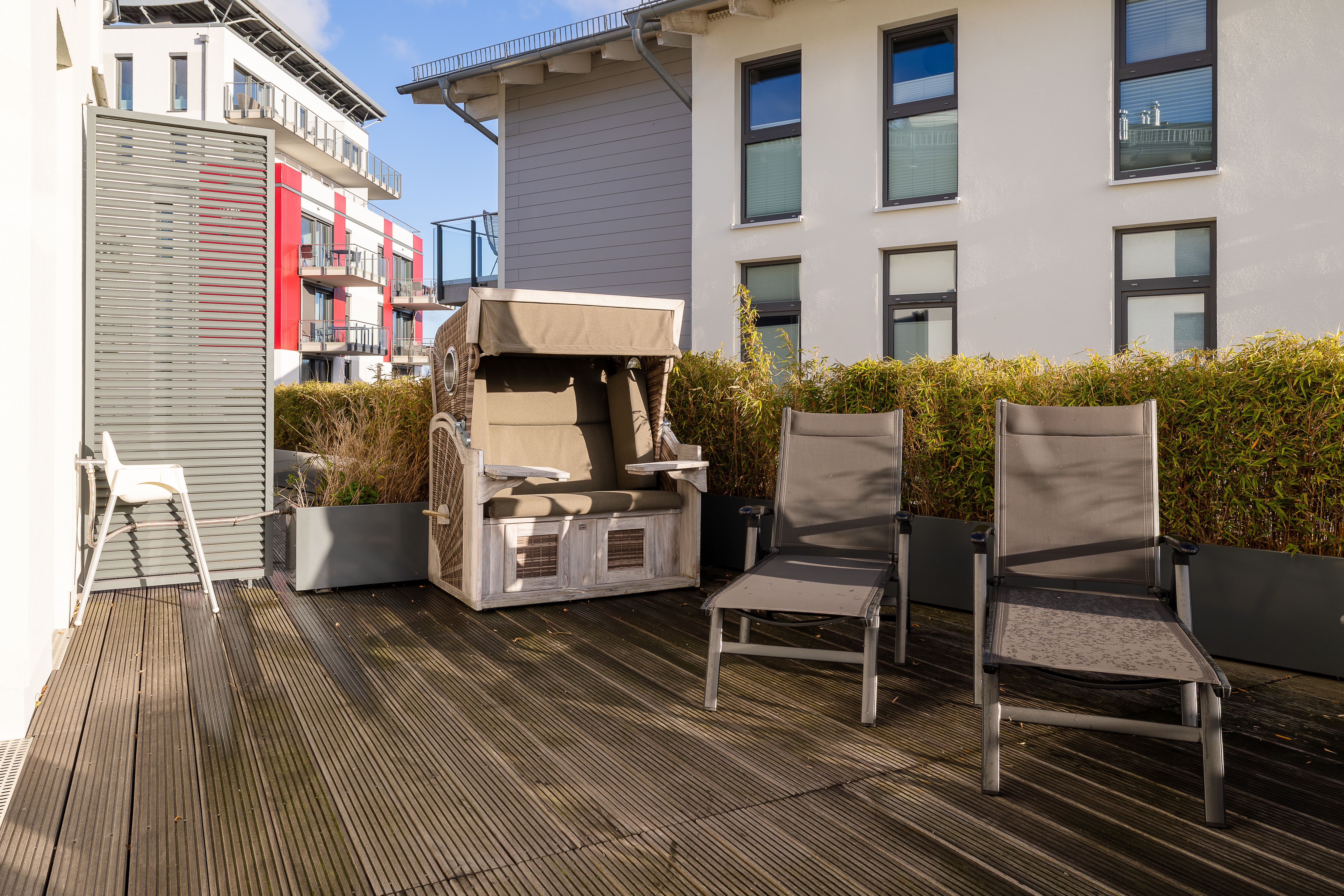 Die Wohnung bietet auf 62qm einen gemütlichen Wohnraum mit integrierter Küche, einen Schlafraum mit Doppelbett und ein Bad mit Dusche. Die 30qm große Dachterrasse mit Strandkorb ist aus dem Wohn- wie auch aus dem Schlafbereich begehbar. Der Südbalkon ist ebenfalls aus dem Wohnbereich zu erreichen.