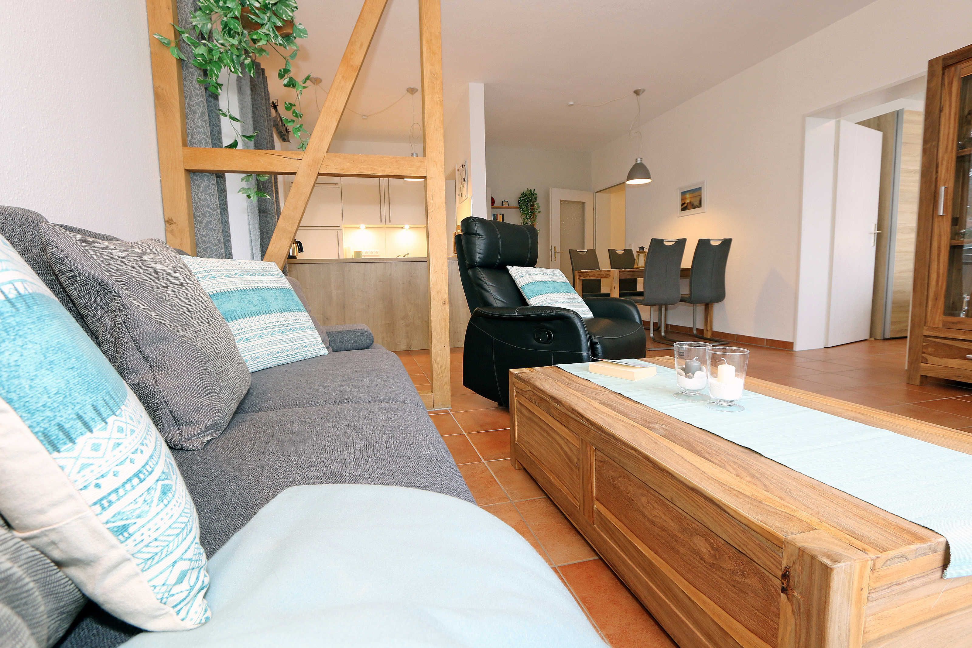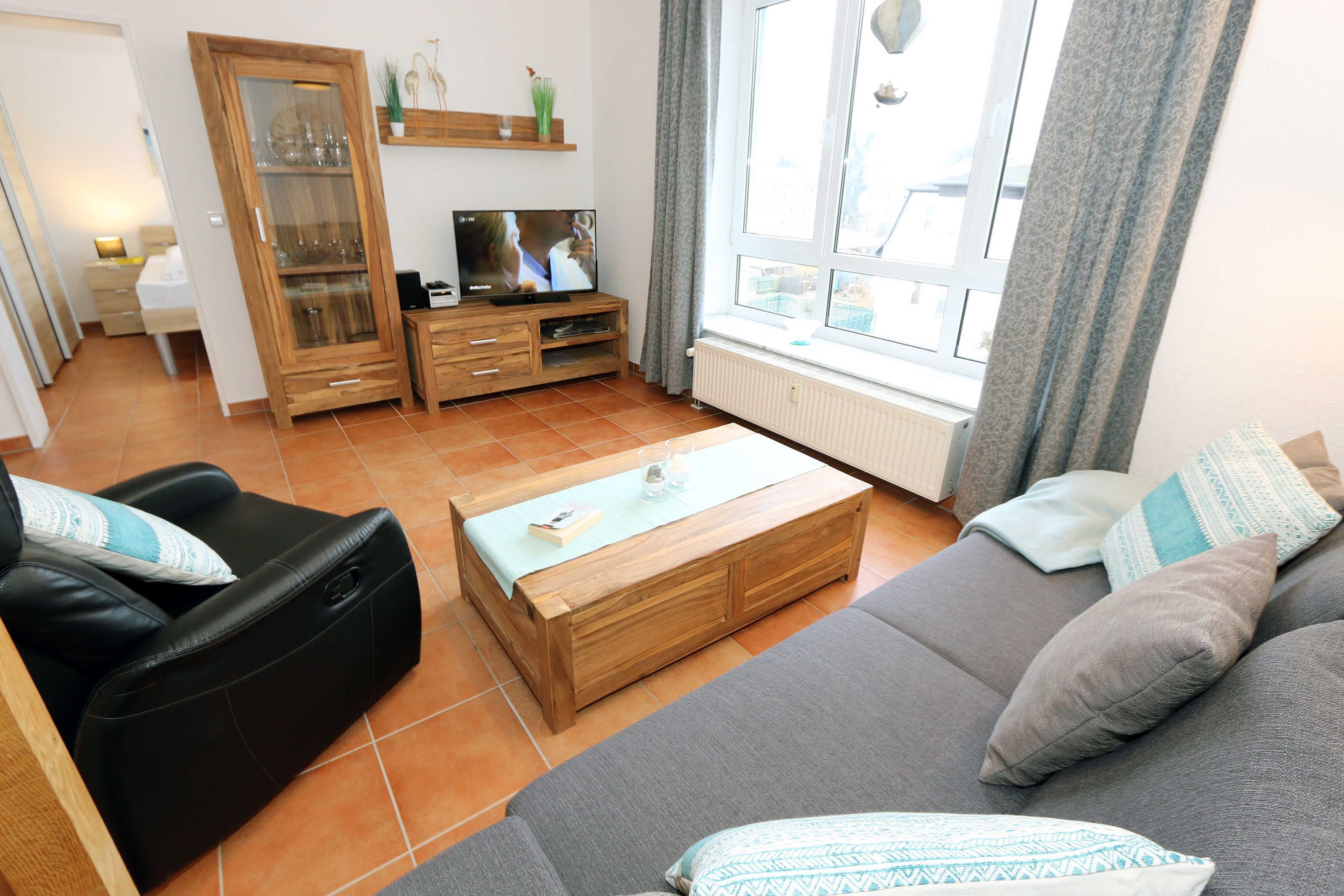 Die ausgestattete 2-Raum-Nichtraucher-Wohnung im 1. OG des Haus Holstein liegt am erweiterten Kurpark, direkt am Friedensberg mit hervorragender Wohnqualität und verfügt über ca. 63 qm Wohnfläche. Der geräumige Flur ist mit einer Garderobe sowie einem integrierten Abstellraum ausgestattet. Der 13 qm große und überdachte Balkon (Süden) mit Komfort-Bestuhlung und Sonnenliege ist vom Wohnbereich aus begehbar. Die Wohnung ist für 2 bis max. 4 Erwachsene ausgestattet und besteht aus einem Wohnbereich mit einer Couch (Aufbettung für 3./4. Person, 1,50 m x 2,00 m), massivem Couchtisch, einem Funktions-Sessel, einer Stehlampe sowie einer Vitrine. Der technische Bereich wird durch einen LED-TV, einen DVD-Player, einer Mini-Stereo-Anlage mit Bluetooth und USB-Anschluss sowie Internet (WLAN) abgerundet. Der Internetzugang (WLAN) ist für Sie inklusive. Die großzügige Essecke umfasst einen massiven Vollholz-Tisch und vier dazugehörige Stühle. Die angrenzende und offene Küchenzeile bietet Ihnen einen Kühlschrank mit Gefrierfach, einen Backofen mit 4 Zonen Induktionskochfeld, einen Geschirrspüler, einer Mikrowelle, einer Kaffeemaschine, einen Toaster, einen Eierkocher, einen Handmixer, einen Wasserkocher sowie viele kleine Küchenutensilien. Im Schlafzimmer befindet sich ein Doppelbett (1,80 m x 2,00 m) mit einer Komforthöhe über 60 cm, Kaltschaum-Wendematratzen H2/H3, zwei Nachttischablagen und einen großen Kleiderschrank. Ein großer Ganzkörperspiegel rundet den Raum ab. Das innenliegende Bad ist mit einem Waschplatz mit beleuchtetem Spiegel, einer Dusche mit flachem Einstieg, Fön, WC, Handtuchhalter sowie einer Waschmaschine versehen. Im Abstellraum finden Sie kleine Helfer wie einen Staubsauger, ein Bügeleisen mit Bügelbrett und einen Wäscheständer für den Balkon. Alle Räumlichkeiten sind in der Wohnung gefliest und haben jeweils ein Insektenschutzgitter. Haustiere sind nicht erlaubt. Ein überdachter PKW-Stellplatz Nr. 12 (max. 2 m Höhe) befindet sich direkt unterm Haus. Im Gemeinschaftskeller stehen Ihnen eine Münzwaschmaschine und ein Münztrockner zur Verfügung. Abstellmöglichkeiten für Fahrräder sind gegeben. Die Erstausstattung eines Wäschepaketes (komplette Bettwäsche, 1 Duschhandtuch, 1 kleines Handtuch) können Sie bis 14 Tage vor Anreise gegen einen Aufpreis dazu buchen oder durch eigene ergänzen. Ab 2 gebuchten Paketen erhalten Sie einmalig 1 Geschirrhandtuch und 1 Duschvorleger hinzu.