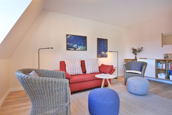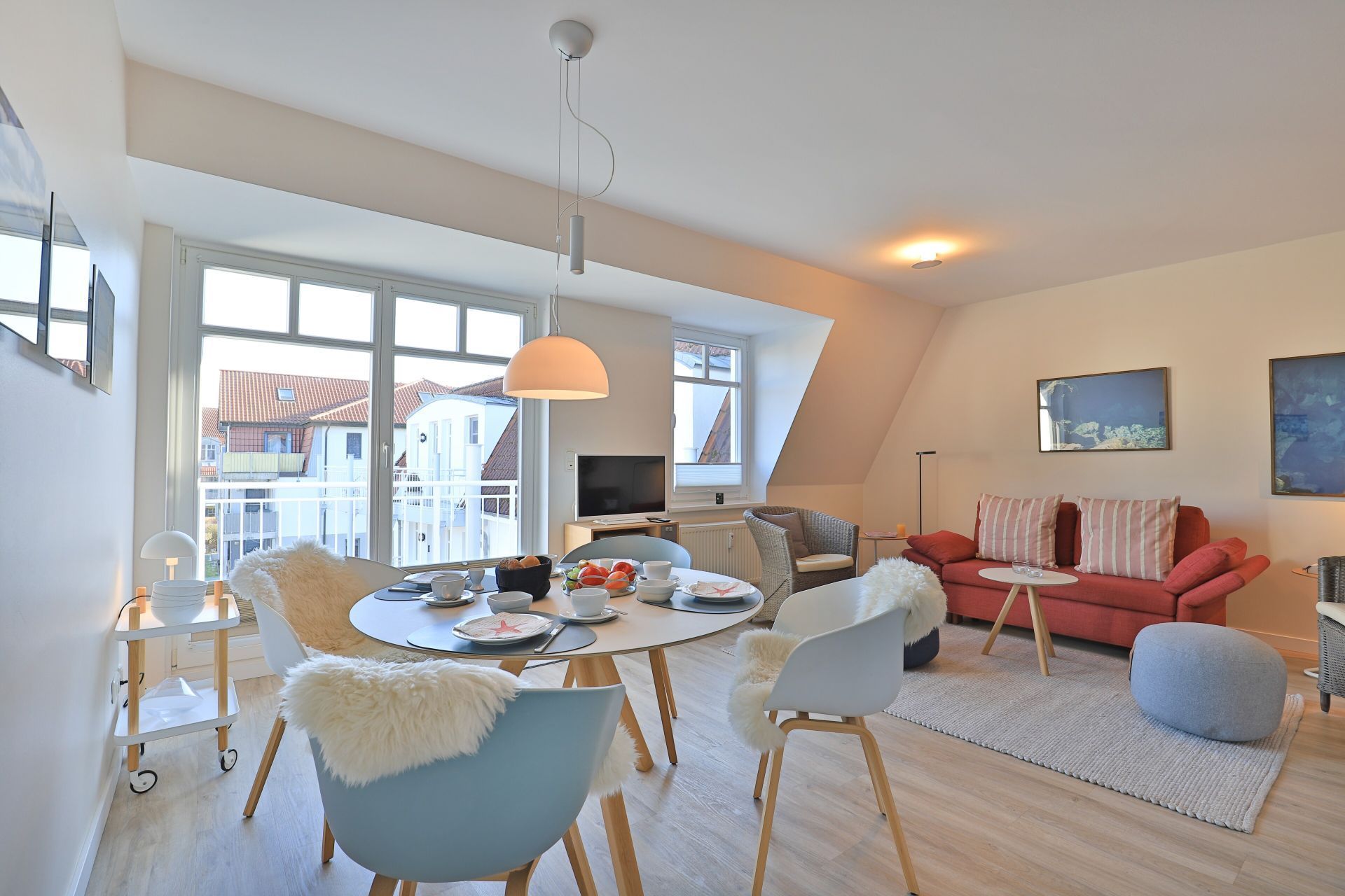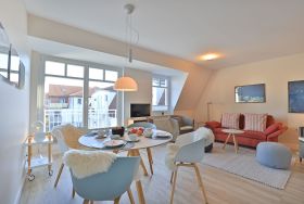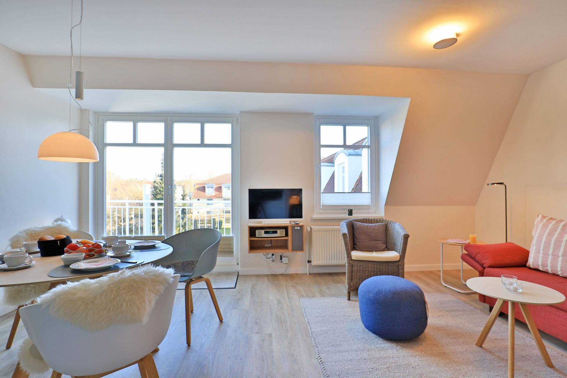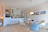 Es empfängt Sie ein heller Wohn- / Essbereich mit Flachbild ? TV einem Esstisch und einer gemütlichen Couch, die im ausgeklappten Zustand 2 weitere Schlafplätze bietet. Von dort aus haben Sie Zugang zum Balkon mit einer herrlichen Aussicht zum Innenhof.