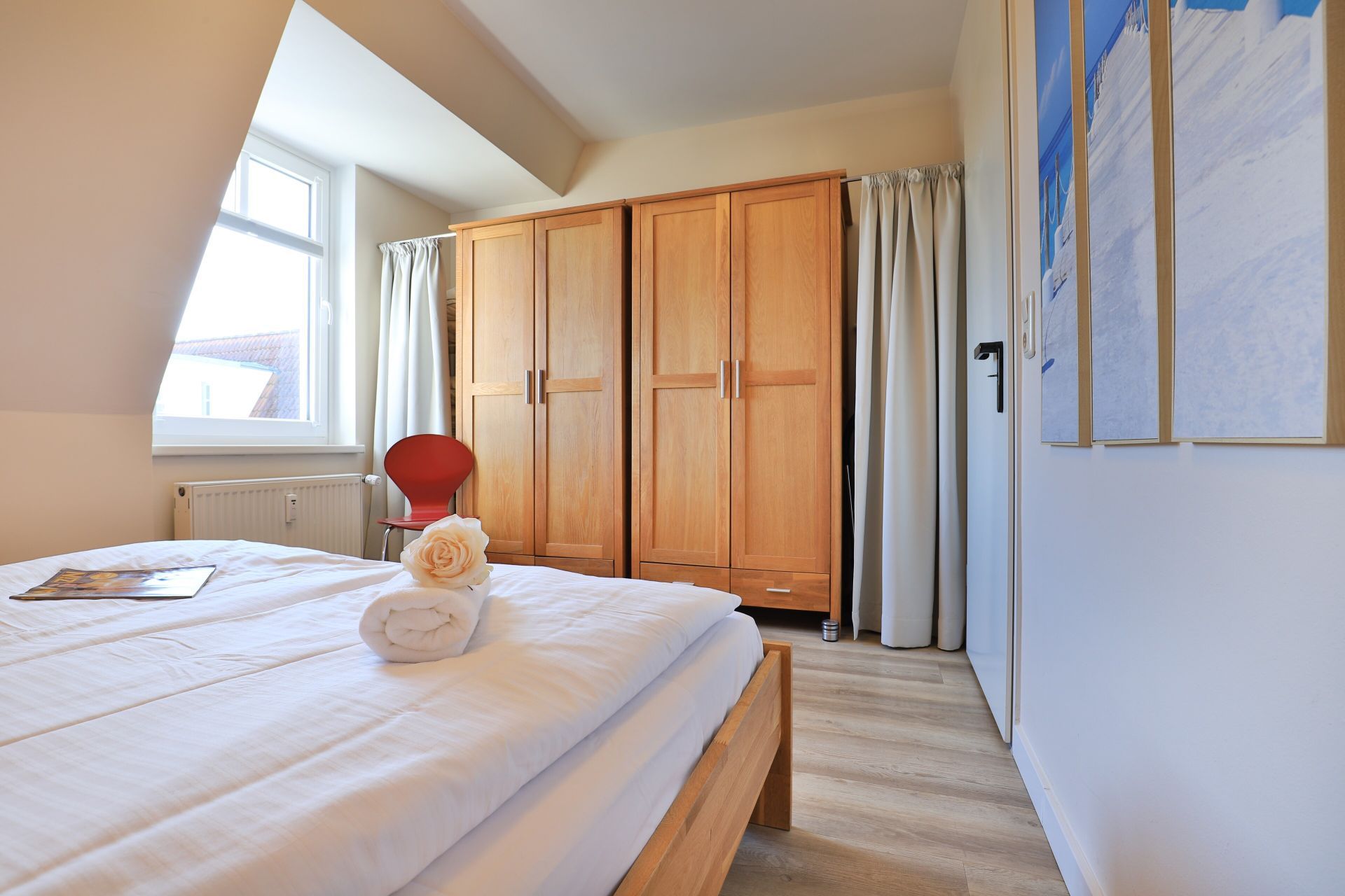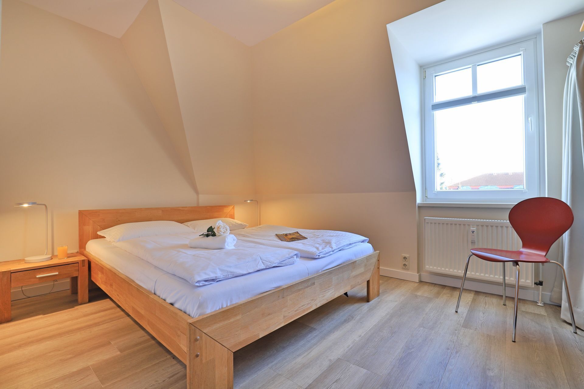 Die Einbauküche ist in den Wohn-/ Essbereich geschickt integriert. Sie ist komplett ausgestattet mit Herd, Backofen, Toaster, Kaffeemaschine, Wasserkocher, Geschirrspüler u.v.m. Das Schlafzimmer verfügt über ein Doppelbett und einen Kleiderschrank. Des Weiteren verfügt das Appartement über ein Duschbad (inkl. Fön) und einen separaten Abstellraum, in dem Ihnen eine Waschmaschine zur Verfügung steht. Ein Stellplatz befindet sich in der Tiefgarage.
