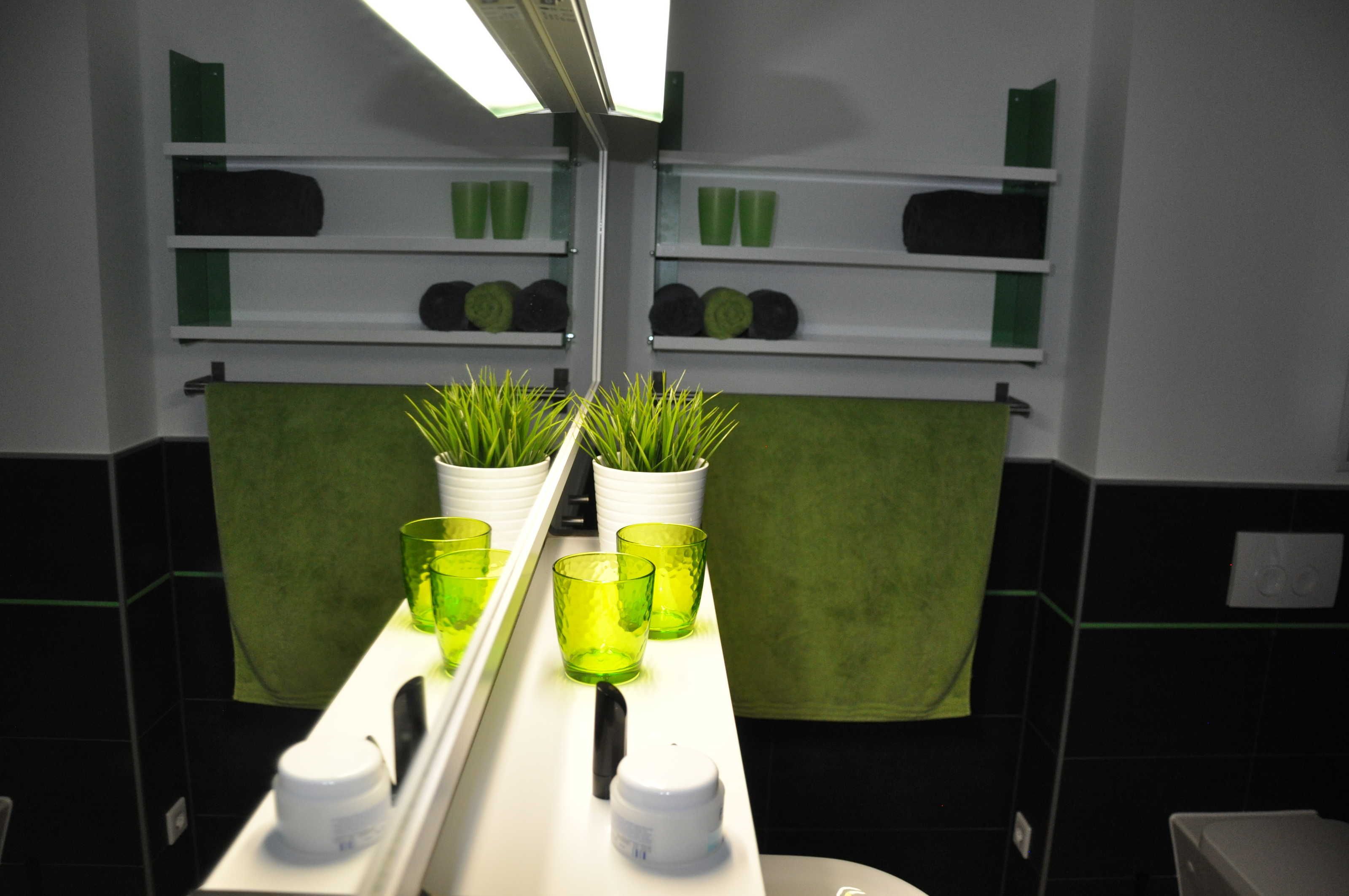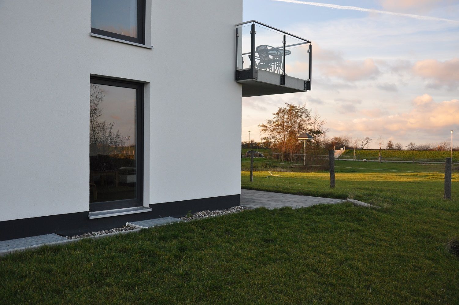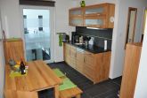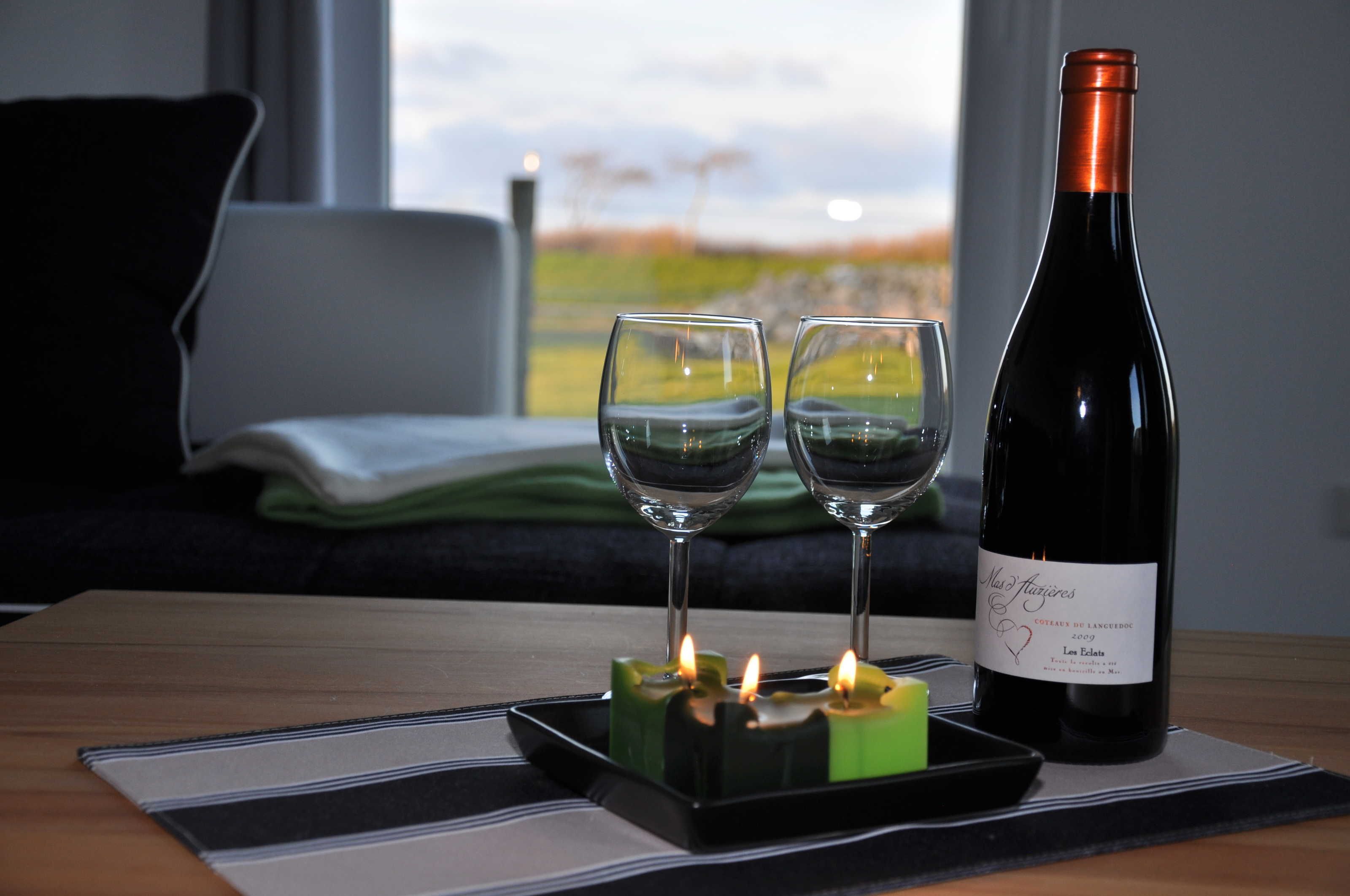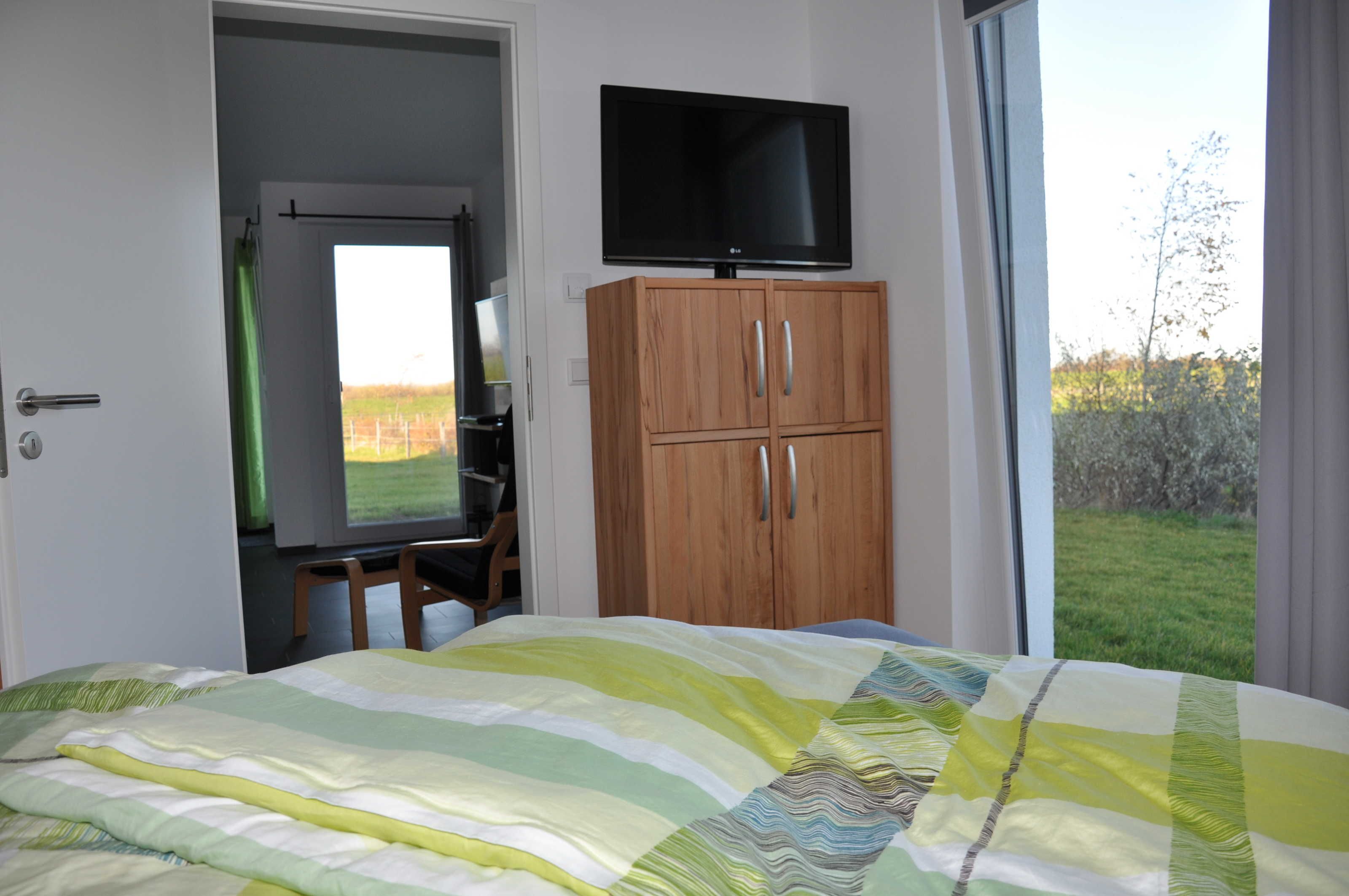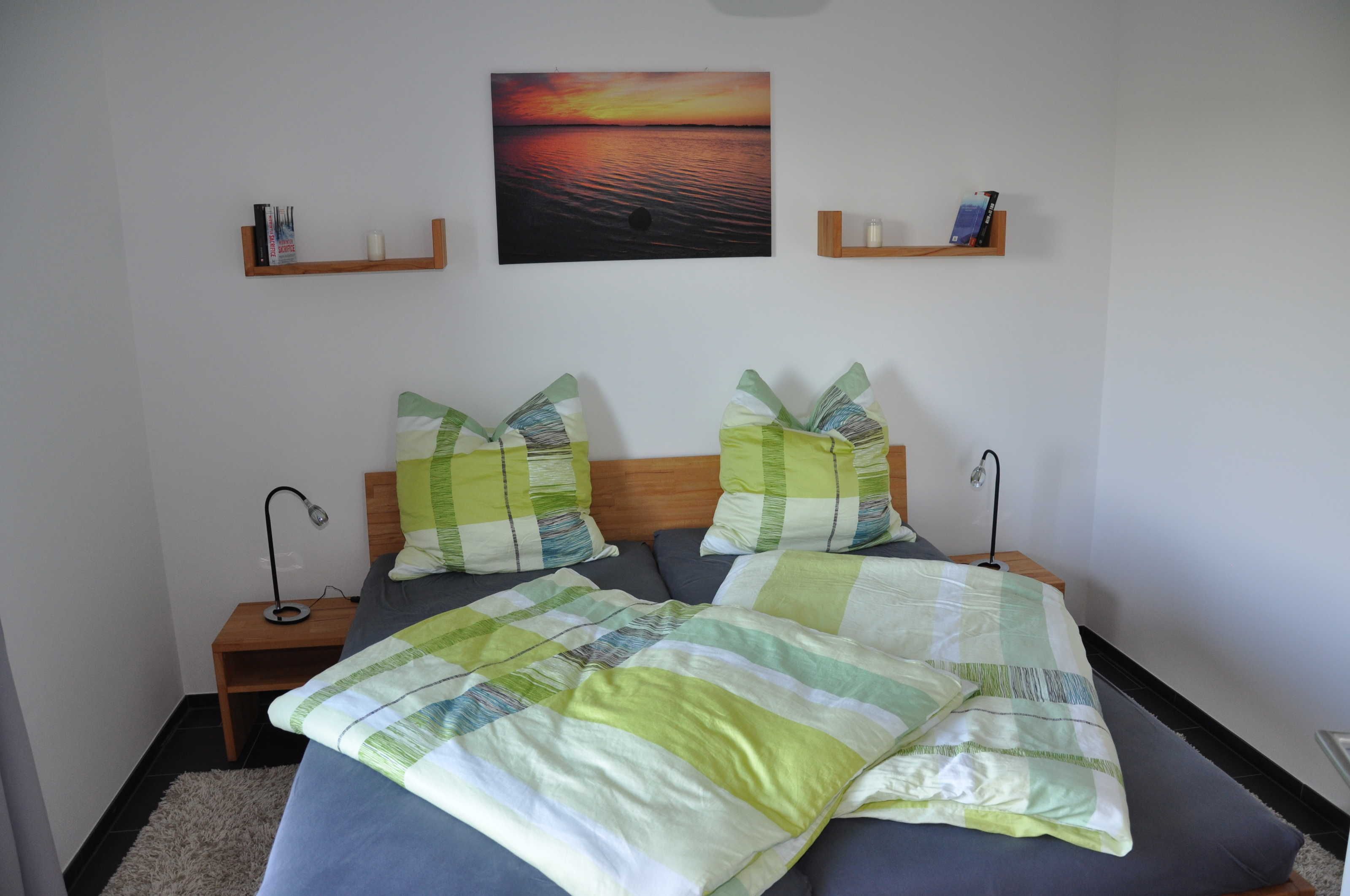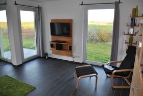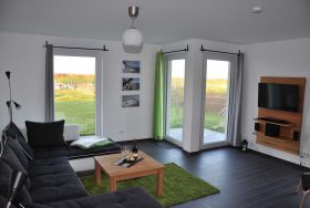 Die Wohnung bietet Ihren Gästen ein Schlafzimmer mit einem komfortablen Doppelbett (getrennte Matratzen) und ein großes Wohnzimmer mit einer bequemen Schlafcouch. Hier finden zwei weitere Personen bequem Platz. Die Ferienwohnung ist stilvoll eingerichtet. Für bunte Unterhaltung sorgen ein LED-TV und eine Stereoanlage. In der offenen Küche befindet sich eine komplett eingerichtete Einbauküche mit Backofen, Ceranfeld, Kühlschrank inklusive Gefrierfach, Geschirrspüler, Mikrowelle, Wasserkocher, Kaffeemaschine und Toaster. Das Bad mit Tageslicht verfügt über eine Dusche, eine große Spiegelfront, einen Föhn und mehrere Abstellmöglichkeiten. In der kompletten Wohnung ist eine Fußbodenheizung installiert und von jedem Zimmer aus können Sie nach außen auf die Terrasse gelangen. Starten Sie Ihren Tag mit frischen Brötchen und den Klängen der umliegenden Natur.