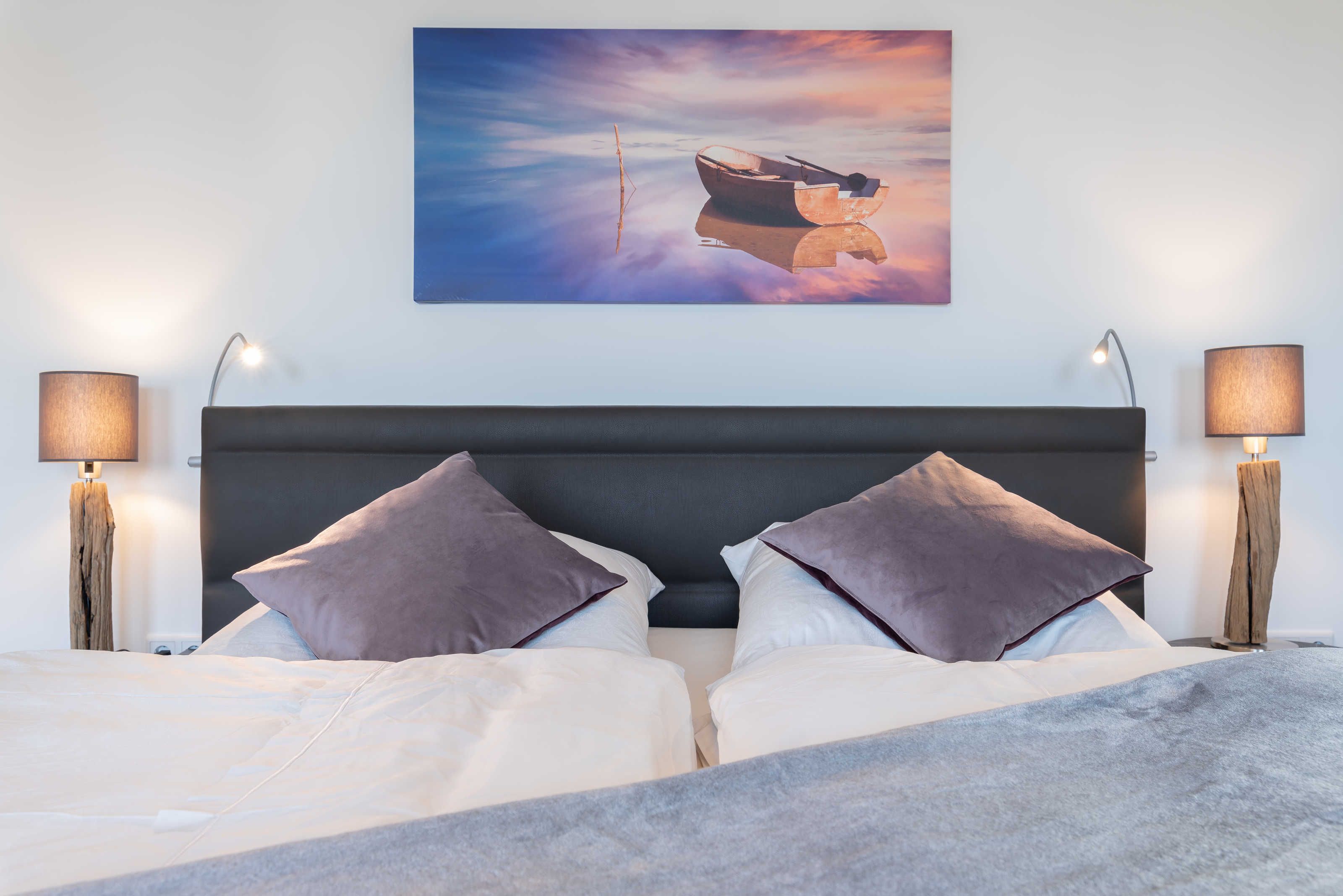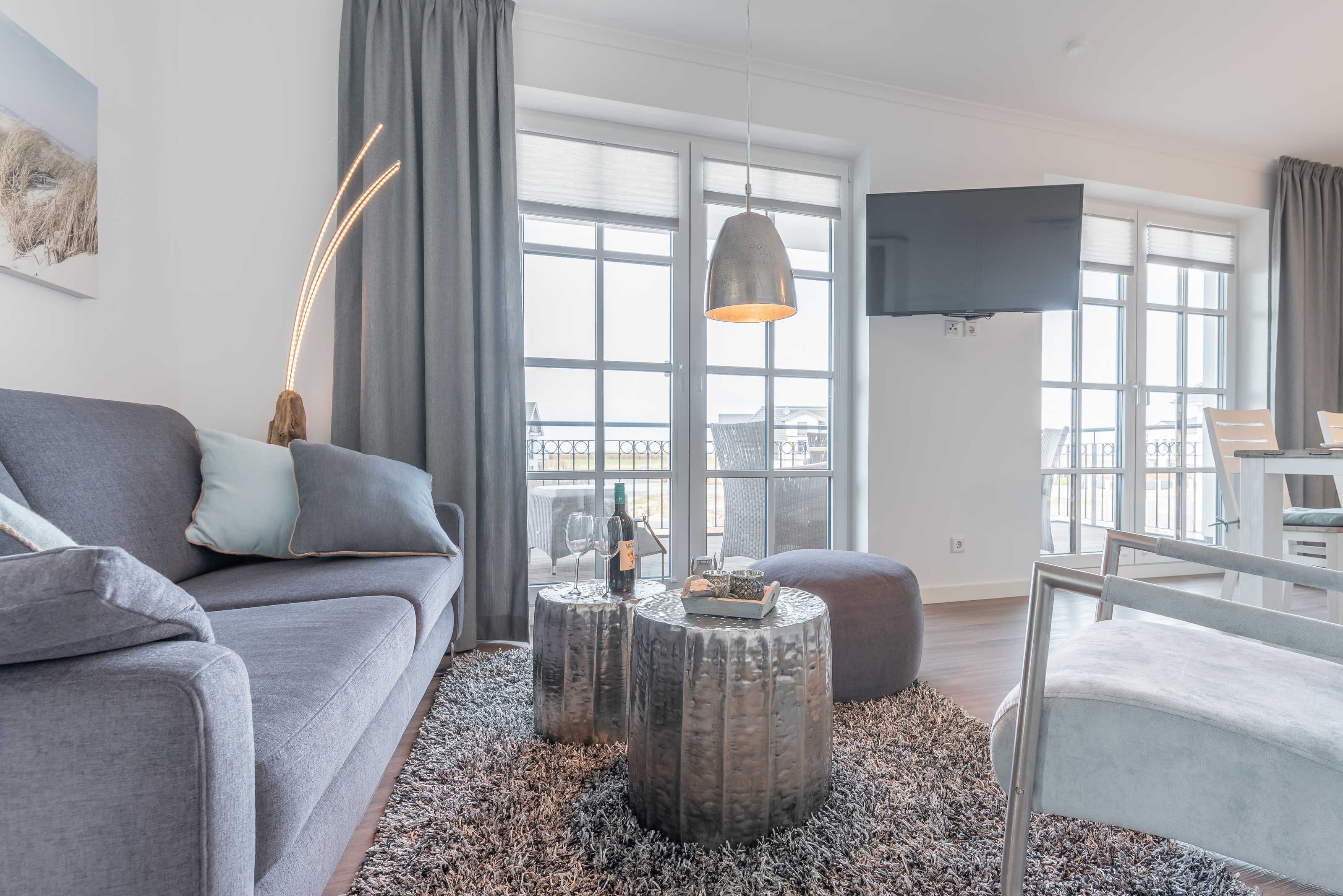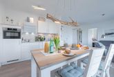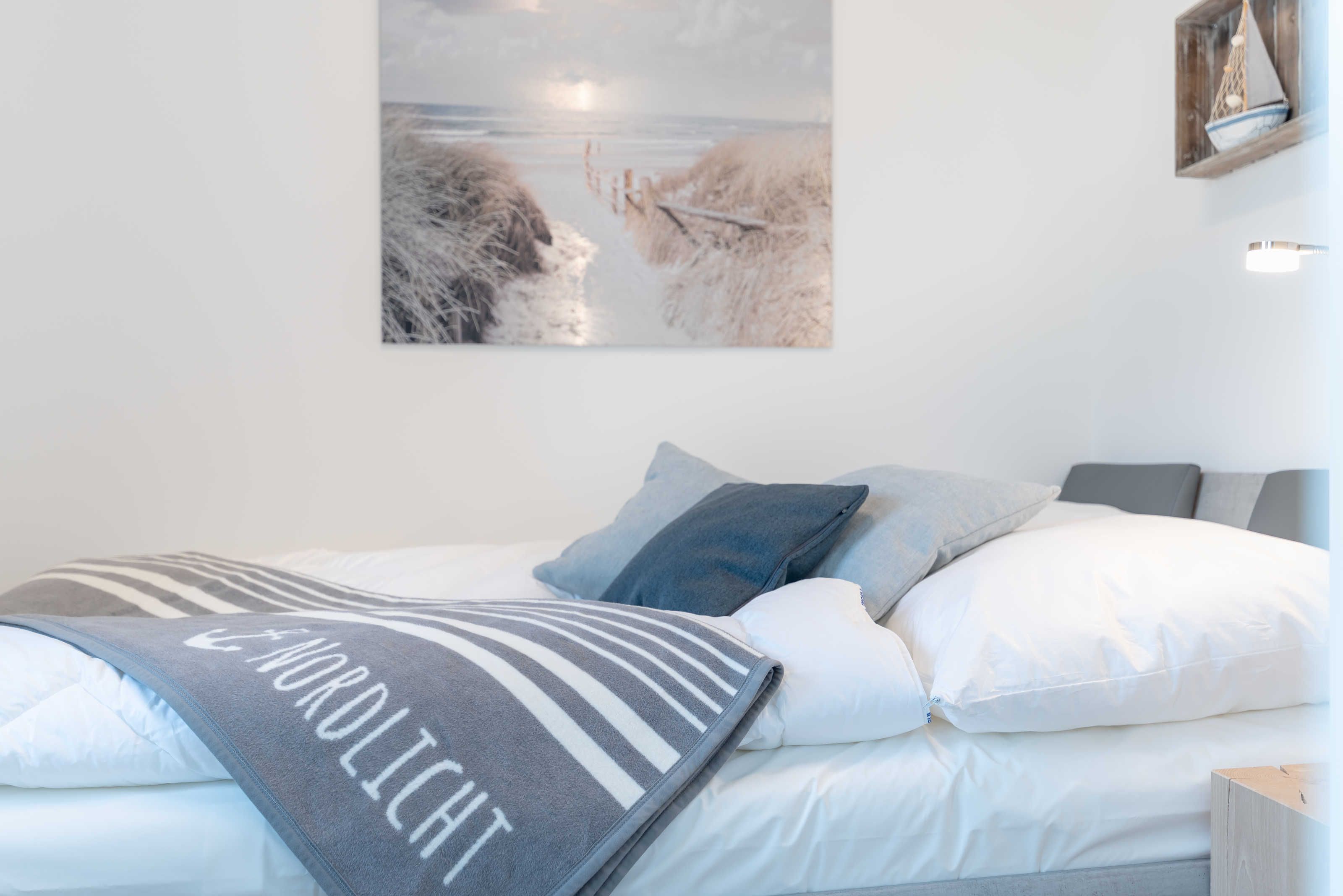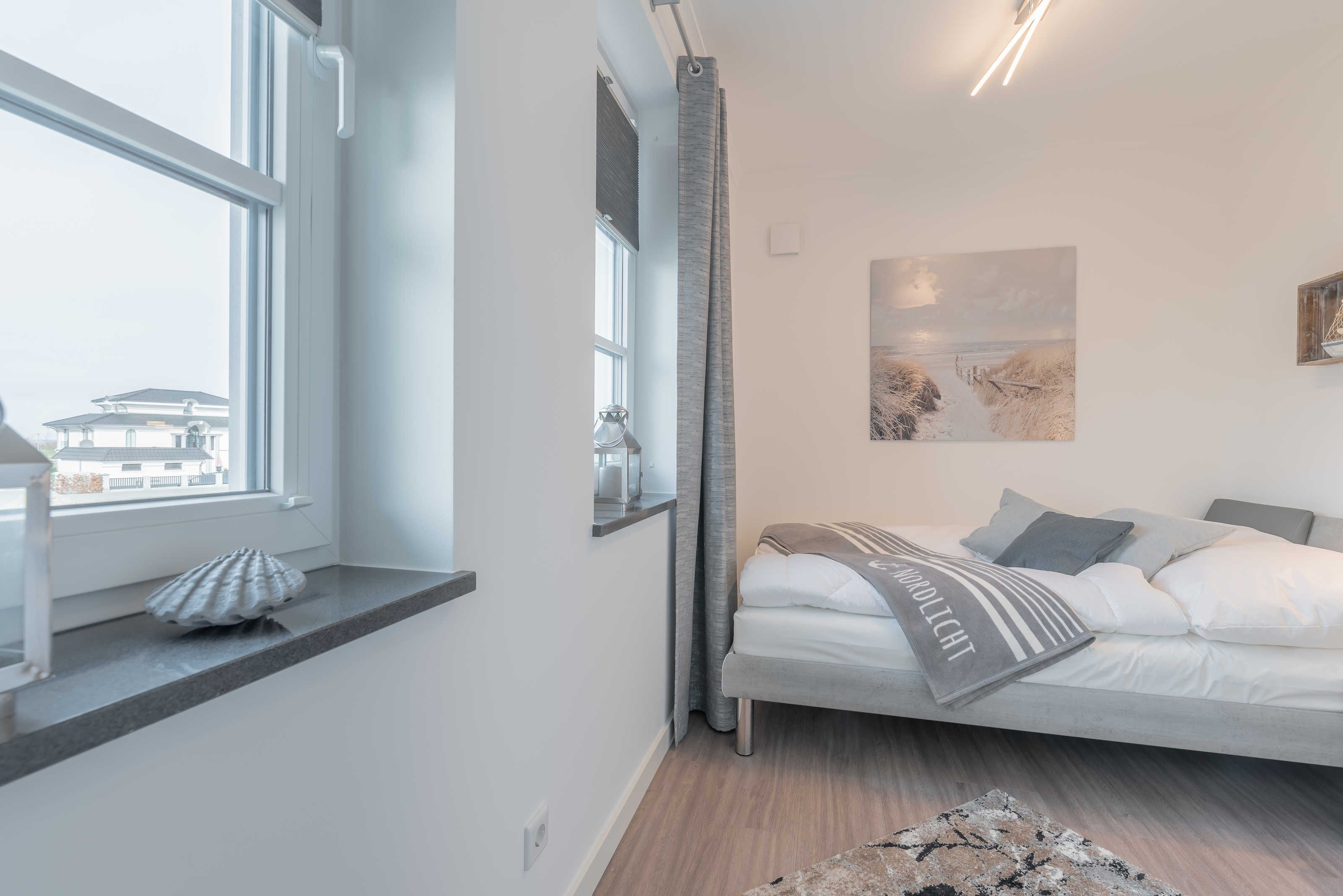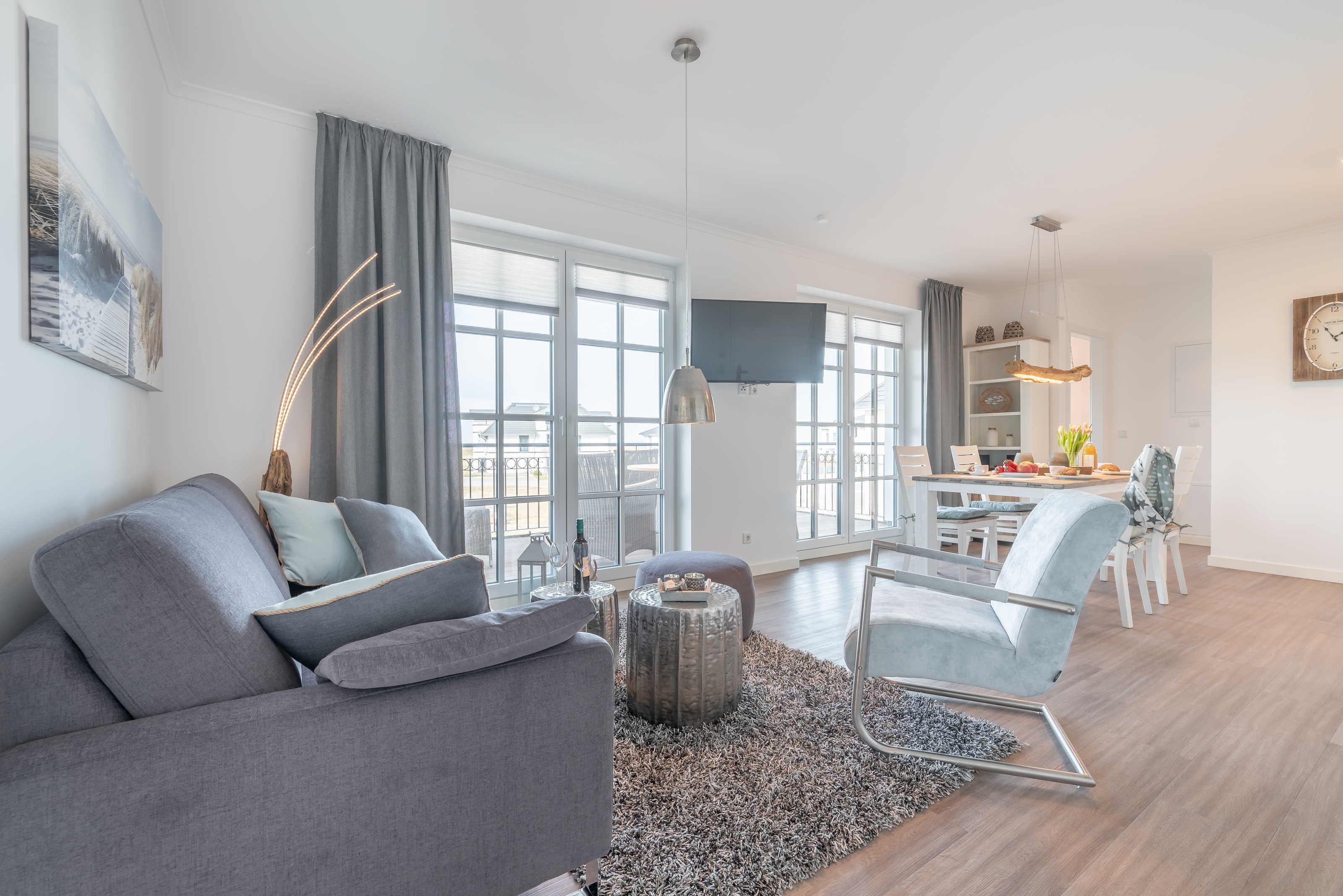 Die modern und liebevoll ausgestattete Unterkunft bietet ausreichend Platz für Familien oder Freundesgruppen mit bis zu vier Erwachsenen. Im Wohnzimmer sind eine Couch mit passendem Sessel und ein Esstisch mit vier Stühlen vorhanden. Zur Unterhaltung stehen ein 49 Zoll Flat-Screen-TV, ein Blu-Ray-Player und eine Mini-Stereoanlage zur Verfügung. In der voll ausgestatteten Küchenzeile finden Sie alles, was Sie für einen entspannten Aufenthalt benötigen: 4-Platten Cerankochfeld, Backofen mit integrierter Mikrowelle, Kühlschrank mit Tiefkühlfach, Geschirrspüler, Kaffeemaschine, Wasserkessel, Tassimo-Kapselmaschine und Toaster. Das erste Schlafzimmer ist mit einem komfortablen Boxspring Bett (180 x 200 cm) und einem Schwebetürenschrank sowie einem weiteren Flat-Screen-TV ausgestattet. Im zweiten Schlafzimmer befinden sich ein Doppelbett (140 x 200 cm) und ein eigener Kleiderschrank. Beide Schlafzimmer sind mit Verdunklungsplissees ausgestattet. Das Bad ist besticht mit einer bodengleichen Dusche mit Regenbrause, einem Handtuchheizkörper und einem Waschtisch mit großem Spiegel, Ablage und Fön. Vom Wohnraum aus haben Sie Zugang zum großzügigen Balkon mit Tisch und vier Stühlen. Von hier aus können Sie den Meerblick genießen und bei einem Glas Wein die herrliche Abendsonne beobachten. An kühlen Herbst- und Wintertagen sorgt eine Fußbodenheizung für Wärme und Gemütlichkeit.