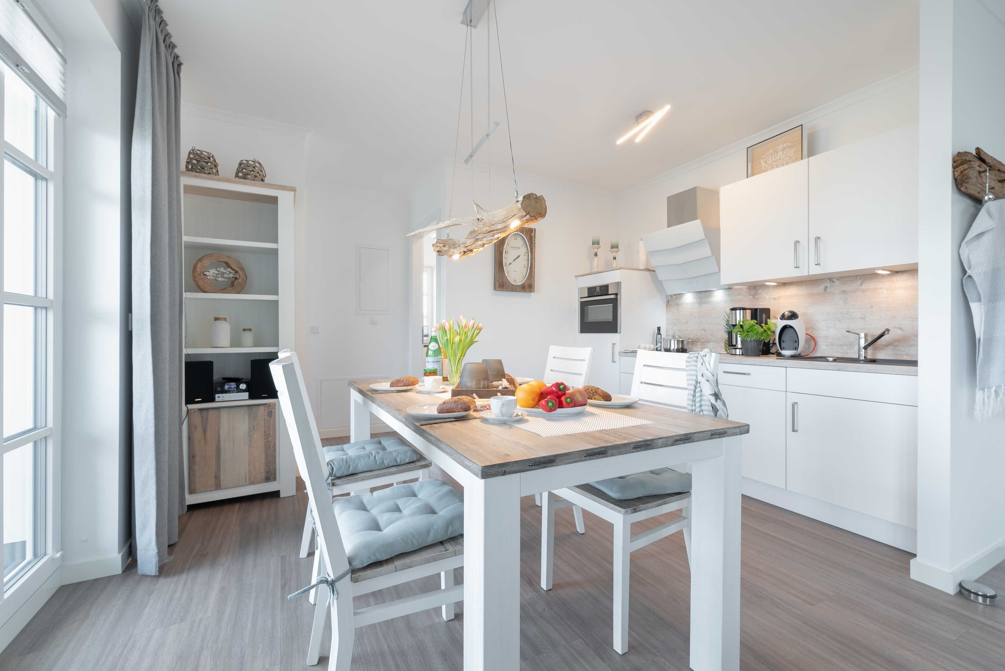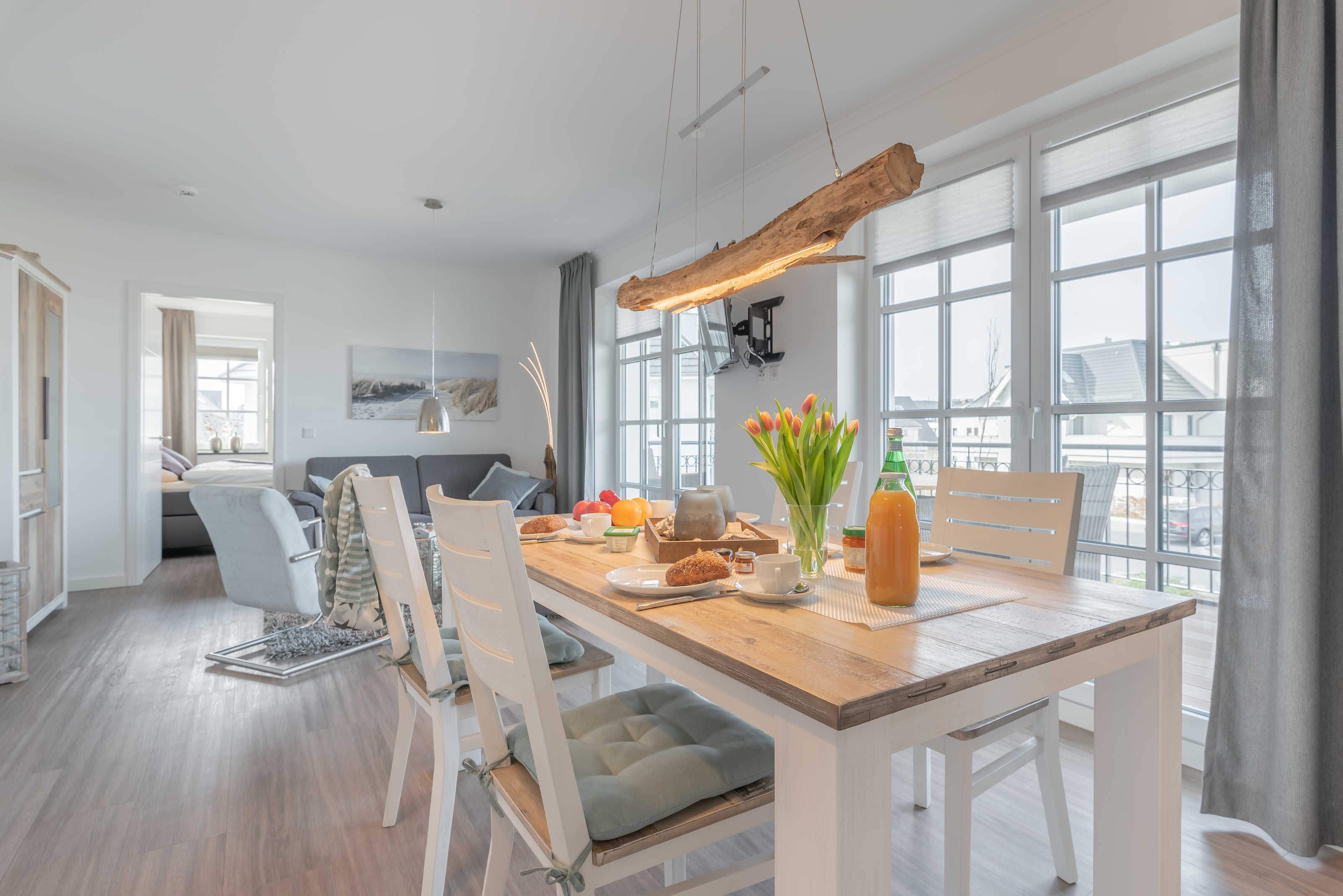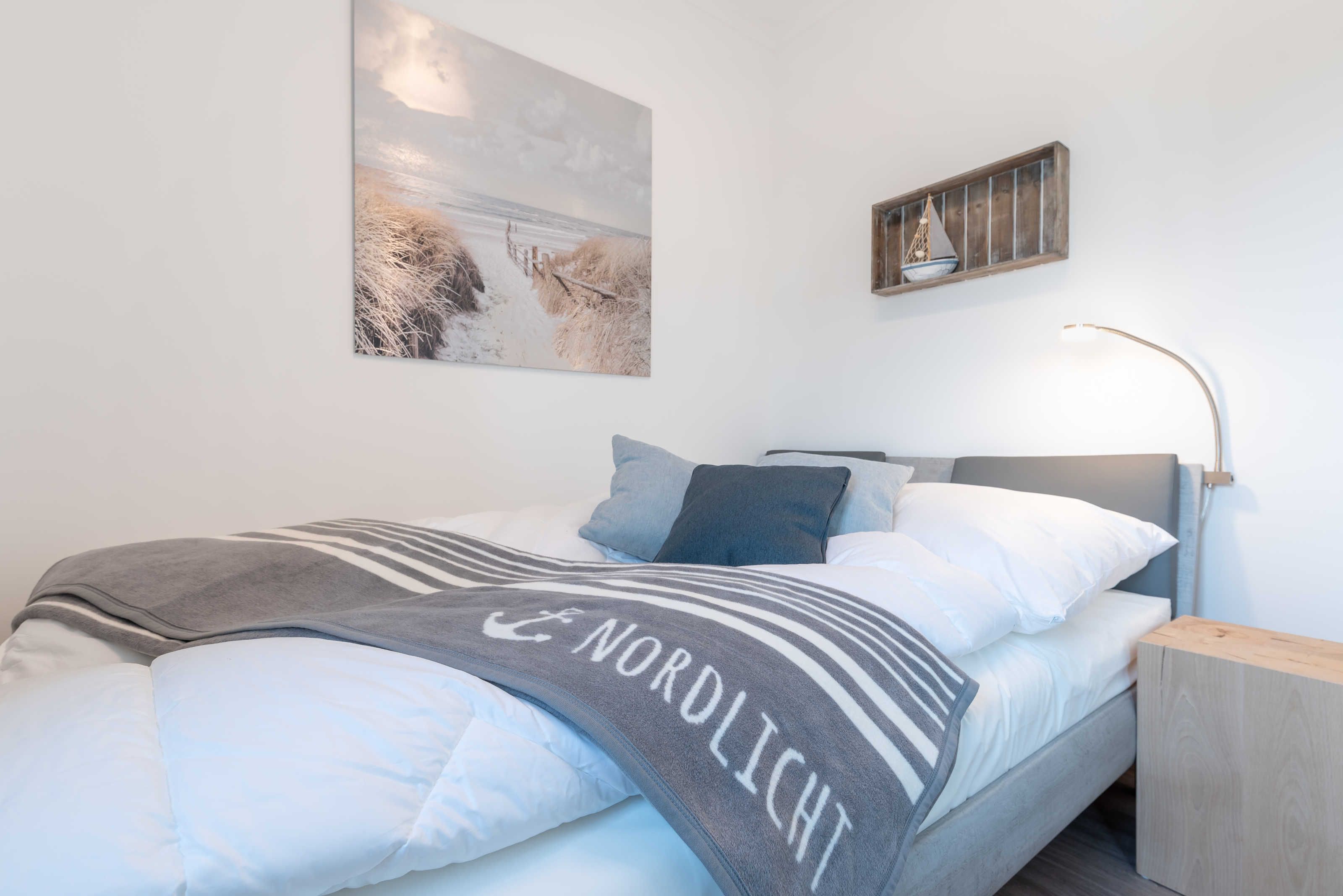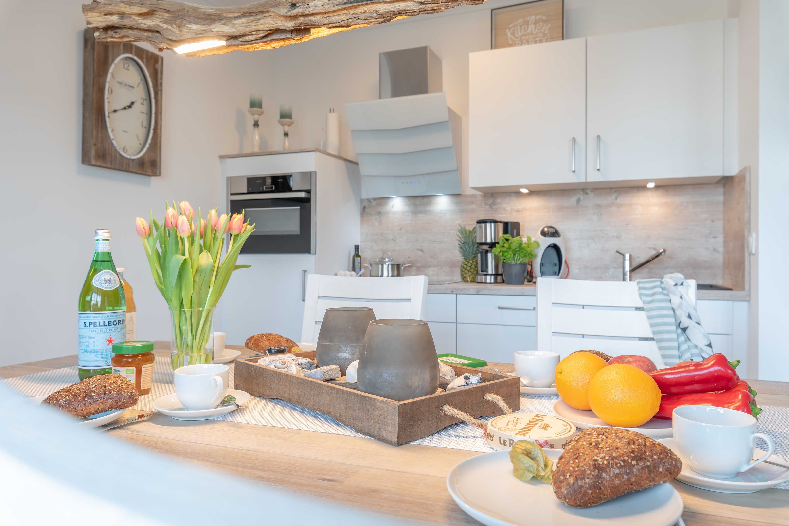 Die modern und liebevoll ausgestattete Unterkunft bietet ausreichend Platz für Familien oder Freundesgruppen mit bis zu vier Erwachsenen. Im Wohnzimmer sind eine Couch mit passendem Sessel und ein Esstisch mit vier Stühlen vorhanden. Zur Unterhaltung stehen ein 49 Zoll Flat-Screen-TV, ein Blu-Ray-Player und eine Mini-Stereoanlage zur Verfügung. In der voll ausgestatteten Küchenzeile finden Sie alles, was Sie für einen entspannten Aufenthalt benötigen: 4-Platten Cerankochfeld, Backofen mit integrierter Mikrowelle, Kühlschrank mit Tiefkühlfach, Geschirrspüler, Kaffeemaschine, Wasserkessel, Tassimo-Kapselmaschine und Toaster. Das erste Schlafzimmer ist mit einem komfortablen Boxspring Bett (180 x 200 cm) und einem Schwebetürenschrank sowie einem weiteren Flat-Screen-TV ausgestattet. Im zweiten Schlafzimmer befinden sich ein Doppelbett (140 x 200 cm) und ein eigener Kleiderschrank. Beide Schlafzimmer sind mit Verdunklungsplissees ausgestattet. Das Bad ist besticht mit einer bodengleichen Dusche mit Regenbrause, einem Handtuchheizkörper und einem Waschtisch mit großem Spiegel, Ablage und Fön. Vom Wohnraum aus haben Sie Zugang zum großzügigen Balkon mit Tisch und vier Stühlen. Von hier aus können Sie den Meerblick genießen und bei einem Glas Wein die herrliche Abendsonne beobachten. An kühlen Herbst- und Wintertagen sorgt eine Fußbodenheizung für Wärme und Gemütlichkeit.