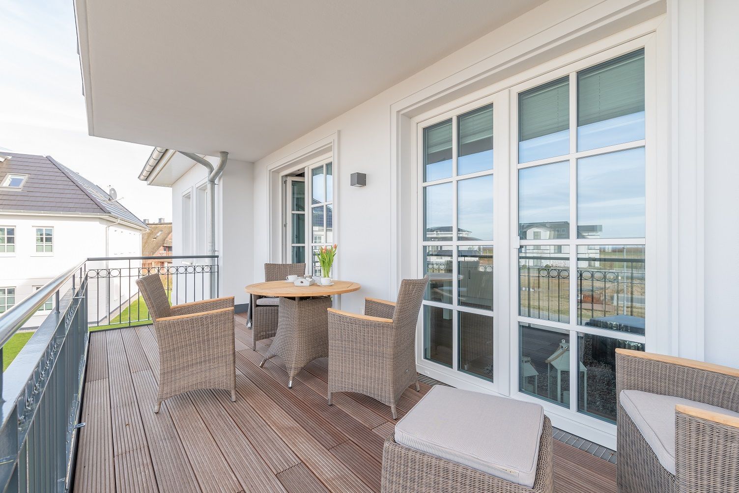 Drei-Zimmer-Ferienwohnung im ersten Obergeschoss mit weitem Meerblick vom Balkon