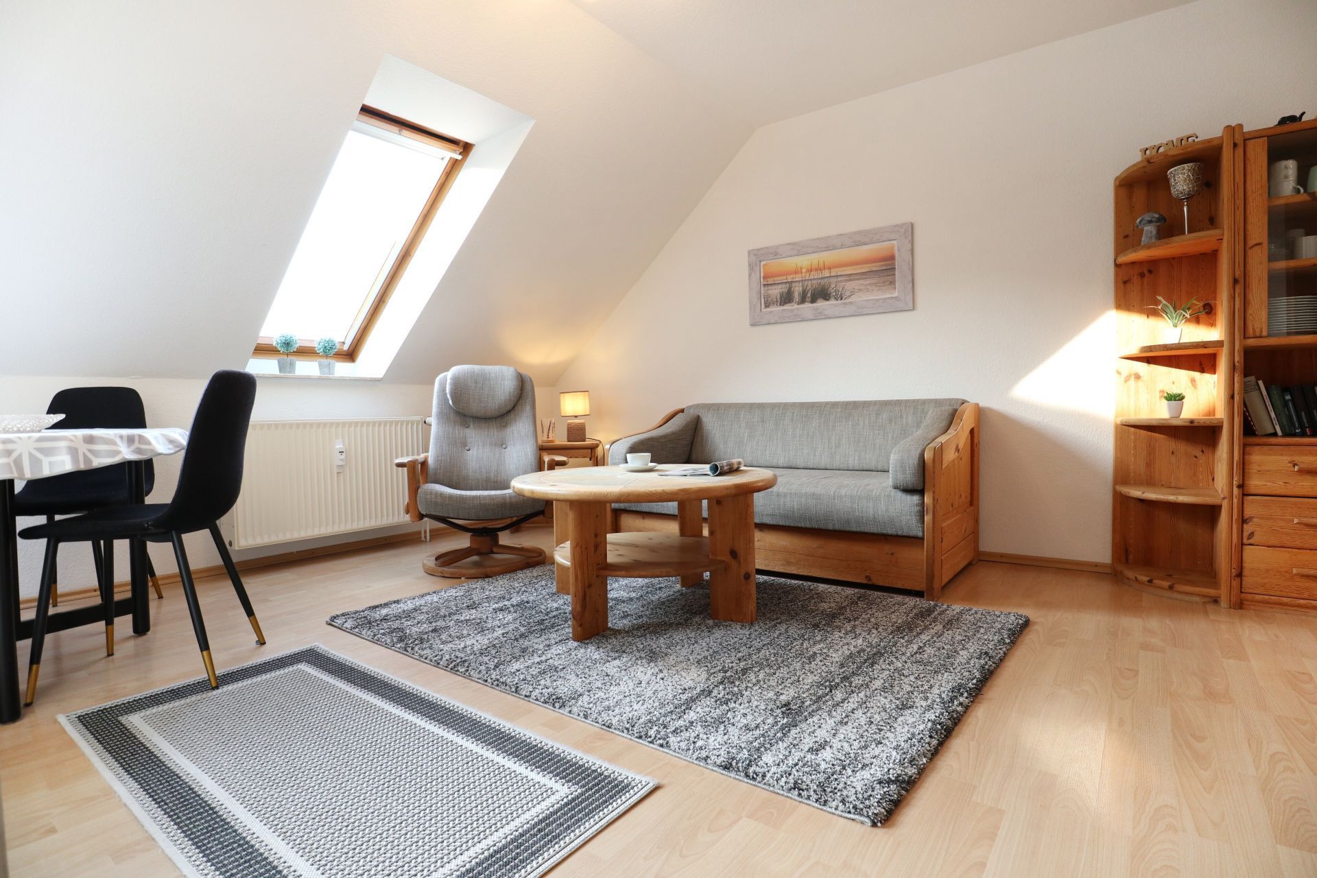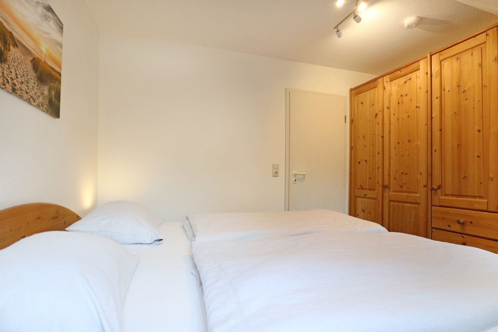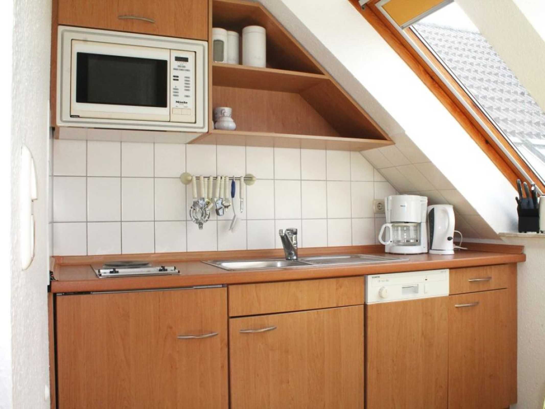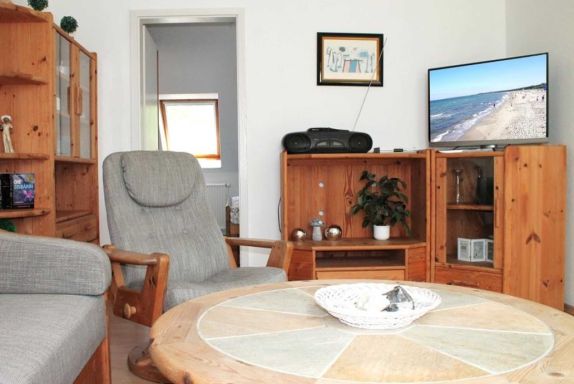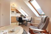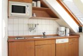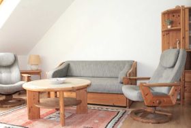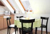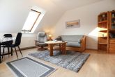 Im 2. Obergeschoss des Hauses empfängt Sie dieses gut ausgestattete 2- Zimmer Appartement mit einer Wohnfläche von 39qm. Mit bis zu 4 Personen können Sie in dieser Wohnung gut und günstig Ihren Urlaub verbringen. Im Wohn-Essbereich befindet sich ein ausziehbares Sofa, das als zusätzliche Schlafmöglichkeit genutzt werden kann. Zwei sehr bequeme Sessel laden zum Entspannen ein. Zudem sind im Wohnraum ein Esstisch mit 4 Stühlen sowie Fernseher und Radio vorhanden. Die in den Wohnbereich integrierte Pantryküche ist ausgestattet mit: Kochfeld, Mikrowelle, Kühlschrank mit Frostfach, Spülmaschine, Kaffeemaschine, Wasserkocher, Toaster usw. Das Schlafzimmer ist mit einem Doppelbett und Kleiderschrank ausgestattet.