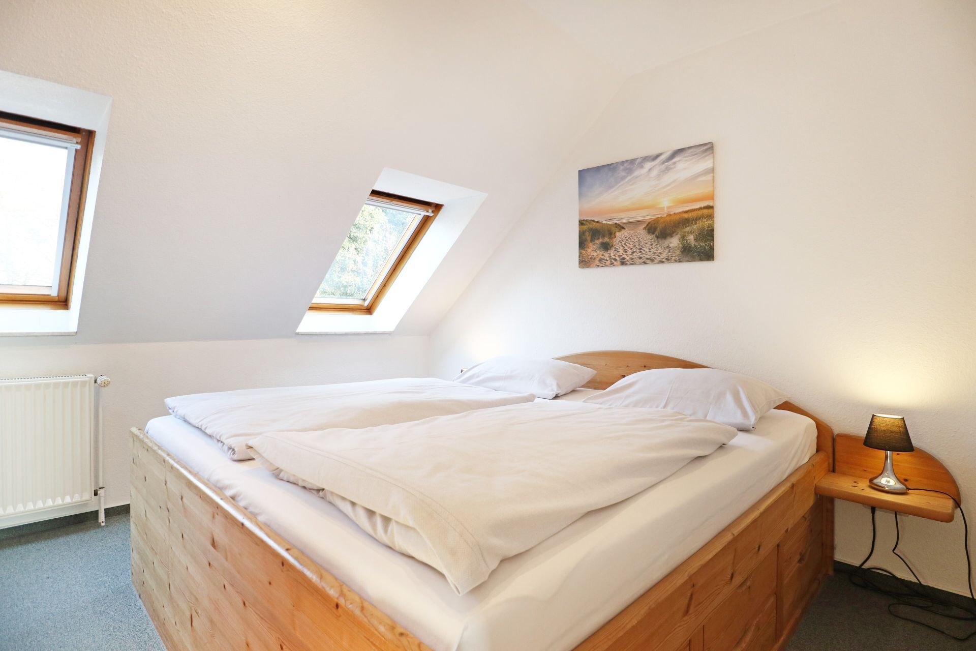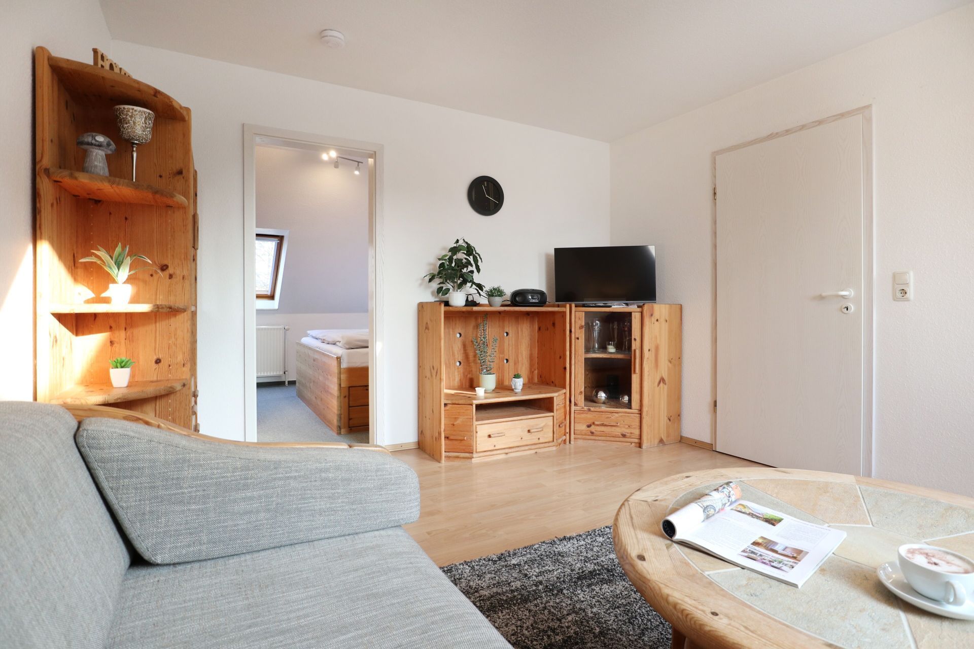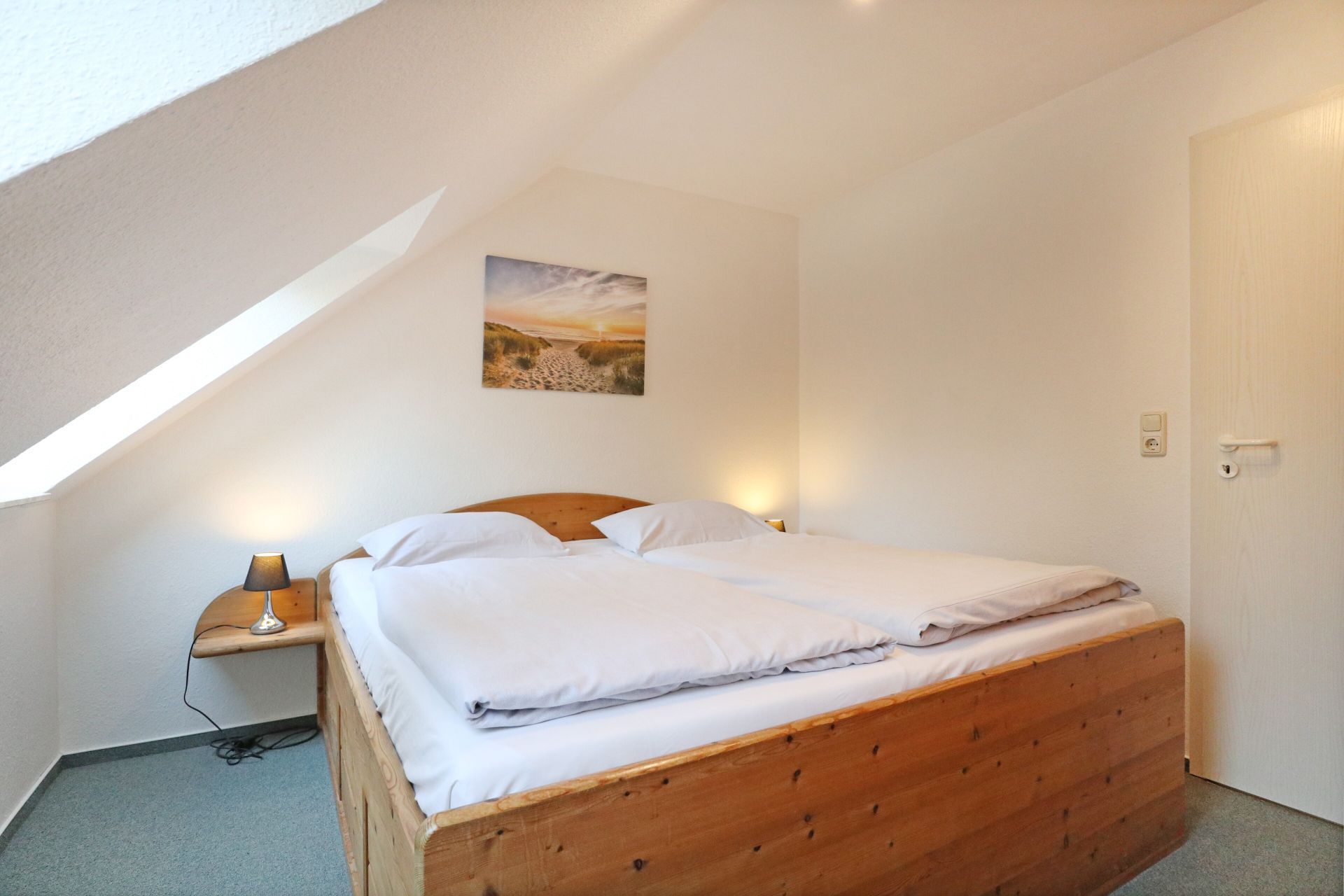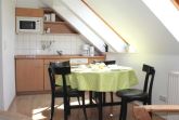 Im 2. Obergeschoss des Hauses empfängt Sie dieses gut ausgestattete 2- Zimmer Appartement mit einer Wohnfläche von 39qm. Mit bis zu 4 Personen können Sie in dieser Wohnung gut und günstig Ihren Urlaub verbringen. Im Wohn-Essbereich befindet sich ein ausziehbares Sofa, das als zusätzliche Schlafmöglichkeit genutzt werden kann. Zwei sehr bequeme Sessel laden zum Entspannen ein. Zudem sind im Wohnraum ein Esstisch mit 4 Stühlen sowie Fernseher und Radio vorhanden. Die in den Wohnbereich integrierte Pantryküche ist ausgestattet mit: Kochfeld, Mikrowelle, Kühlschrank mit Frostfach, Spülmaschine, Kaffeemaschine, Wasserkocher, Toaster usw. Das Schlafzimmer ist mit einem Doppelbett und Kleiderschrank ausgestattet.