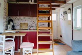 Über eine Leiter erreichen Sie den Schlafbereich im Spitzdach.