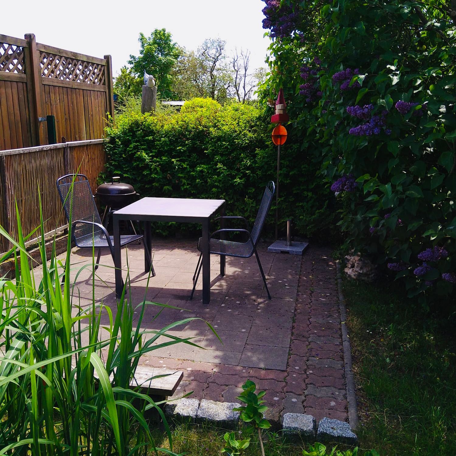 Terrasse mit Gartenmöbeln, Grillmöglichkeit und Feuerschale