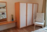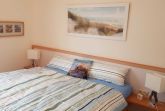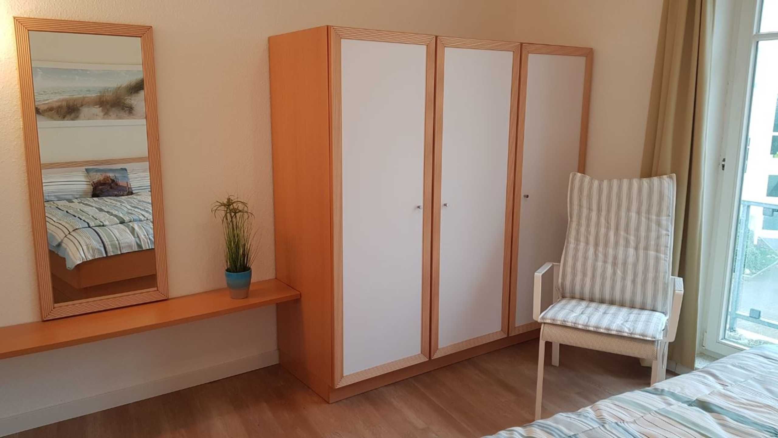Das freundliche Schlafzimmer hat 1 Doppelbett, einen geräumigen Kleiderschrank sowie einen Ankleidespiegel mit Ablage.